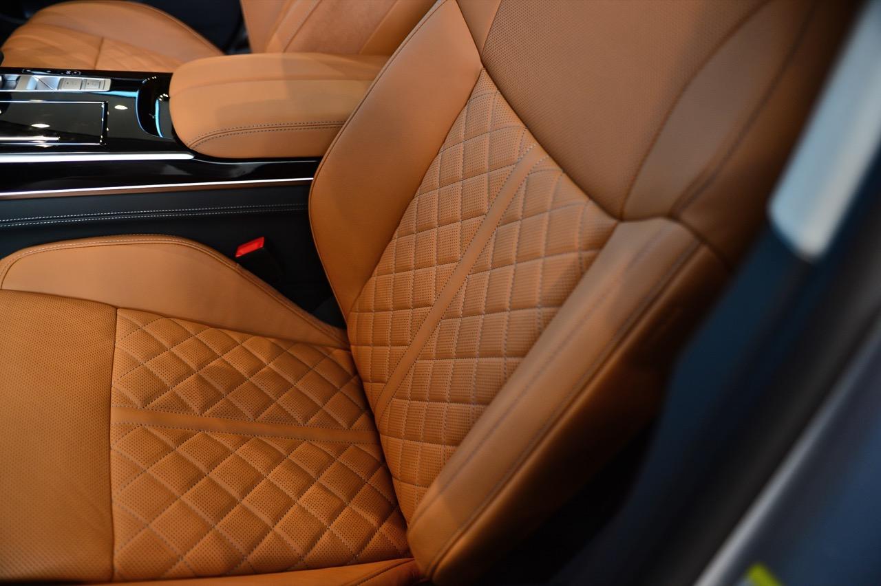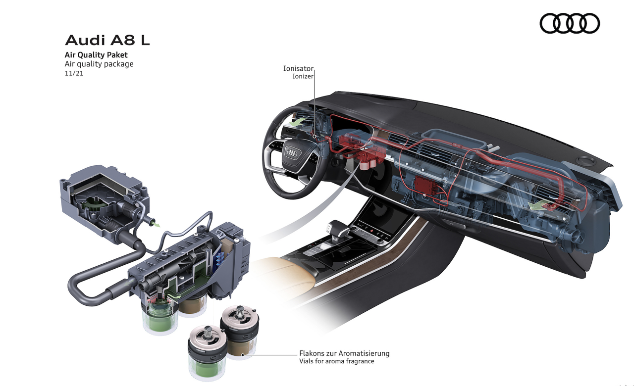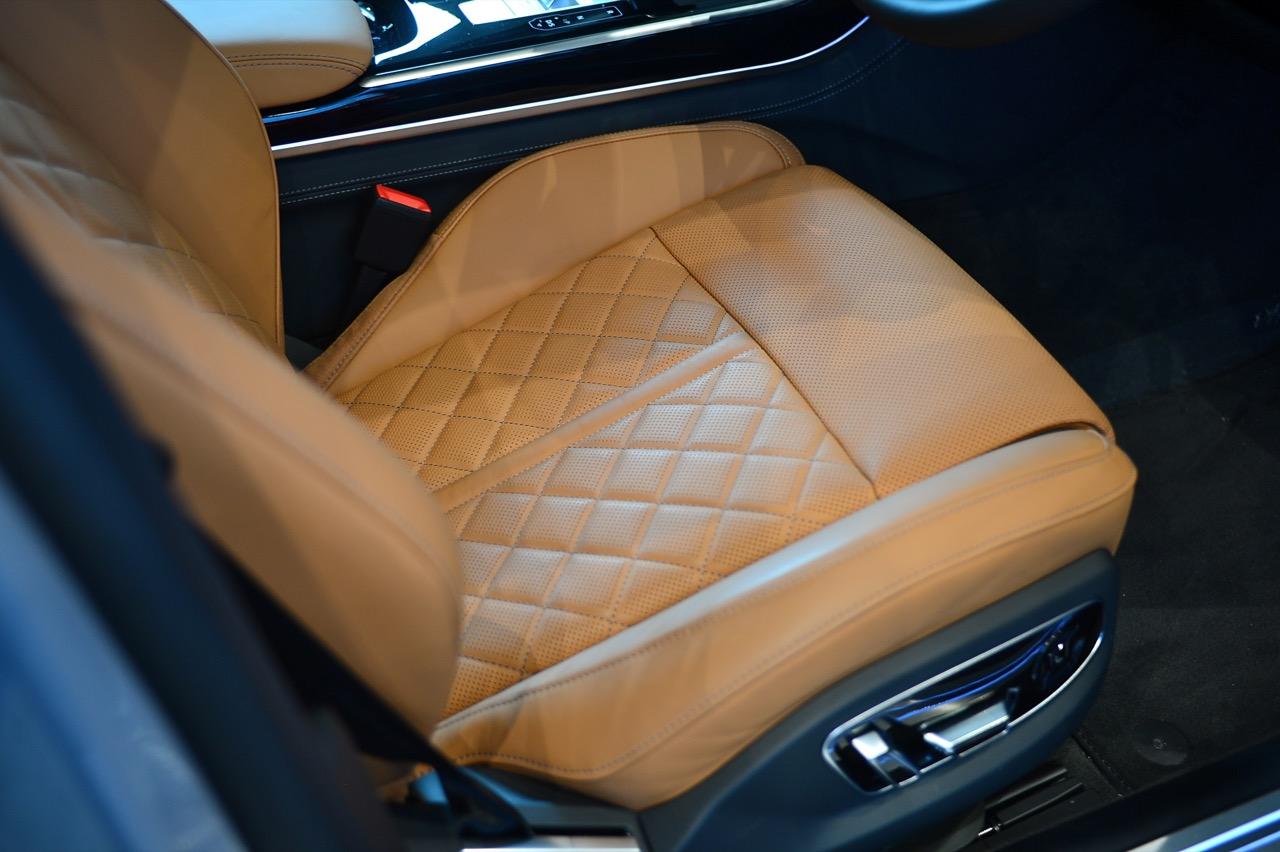 การเจาะรูอย่างแม่นยำบนหนังที่ใช้หุ้มเบาะ, ม่านบังแสงเปิดและปิดด้วยไฟฟ้า, ช่องแอร์บริเวณเสากลาง ผ้ากำมะหยี่ที่นุ่มสบาบบนพนักพิงศีรษะ เบาะนั่งหุ้มด้วยหนัง Valcona สีน้ำตาลคอนยัค วัสดุไมโครไฟเบอร์ Dinamica สีขาวหุ้มบริเวณขอบเสาหน้า กลาง หลัง และเพดานรถทั้งหมด ลักษณะเฉพาะของ A8 ที่ได้รับการปรับปรุงใหม่ก็คือ การกำหนดค่าโทนสีภายในที่มีให้เลือกตามใจลูกค้า รวมถึงการออกแบบของ Audi ในสีเงินพาสเทล และภายใน S line สีดำ สีแดงเมอร์โลต์ หรือคอนญัก แพ็กเกจเครื่องหนังและอุปกรณ์เครื่องหนังหลายรายการจาก Audi Exclusive เป็นออปชันเสริมราคาแพงที่มีให้เลือกมากมาย พร้อมแพ็กเกจระบบเสริมคุณภาพอากาศด้วยเครื่องสร้างประจุไอออน และกลิ่นหอมที่ทำให้สดชื่น