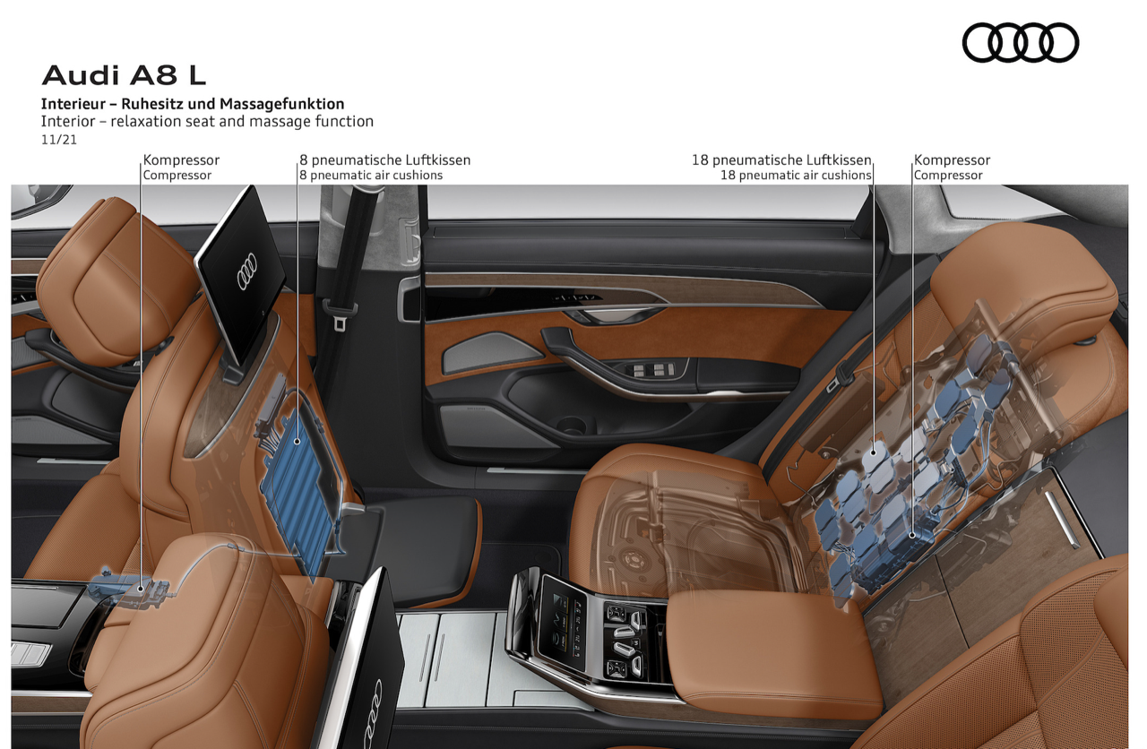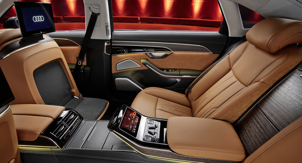 ภายในของ A8 คล้ายห้องรับแขกที่มีการปรับแต่งให้กว้างและโปร่งโล่ง ชุดไฟ Ambient Light Plus ตกแต่งภายในห้องโดยสารด้วยการเรืองแสงอย่างหรูในยามค่ำคืน ไฟอ่านหนังสือที่ด้านหลังก็ยังใช้เทคโนโลยี Matrix LED เบาะนั่งและอุปกรณ์ของเบาะใน A8 รุ่นปรับปรุง ถูกเน้นด้านความหลากหลายของการใช้งาน การปรับท่านั่งที่ครอบคลุม ทำให้การควบคุมรถ หรือนั่งโดยสารทำได้อย่างสบายตัว โดยเฉพาะเบาะหลังซึ่งมีออปชันเสริมให้เลือก ที่นั่งพักผ่อนใน A8 L4 ถือเป็นจุดสุดยอดของโปรแกรมการพัฒนายานยนต์ลีมูซีนระดับบน มีที่วางเท้าที่ด้านหลังของเบาะผู้โดยสาร สามารถเปิดใช้งานเพื่อให้ความอบอุ่น และนวดฝ่าเท้าได้หลายระดับ แพ็กเกจที่นั่งพักผ่อน ประกอบด้วยการนวดหลังพร้อมเบาะรองนั่งแบบนิวแมติก กับระบบนวด 18 ตำแหน่ง พนักพิงศีรษะปรับด้วยไฟฟ้า แดชบอร์ด และคอนโซลกลางเชื่อมต่อกันอย่างกลมกลืนกับจอภาพและช่องแอร์ ระบบปรับอากาศอัตโนมัติแบบดีลักซ์สี่โซน หน้าจอแบบใหม่ที่ด้านหลัง ตู้เย็นสำหรับแช่เครื่องดื่ม (ออปชันเสริม) รวมถึงช่องวางเครื่องดื่มพวกขวดแชมเปญ ควบรวมอยู่ในโปรแกรมตกแต่งพิเศษของ Audi ที่เน้นความสะดวกสบายในสภาพแวดล้อมที่วุ่นวายของเมืองหลวง