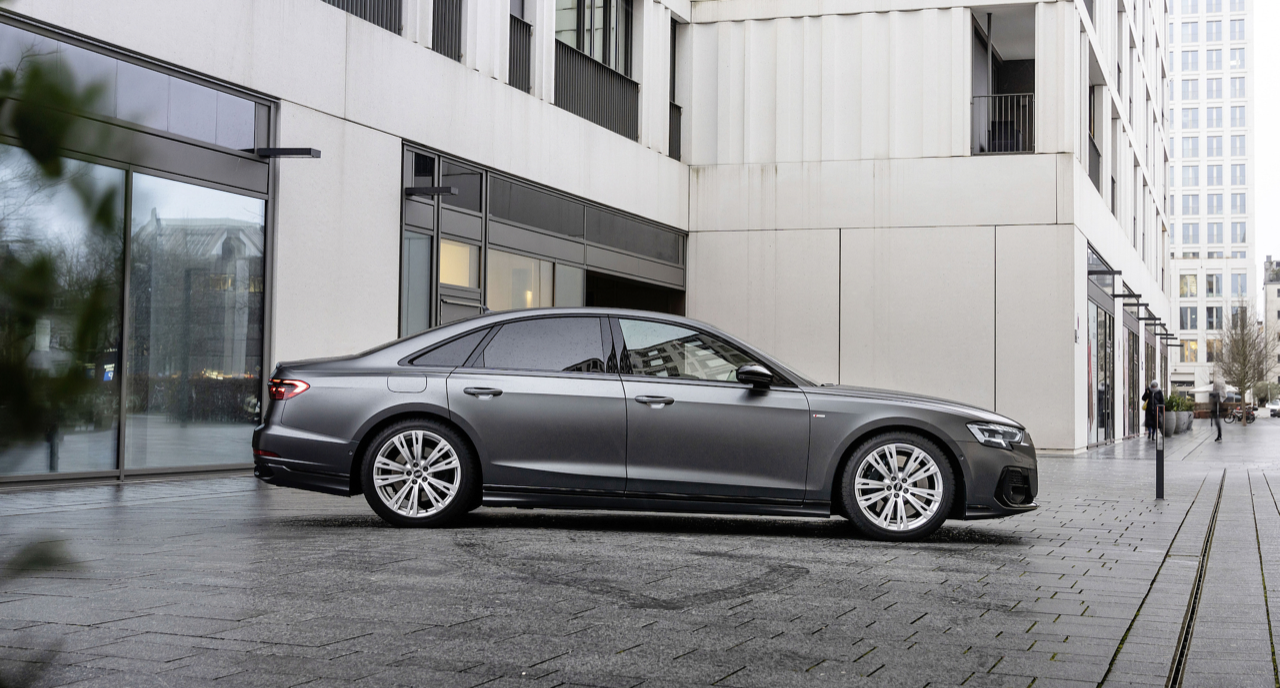 มุมมองด้านข้างมีบุคลิกของรถซาลูนหรูดูสะดุดตาด้วยวัสดุสีเงินกับล้ออัลลอยเงาแวววาว โดมหลังคาแบนราบ เส้นสายที่เหยียดยาวบริเวณด้านข้าง โดยเฉพาะเส้นข้างด้านบน ช่วยเน้นขนาดความยาวของตัวถัง ส่วนโค้งของซุ้มล้อกว้างขึ้น บ่งบอกถึงระบบขับเคลื่อน Quattro Ultra เส้นด้านข้างตัวถังที่คมชัด ลากจากแก้มข้างไปสุดที่มือจับที่เปิดบานประตูหลัง บั้นท้ายมาพร้อมไฟท้าย OLED แบบใหม่ เชื่อมต่อไฟท้ายทั้งสองฝั่งด้วยเส้นโครเมียม ไฟท้ายปรับแต่งการส่องสว่างได้เฉพาะตัวด้วยเทคโนโลยี OLED ควบคุมการทำงานด้วยระบบดิจิตอล แถบไฟภายในแบ่งส่วนที่เชื่อมต่อกันให้มุมมองที่ลึกและชัดเจน ดิฟฟิวเซอร์ที่กันชนหลัง Audi A8 60TFSI e มีช่องรับอากาศที่ปรับการไหลให้เหมาะสมภาย ท่อท้ายปลอมทรงเหลี่ยมที่ตกแต่งอยู่ด้านนอกใต้กันชนหลัง ส่วนท่อจริงนั้นซ่อนอยู่ข้างในและถูกปิดบังเอาไว้ด้วยกันชนหลังทรงหรู เป็นรายละเอียดการออกแบบสไตล์สปอร์ตที่เป็นเอกลักษณ์อย่างหนึ่งของ Audi