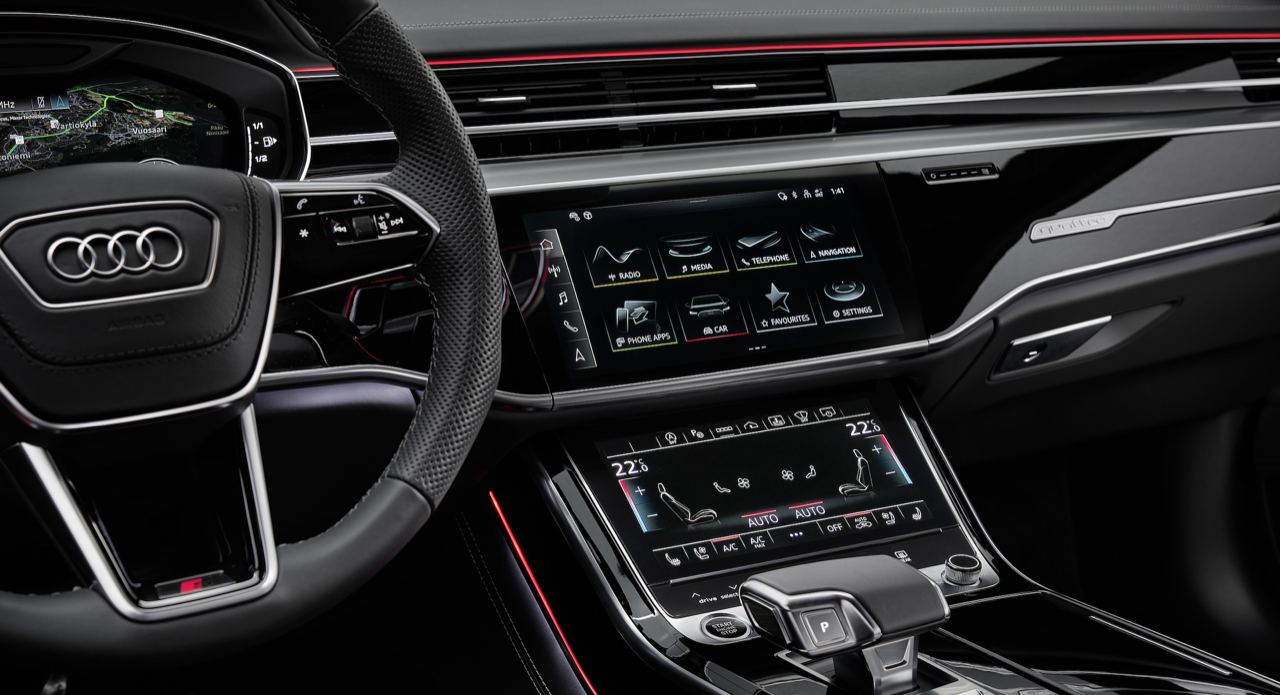 MMI Navigation plus เป็นอุปกรณ์มาตรฐานใน Audi A8 60TFSI e เชื่อมโยงกับระบบ Infotainment แบบโมดูลาร์รุ่นที่สาม (MIB 3) A8 PHEV ยังติดตั้งหน้าจอแบบใหม่ที่ด้านหลัง จอภาพปรับแต่งขนาดให้เหมาะกับการใช้งาน ตามความคาดหวังของผู้โดยสารเบาะหลังในปัจจุบัน ด้วยจอแสดงผลขนาด 10.1 นิ้ว จำนวน 2 จอ ความละเอียดระดับ Full HD ติดอยู่ที่ด้านหลังของเบาะหน้า จอภาพแสดงเนื้อหาจากอุปกรณ์ของผู้โดยสาร สามารถรับสตรีมเสียง และวิดีโอผ่านการแคสต์ รวมถึงจากแพลตฟอร์มสตรีมมิง หรือไลบรารีสื่อทีวี