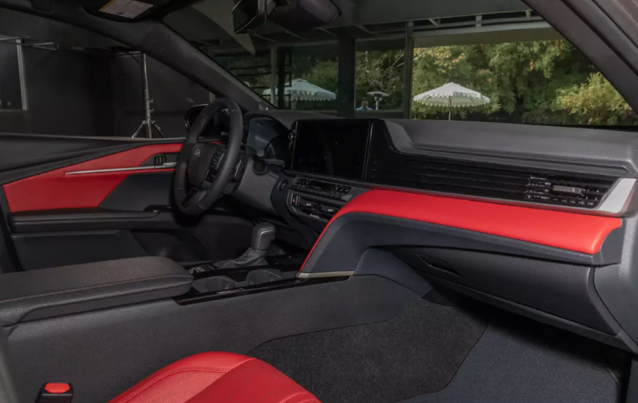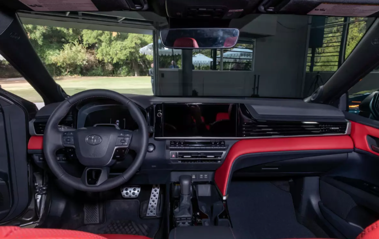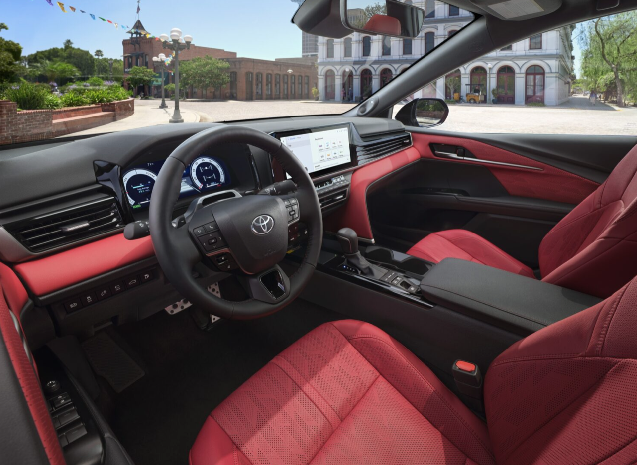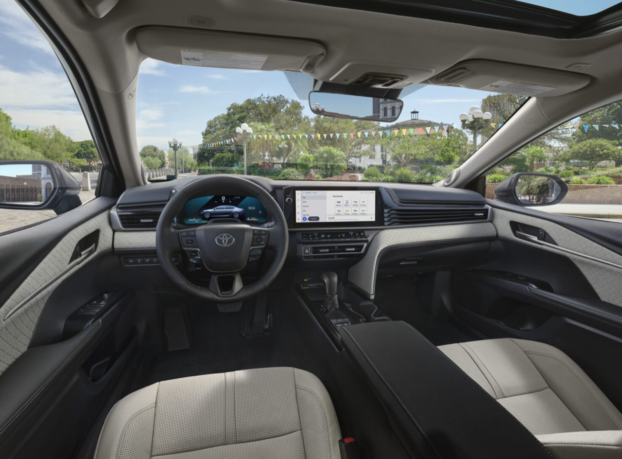 แผงหน้าปัดของ New Camry ขยายขนาดจอภาพให้ตรงกับความต้องการ เพื่อให้เหมาะกับการจัดเรียงมาตรวัด ส่วนหน้าจอมอนิเตอร์กลางระบบสัมผัสจัดฟังก์ชั่นใหม่ให้ใช้มากกว่าเดิม พวงมาลัยทรงสามก้านแบบสปอร์ตหุ้มหนังแท้ที่ปรับให้นุ่มขึ้น ปุ่มมัลติฟังก์ชั่นที่ก้านวงทั้งด้านซ้ายและขวา สั่งงานรับหรือวางโทรศัพท์บูลทูธ ปรับระดับเสียงลำโพง ปุ่มสั่งงานด้วยเสียง ปุ่มควบคุมและระบบปรับตั้งความเร็วอัตโนมัติ Adaptive Cruise Control แบบ All Speed การปรับชิ้นส่วนต่างๆ มีเพิ่มเติมเข้ามา เช่น แถบของปุ่มทางด้านซ้ายพวงมาลัยและรอบๆ คันเกียร์ แผงควบคุมระบบปรับอากาศใช้ปุ่มรูปทรงเก๋ไก๋ขนาดเล็ก กระจายอยู่บนแผงสามเหลี่ยม สำหรับชิ้นส่วนที่ใหญ่ขึ้นซึ่งตอนนี้อัดแน่นกันเป็นแถวแนวนอน Toyota บอกว่า ทั้งหมดทั้งปวงเป็นงานออกแบบที่คำนึงถึงหลักสรีรศาสตร์การใช้งานของมนุษย์ในรถยนต์นั่งส่วนบุคคล New Camry ระดับเริ่มต้นรุ่น LE และ SE จะมีจอภาพมาตรวัดดิจิทัลขนาด 7.0 นิ้ว และหน้าจอมอนิเตอร์กลางระบบสัมผัสขนาด 8.0 นิ้ว ในขณะที่รุ่นสูงกว่าอย่าง XLE และ XSE ติดตั้งจอกลางขนาด 12.3 นิ้ว