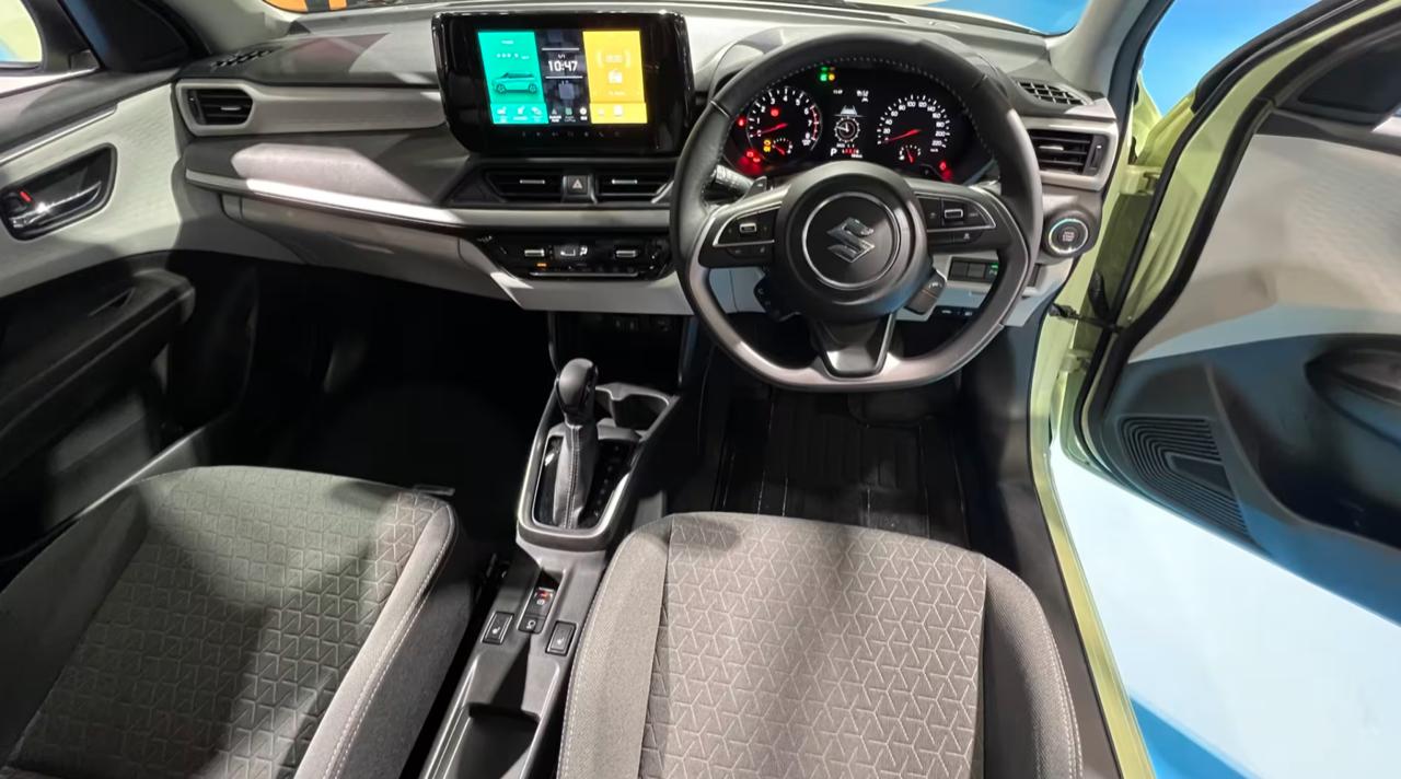 ภายในมีเค้าโครงของแดชบอร์ด คอนโซล แผงหน้าปัด ที่ปรับปรุงใหม่หมด หน้าจอมอนิเตอร์กลาง สั่งงานด้วยระบบสัมผัส ขนาด 9 นิ้ว เป็นจอภาพแบบใหม่ มาพร้อมระบบสาระบันเทิง แน่นอนว่าต้องเชื่อม Apple CarPlay และ Android Auto แบบไร้สาย ชุดสวิตช์ควบคุมระบบปรับอากาศภายในห้องโดยสาร และพอร์ตชาร์จ USB ด้านล่าง แผงหน้าปัดมาตรวัดแบบใหม่ แต่พวงมาลัยและคันเกียร์จะดูคล้ายกับ Swift โฉมปัจจุบัน พวงมาลัยสามก้านแบบสปอร์ต มีสวิตช์มัลติฟังก์ชั่น กับแป้นเปลี่ยนตำแหน่งเกียร์ Paddle Shift