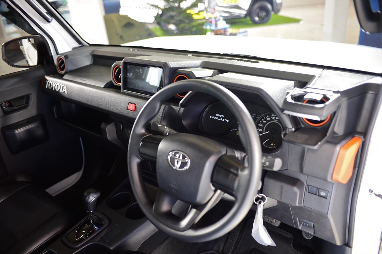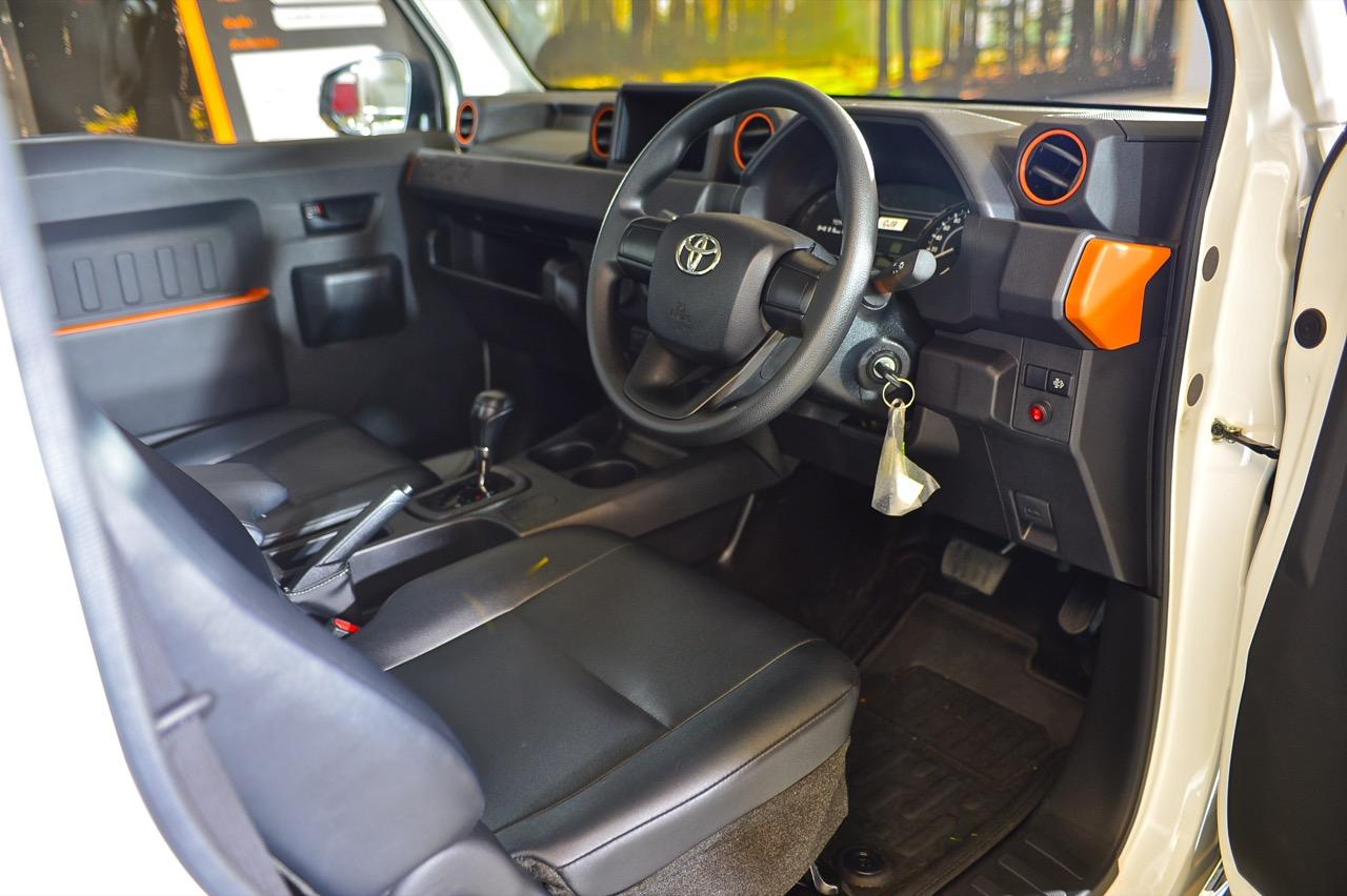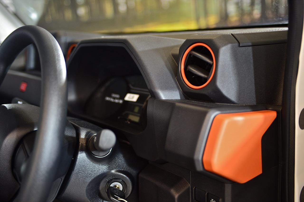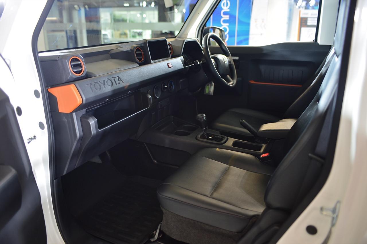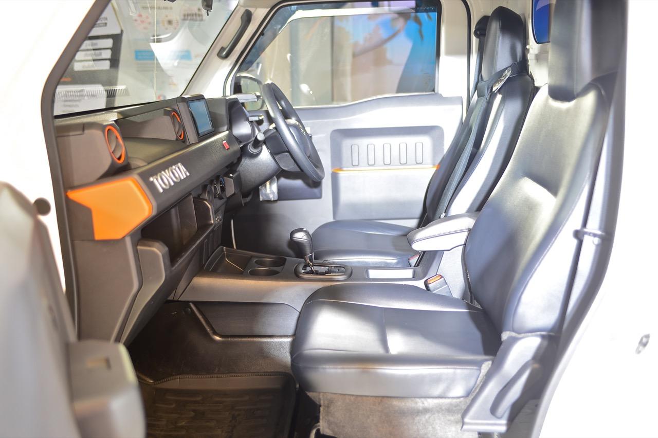 ภายในของ Hilux Champ เรียบง่าย มีแค่อุปกรณ์เท่าที่จำเป็น เบาะหนังสังเคราะห์ดีไซน์แยกกันทั้งคนขับและผู้โดยสาร เบาะปรับเอนได้ เพื่อเพิ่มความสะดวกสบาย แดชบอร์ดคอนโซล ใช้พลาสติกหล่อขึ้นรูปโดยออกแบบแดชบอร์ดใหม่หมด ทรงเหลี่ยมๆ ของแดชบอร์ดเหมาะกับรูปแบบรถกระบะ โดยเฉพาะชิ้นส่วนพลาสติกสีส้มที่ตกแต่งอยู่แถวแผงประตู กรอบช่องแอร์ และบริเวณมุมของแดชบอร์ด พวงมาลัยทรงสามก้านหุ้มไวนิล ที่เสียบกุญแจแบบบิดสตาร์ต Toyota ออกแบบด้านบนของแดชบอร์ดให้มีกล่องสำหรับใส่จอภาพขนาด 7 นิ้ว พร้อมสายเชื่อมต่อที่รอเสียบ สามารถนำไปใส่จอภาพพร้อมระบบอินโฟเทนเมนต์ที่มีขายตามร้านเครื่องเสียงได้ ซุ้มเกียร์เรียบๆ มีช่องวางแก้วน้ำให้สองช่อง คันเบรกมือและคันเกียร์กับร่องเกียร์แบบ sequential shift ในรุ่นเกียร์อัตโนมัติ 6 สปีด สวิตช์ไฟฉุกเฉินลอยอยู่กลางแดชบอร์ดดูแปลกประหลาด ปุ่มควบคุมระบบปรับอากาศภายในห้องโดยสารแบบบิดหรือหมุนที่ทนทาน ใช้งานง่าย ไม่สวยเท่าจอควบคุมแอร์ดิจิทัล ต่ำลงมาเป็นช่องเสียบ USB Type C สองช่อง กึ่งกลางของเบาะโดยสารมีพนักเท้าแขนที่ออกแบบให้เป็นกล่องเก็บของกระจุกกระจิกไปในตัว