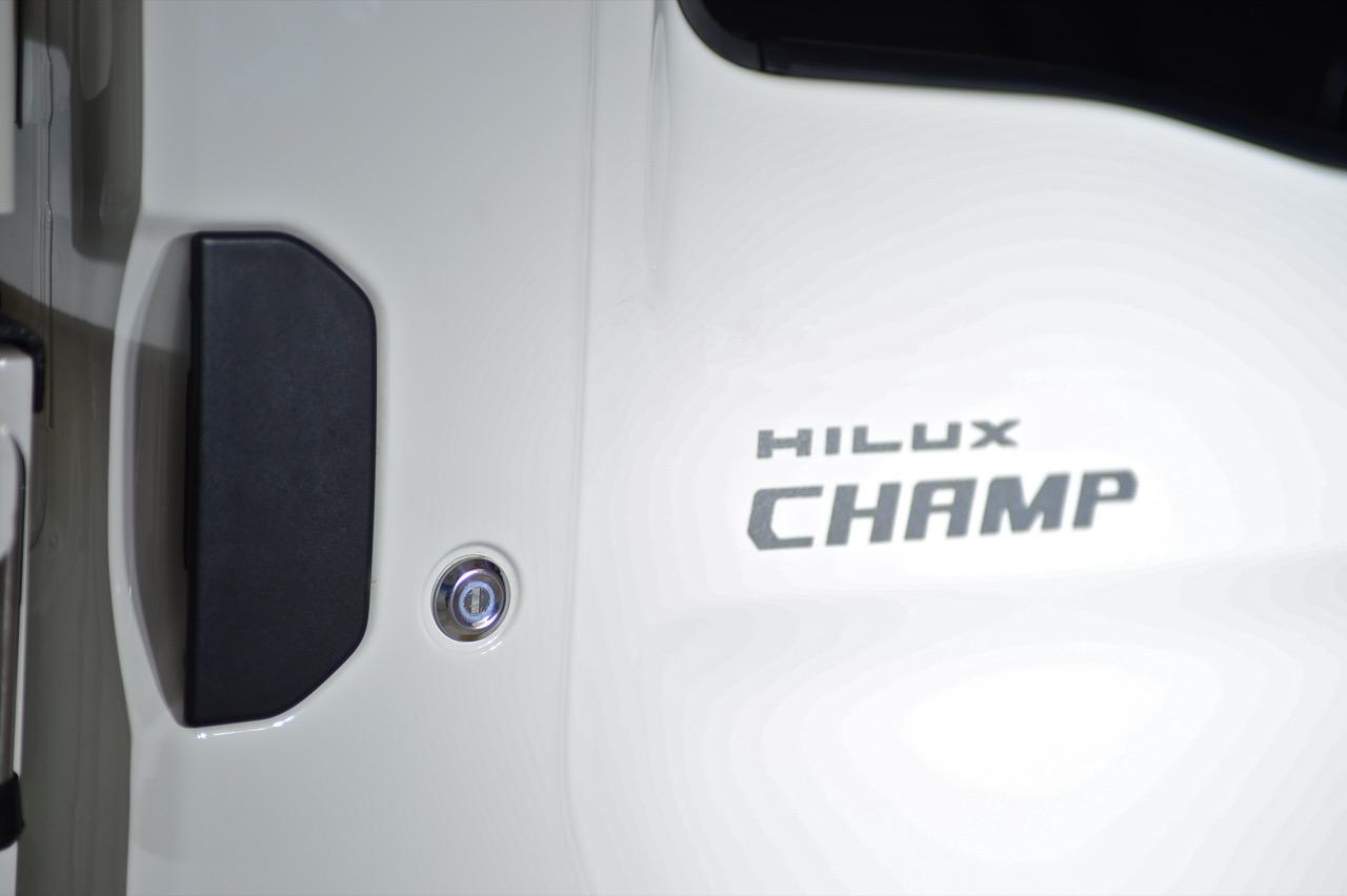 Toyota Hilux Champ มีหน้าตาที่เข้าที คล้ายกับ Land Cruiser 70 ผสมพันธุ์กับรถจี๊ป ไฟหน้า LED ทรงเหลี่ยม กระจังหน้าพลาสติกสีดำเจาะรูพรุน จุดที่มีความสมดุลของด้านหน้าใน Hilux Champ ก็คือทรงของแก้มข้างและฝากระโปรงหน้ากับซุ้มล้อ เสาหน้าขนาดใหญ่ บานประตูทรงเหลี่ยมและล้อกระทะเหล็กขนาด 14 นิ้ว กระบะท้ายขนาดใหญ่ เปิดออกได้ทั้งสามทิศทาง (ด้านข้าง ซ้าย-ขวาและฝาท้าย) ฝากระบะท้ายแปะตัวอักษร Toyota ที่คุ้นเคย ไฟท้ายทรงสี่เหลี่ยมเหมือนไปยกเอาไฟท้ายของรถ 6 ล้อ มาใส่ Champ เป็นกระบะที่แสดงให้โลกเห็นว่า ทำอย่างไรให้ได้รถสู้งานหนักขนาดเล็กที่มีราคาถูก เครื่องยนต์แข็งแกร่งทนทาน ตัวถังกระบะรองรับการใช้งานได้หลากหลาย เอาไปดัดแปลงเพื่อการใช้งานที่แตกต่างกันได้ง่าย มีหน้าตาที่ดูดี คล้ายกับรถ Jeep ช่วงล่างยกมาจาก Hilux REVO รุ่นหัวเดี่ยวที่รองรับงานหนัก จะใช้เดิมๆ หรือนำไปตกแต่งตามรูปแบบของ Carryboy ซึ่งมีให้เลือกทั้งรถตู้มอเตอร์โฮม หรือดัดแปลงเป็นรถบ้าน รถติดตั้งตู้ขนส่งสินค้า รถขายของเคลื่อนที่แบบสองด้าน รถแคมปิ้ง รถขายของเคลื่อนที่แบบน็อกดาวน์ รถขายกาแฟเคลื่อนที่ และรถตกแต่งเพื่อความสวยงาม Street Package