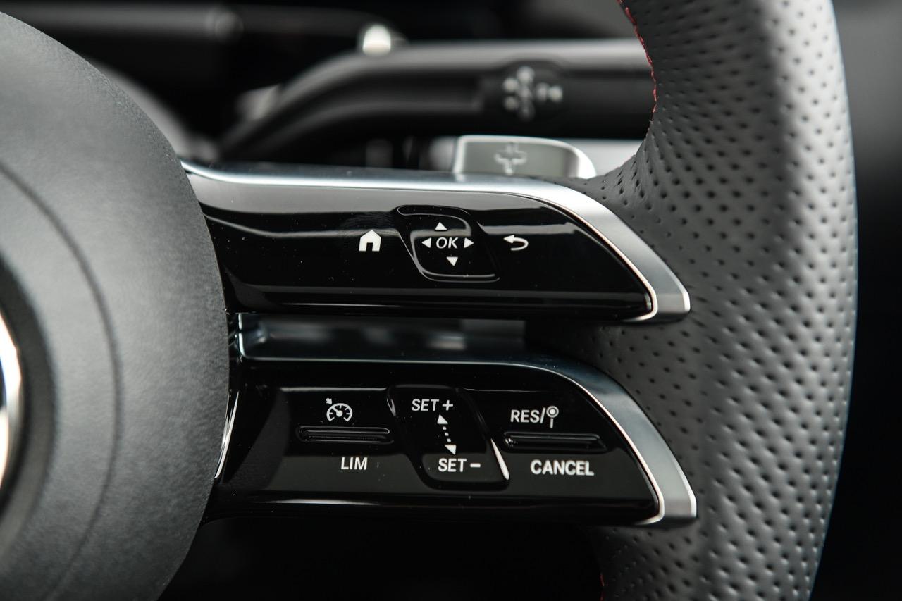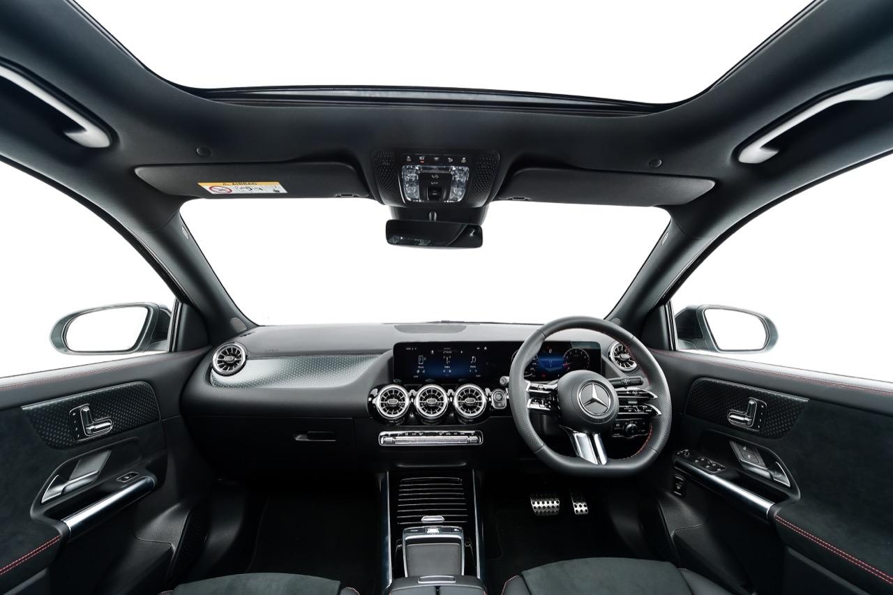 ภายในห้องโดยสาร ตกแต่งแบบ AMG Line Interior พวงมาลัยมัลติฟังก์ชันดีไซน์ใหม่สไตล์สปอร์ตหุ้มหนัง Nappa แผงหน้าปัดแดชบอร์ด แสดงข้อมูลการขับขี่แบบ All-digital instrument display เชื่อมต่อกับหน้าจอแสดงผลบริเวณคอนโซลกลางขนาด 10.25 นิ้ว เบาะนั่งแบบ Sport seats หุ้มหนัง ARTICO สลับกับ MICROCUT microfibre สีดำ ระบบควบคุมอุณหภูมิอัตโนมัติ THERMOTRONIC ใหม่แบบ 2 โซน ระบบชาร์จโทรศัพท์มือถือไร้สาย (Wireless charging) และระบบปรับรูปแบบการขับขี่ DYNAMIC SELECT