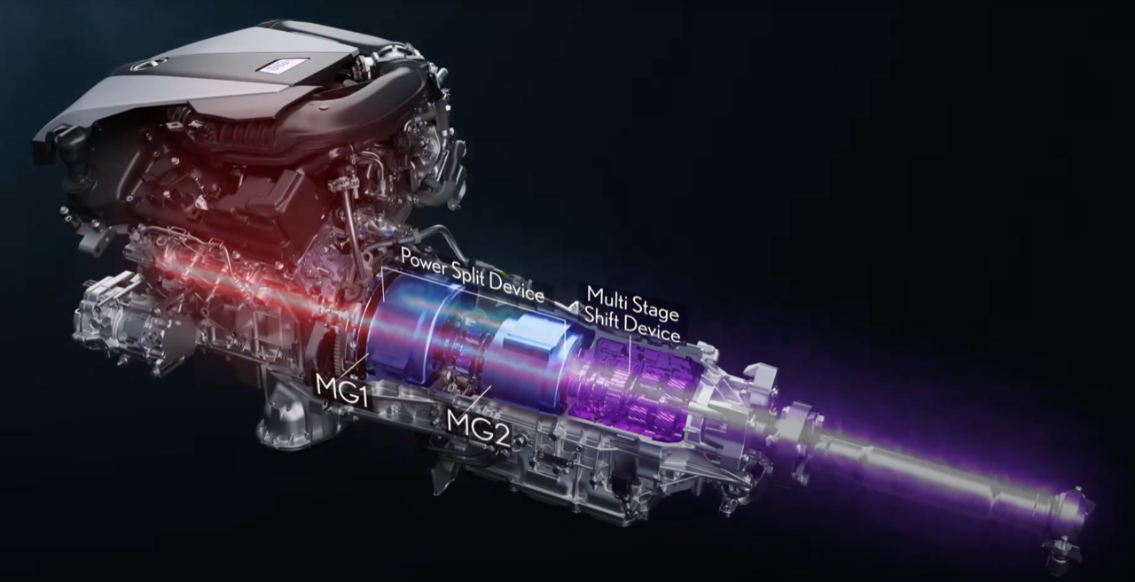 รถหรูหราราคาแพงอย่าง Lexus LC 500h Multi Stage Hybrid System ที่ผสมผสานพลังงานไฟฟ้าและเครื่องยนต์เบนซิน V6 เข้าไว้ในกระปุกเกียร์ e-CVT ถือเป็นระบบที่แตกต่างไปจาก CVT แบบเดิมอย่างสิ้นเชิง แทนที่จะใช้ระบบกรวยและสายพาน เกียร์ e-CVT ใน LC500h ใช้ชุดเกียร์ planetary gear set ที่รวมกำลังเครื่องยนต์เข้ากับมอเตอร์ไฟฟ้า เป็นข้อมูลเฉพาะมีความซับซ้อน สิ่งสำคัญก็คือ ระบบการทำงานมีความคล้ายคลึงกับ CVT ทั่วไป โดย e-CVT ช่วยให้เครื่องยนต์ทำงานด้วยรอบเครื่องที่เหมาะสมที่สุด สำหรับส่งถ่ายเอาต์พุตกำลัง ภายใต้ภาระกรรม หรือเพื่อชาร์จแบตเตอรี่ คุณสามารถเลือกอัตราทดเกียร์ได้อย่างมีประสิทธิภาพตามต้องการ และการทำงานแบบดั้งเดิมของ CVT ยังคงอยู่