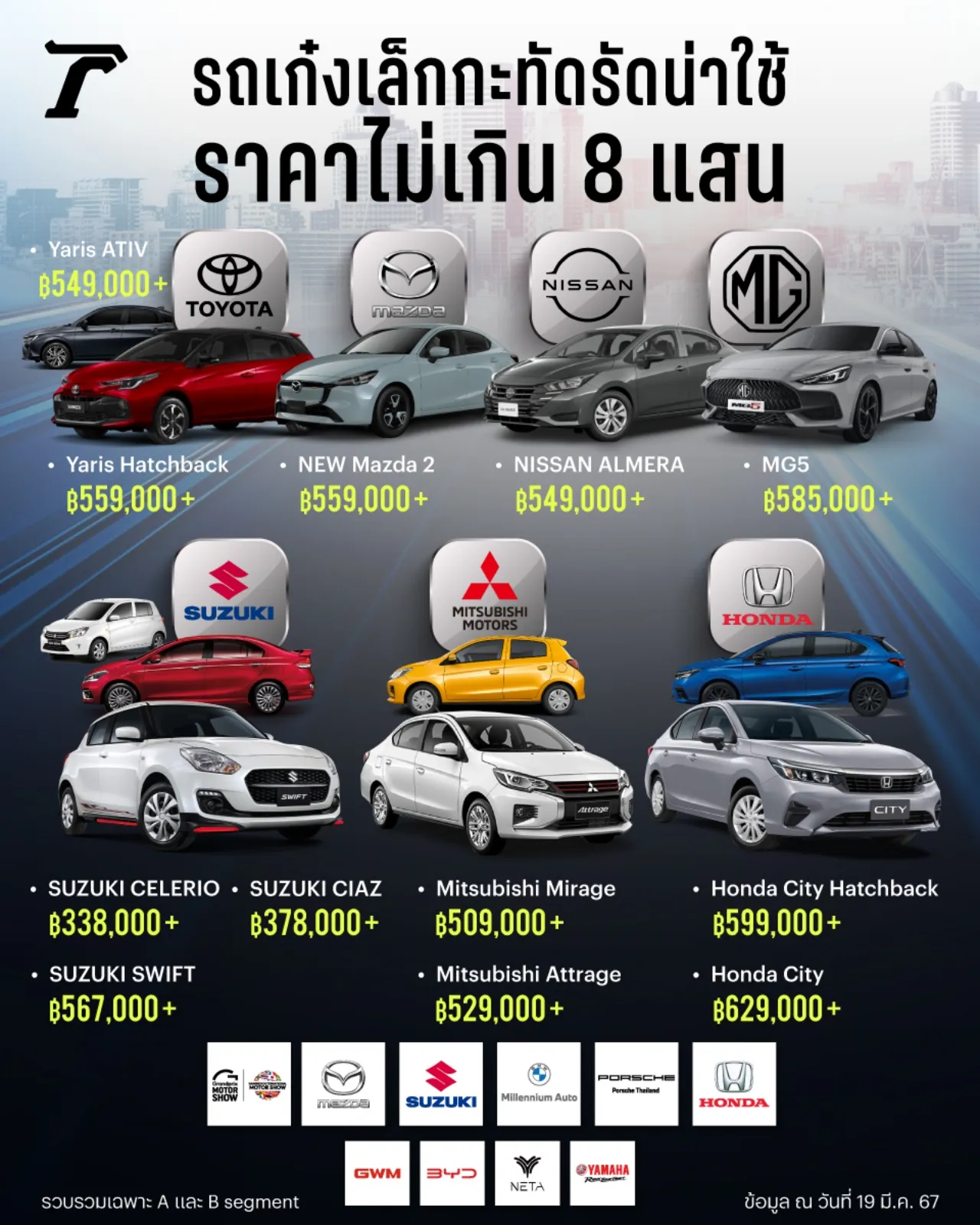"ทีมข่าวไทยรัฐออนไลน์" ขอแนะนำรถเก๋งขนาดกะทัดรัด ราคาไม่เกิน 800,000 บาท เผื่อเป็นทางเลือกให้กับผู้ที่กำลังมองหารถเก๋งระดับ A และ B segment เอาไว้ใช้งาน ไม่ว่าจะใกล้ หรือไกลก็ขับสนุกได้ไม่มีเบื่อ โดยมีรายละเอียดดังนี้
