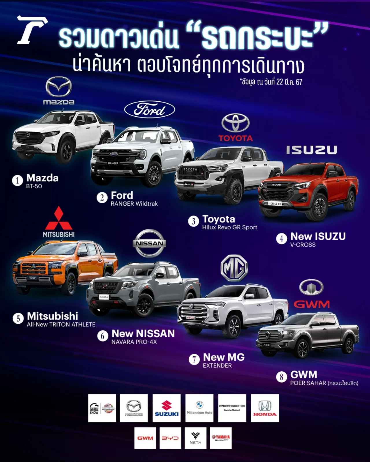 สำหรับรถกระบะที่น่าสนใจที่ "ทีมข่าวไทยรัฐออนไลน์" นำมาเสนอส่วนใหญ่จะเป็นรุ่นท็อปของรุ่นนั้นๆ และแถมท้ายด้วยรถกระบะไฮบริดที่กำลังเข้ามาทำตลาดในเดือน พ.ค. 67 นี้