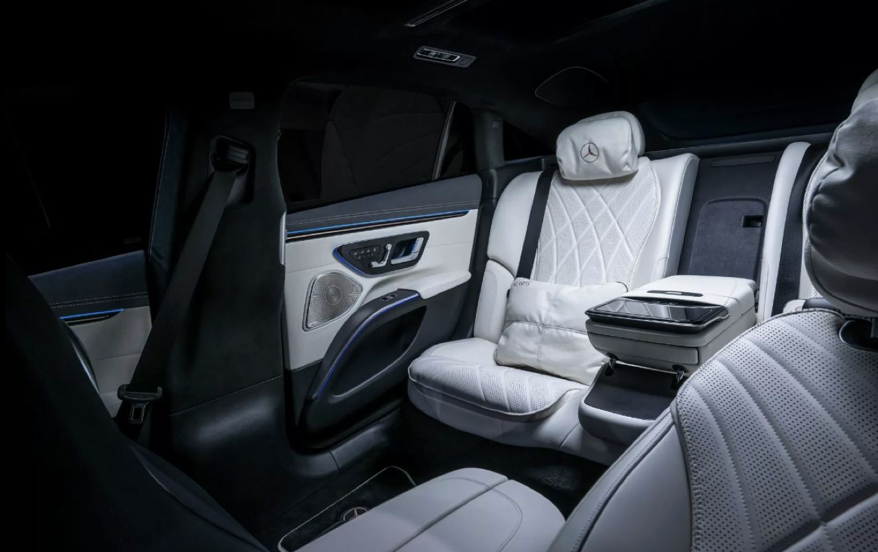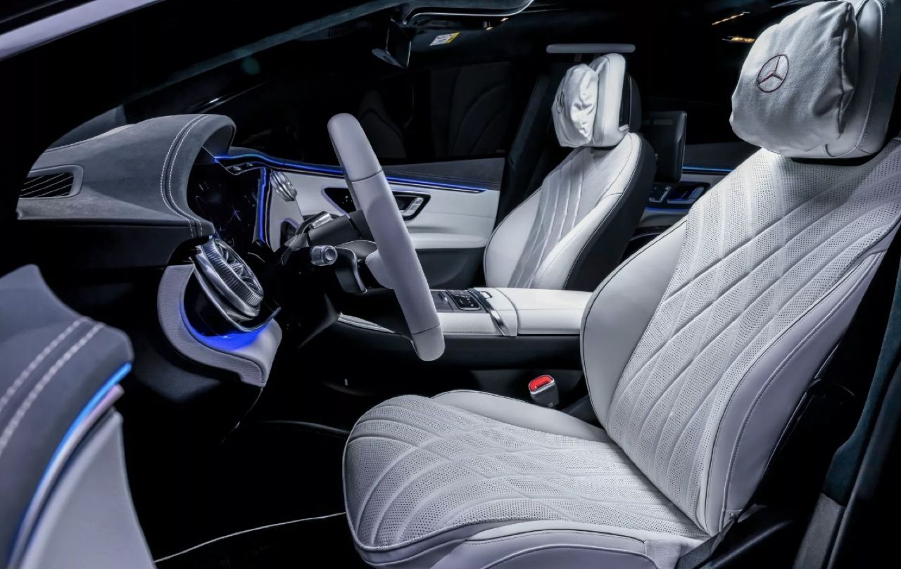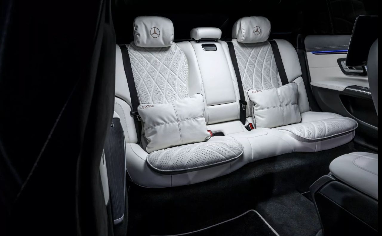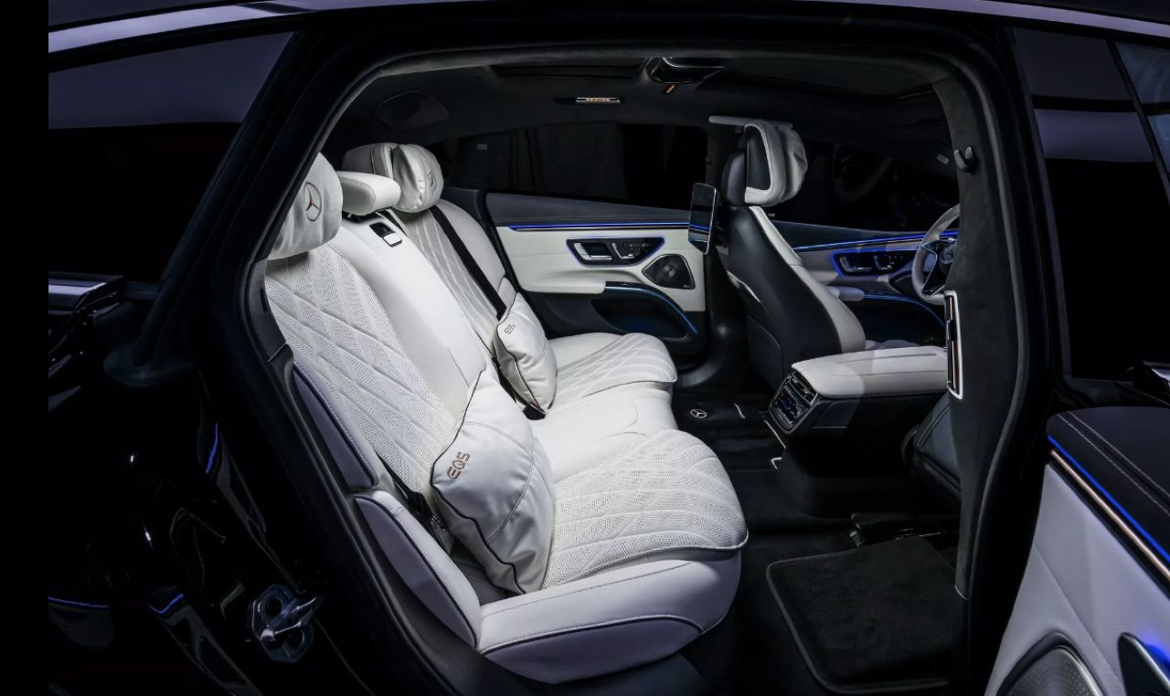 รถซาลูนไฟฟ้ารุ่นใหม่นี้มาพร้อมกับกันชนหน้า AMG Line แต่ที่สะดุดตากว่านั้นคือ รูปแบบของกระจังหน้าใหม่ที่มีลักษณะคล้ายกับ New S-Class แถบโครเมียมแบบฝังเรียบบนวัสดุเงาแวววาวสีดำ ลูกค้าเศรษฐีที่มองหางานตกแต่งที่ภูมิฐานลงตัวกับความสะดวกสบายสูงสุดของตำแหน่งเบาะผู้โดยสารตอนหลัง มีชุดตกแต่ง Pinnacle เป็นแพ็กเกจเสริมงานตกแต่งภายในสำหรับผู้บริหาร เพิ่มเบาะนั่งผู้โดยสารด้านหน้าที่สามารถเอนไปข้างหน้าได้เพื่อเพิ่มพื้นที่วางขาของแถวที่สอง พนักพิงด้านหลังปรับเอนได้ถึง 38 องศา ในขณะที่ผู้โดยสารด้านหลังมาพร้อมกับเบาะอุ่นหรือเย็นบริเวณก้น คอ และไหล่ แพ็กเกจนี้ยังรวมถึงเบาะหลัง พร้อมระบบปรับลมและแถบเรืองแสงที่ด้านหลังของเบาะคู่หน้า