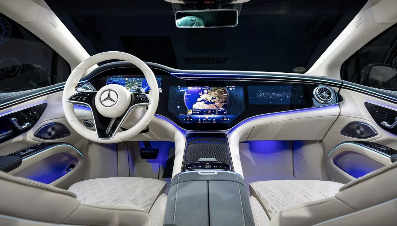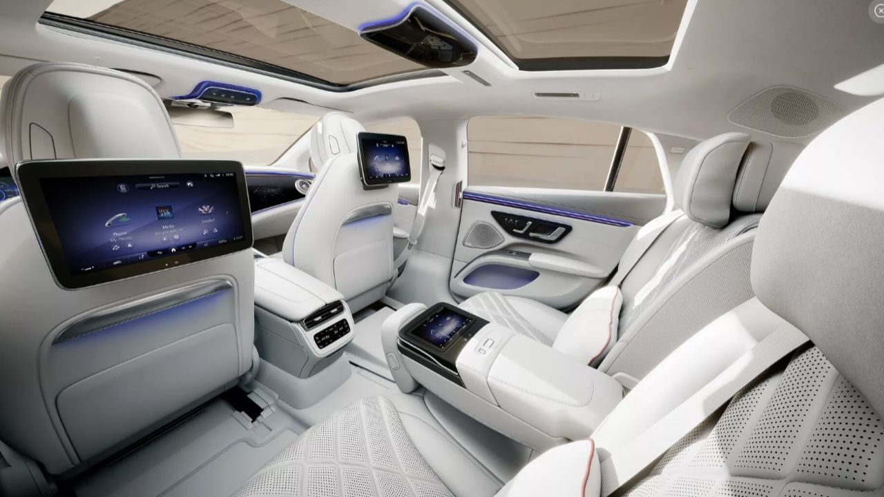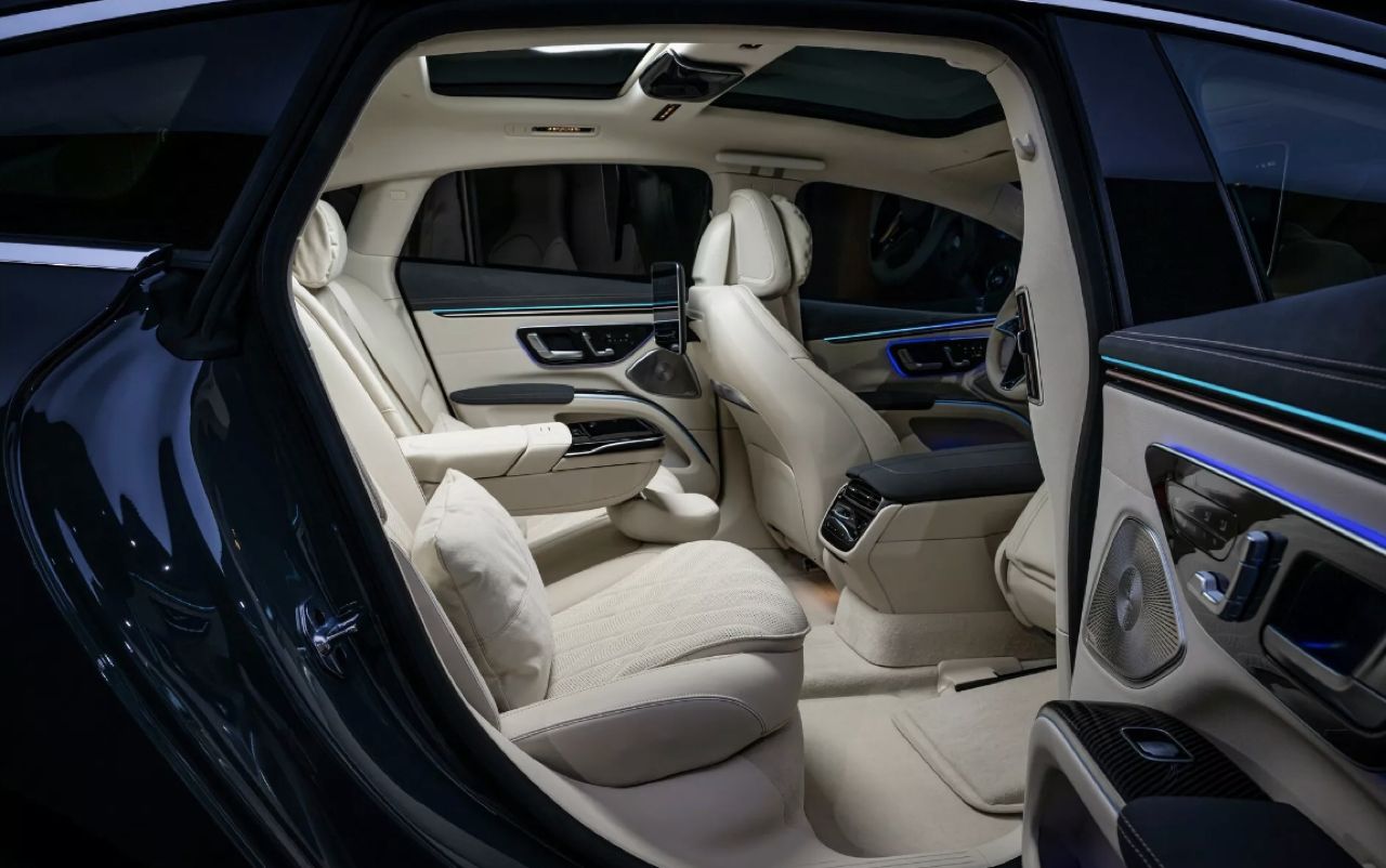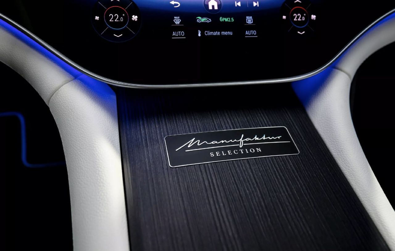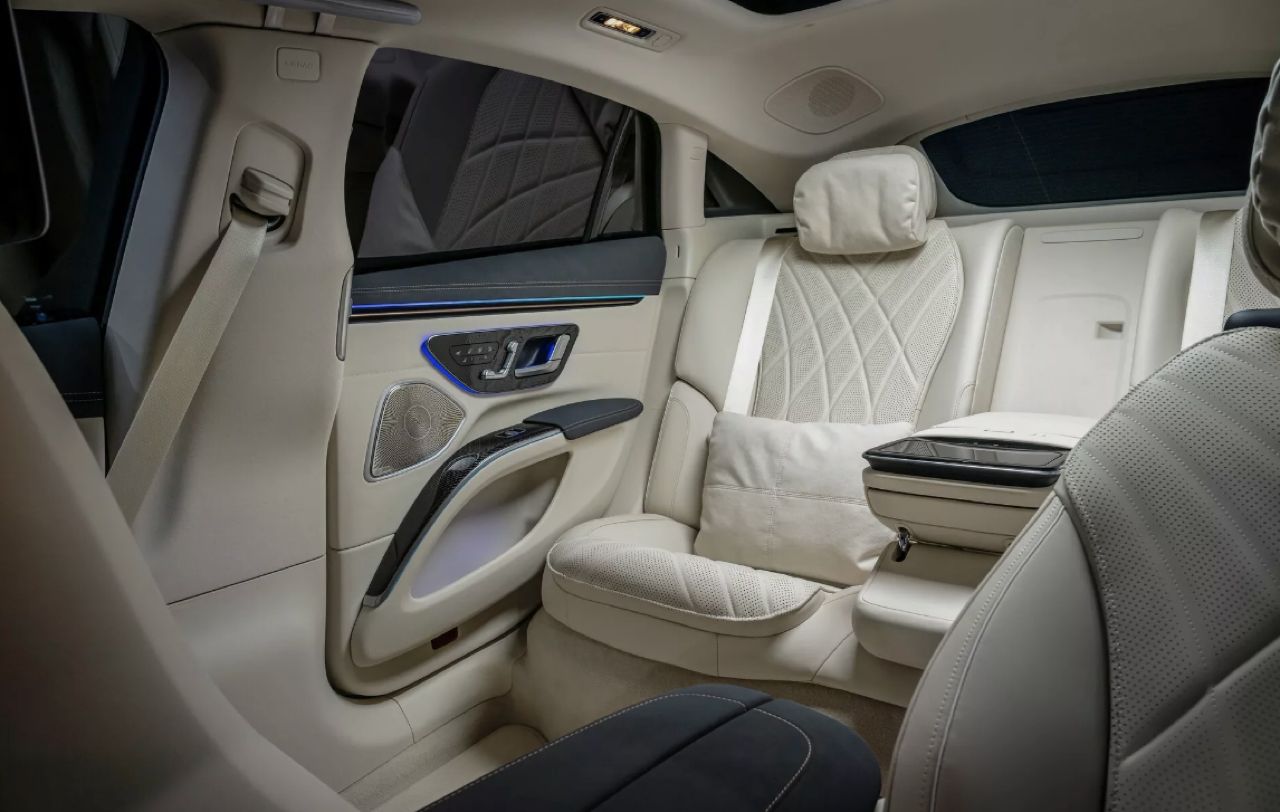 รถซาลูนไฟฟ้ารุ่นใหม่นี้มาพร้อมกับกันชนหน้า AMG Line แต่ที่สะดุดตากว่านั้นคือ รูปแบบของกระจังหน้าใหม่ที่มีลักษณะคล้ายกับ New S-Class แถบโครเมียมแบบฝังเรียบบนวัสดุเงาแวววาวสีดำ ลูกค้าเศรษฐีที่มองหางานตกแต่งที่ภูมิฐานลงตัวกับความสะดวกสบายสูงสุดของตำแหน่งเบาะผู้โดยสารตอนหลัง มีชุดตกแต่ง Pinnacle เป็นแพ็กเกจเสริมงานตกแต่งภายในสำหรับผู้บริหาร เพิ่มเบาะนั่งผู้โดยสารด้านหน้าที่สามารถเอนไปข้างหน้าได้เพื่อเพิ่มพื้นที่วางขาของแถวที่สอง พนักพิงด้านหลังปรับเอนได้ถึง 38 องศา ในขณะที่ผู้โดยสารด้านหลังมาพร้อมกับเบาะอุ่นหรือเย็นบริเวณก้น คอ และไหล่ แพ็กเกจนี้ยังรวมถึงเบาะหลัง พร้อมระบบปรับลมและแถบเรืองแสงที่ด้านหลังของเบาะคู่หน้า
