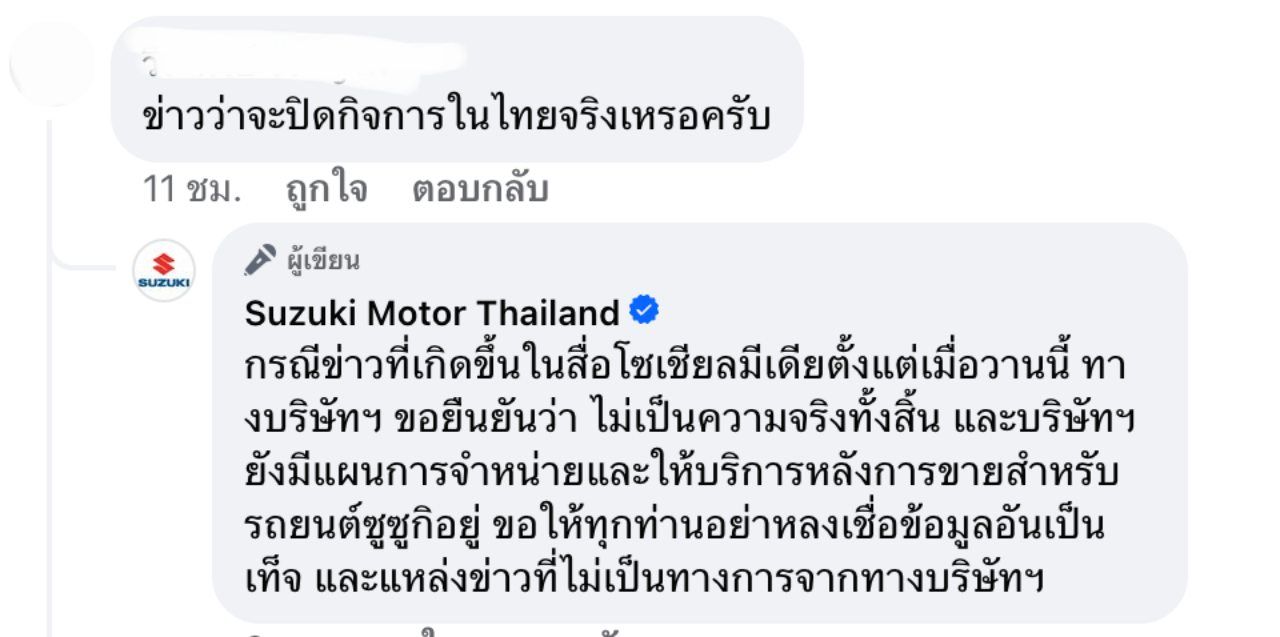 ล่าสุด Suzuki Motor Thailand ได้ออกมาชี้แจงเบื้องต้นว่า กรณีข่าวที่เกิดขึ้นในสื่อโซเชียลมีเดียตั้งแต่เมื่อวานนี้ ทางบริษัทฯ ขอยืนยันว่า ไม่เป็นความจริงทั้งสิ้น และบริษัทฯ ยังมีแผนการจำหน่ายและให้บริการหลังการขายสำหรับรถยนต์ซูซูกิอยู่ ขอให้ทุกท่านอย่าหลงเชื่อข้อมูลอันเป็นเท็จ และแหล่งข่าวที่ไม่เป็นทางการจากทางบริษัทฯ