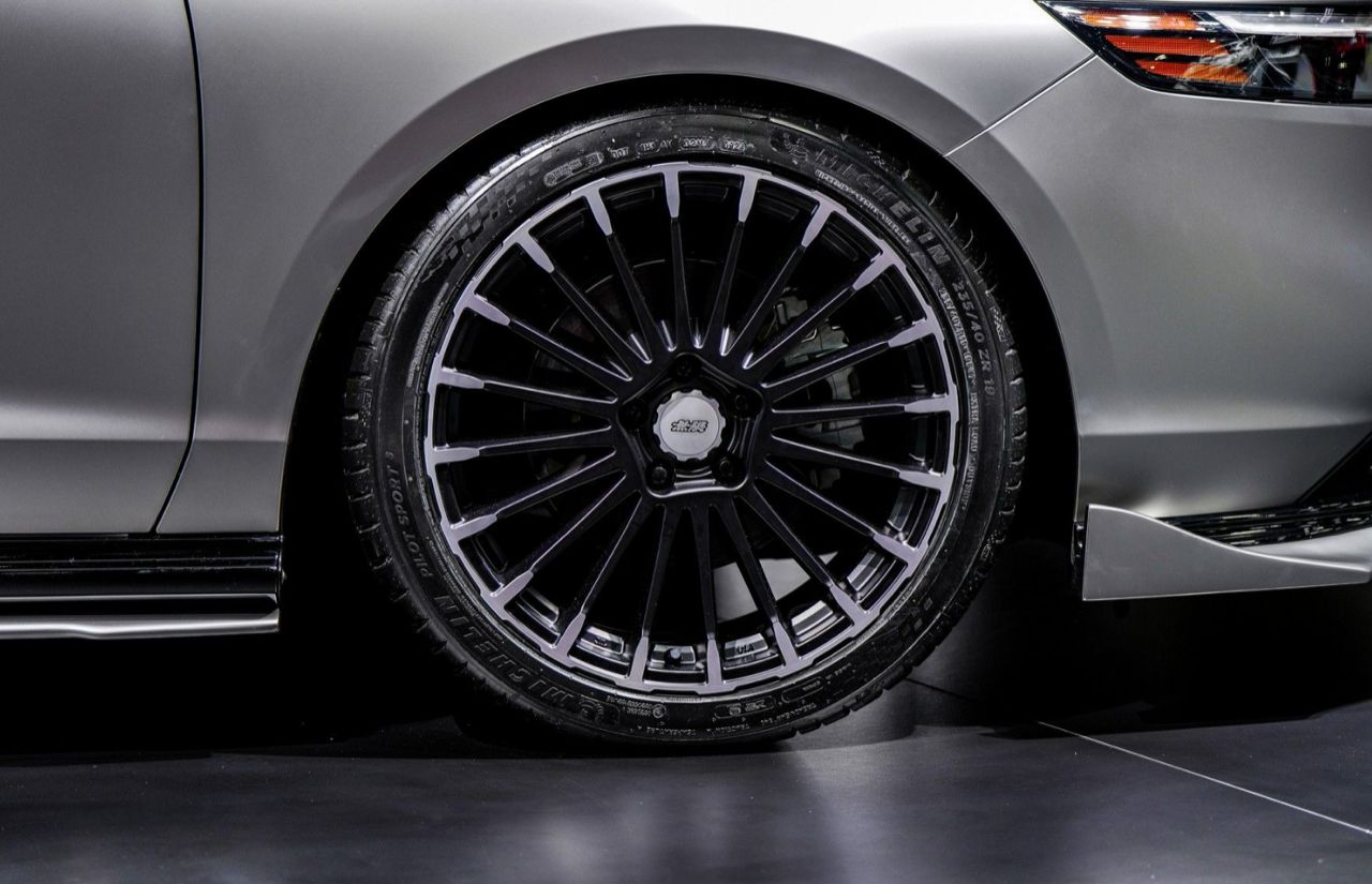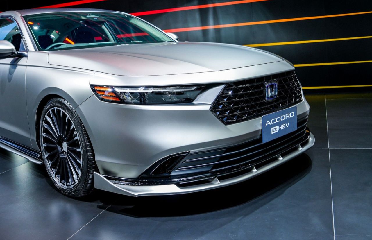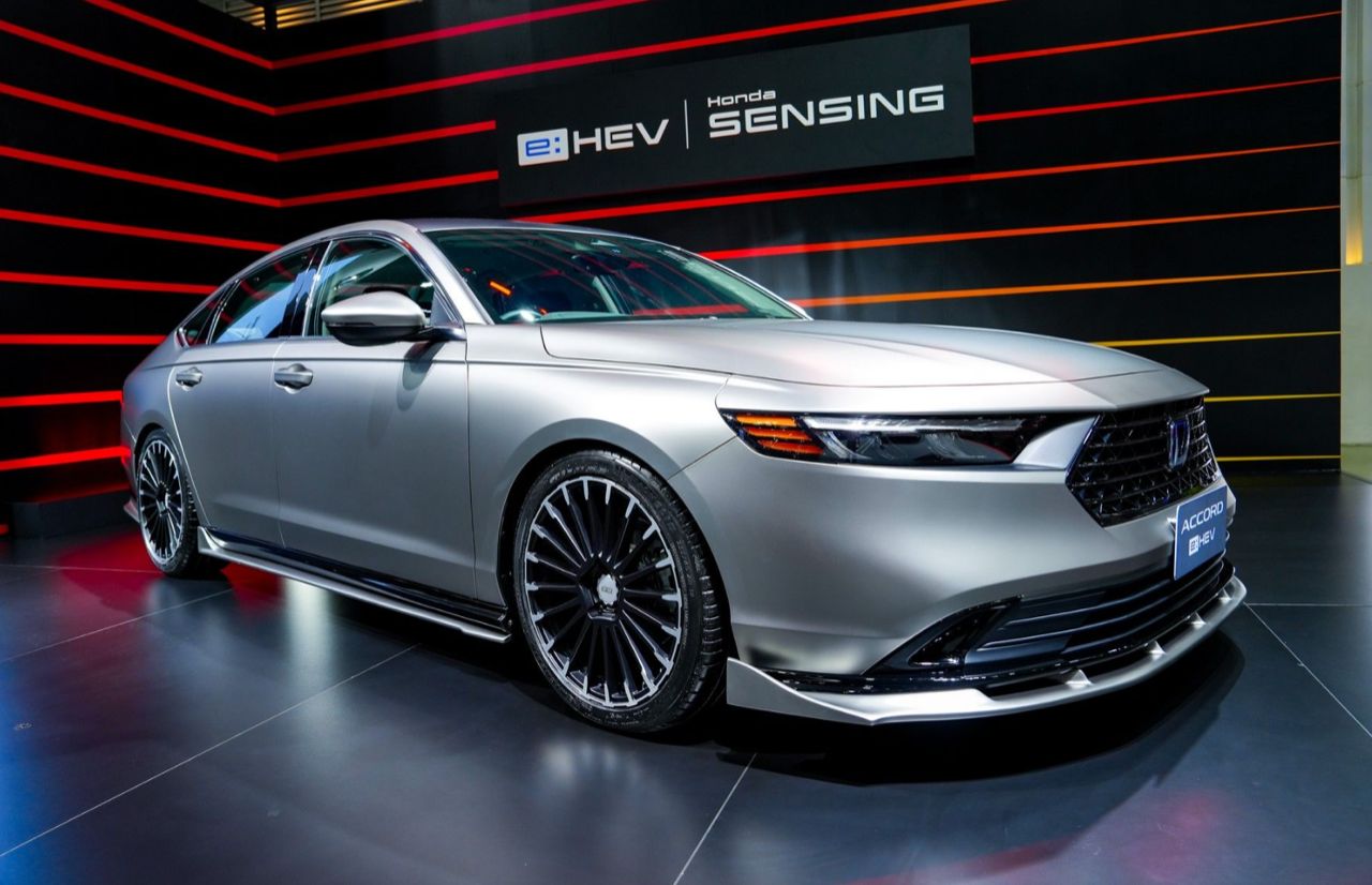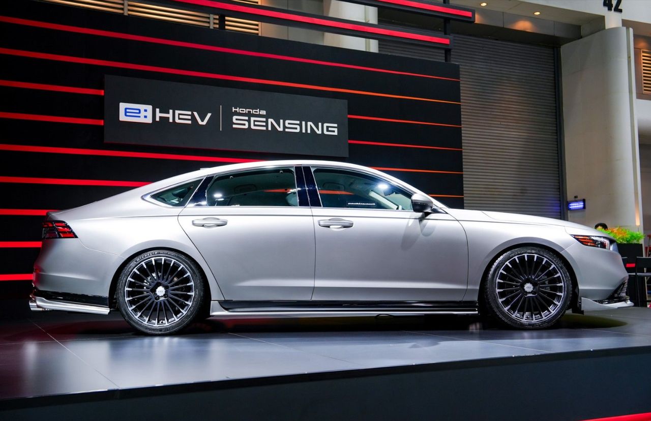Honda Accord รุ่น e:HEV E มาพร้อมไฮไลต์ล้ออัลลอย MUGEN รุ่น MDC ขนาด 19x8.5 +45 สี Flat Black Mirror สไตล์ทูโทน และตกแต่งรอบคันด้วยชุดแต่งพิเศษเพื่อโชว์ไอเดียอัปลุคความสปอร์ตพรีเมียม ตัวถังภายนอกมาพร้อมสติกเกอร์หุ้มรถสีเทาเงินเมทัลลิกแบบด้าน และหลังคาสติกเกอร์ตกแต่งหลังคาสีดำแบบด้าน สเกิร์ตรอบคันสีเดียวกับตัวรถ ได้แก่ สเกิร์ตหน้า สเกิร์ตข้าง และสเกิร์ตหลัง ปลายท่อไอเสียคู่แบบสปอร์ต ยาง MICHELIN Pilot Sport 5 ขนาด 235/40/R19 พร้อมเปลี่ยนชุดแดมเปอร์ (Damper) ที่ลงตัวกับลุคสปอร์ตเท่ของพรีเมียมแฟลกชิปซีดาน (ตกแต่งเพื่อการจัดแสดง ไม่มีการจำหน่าย)