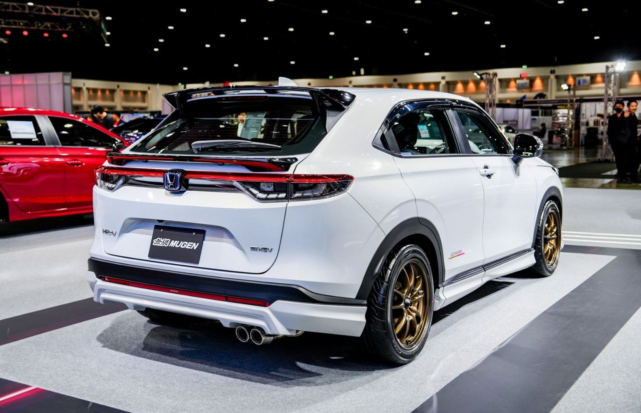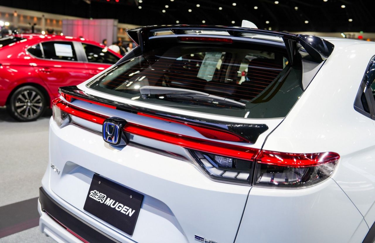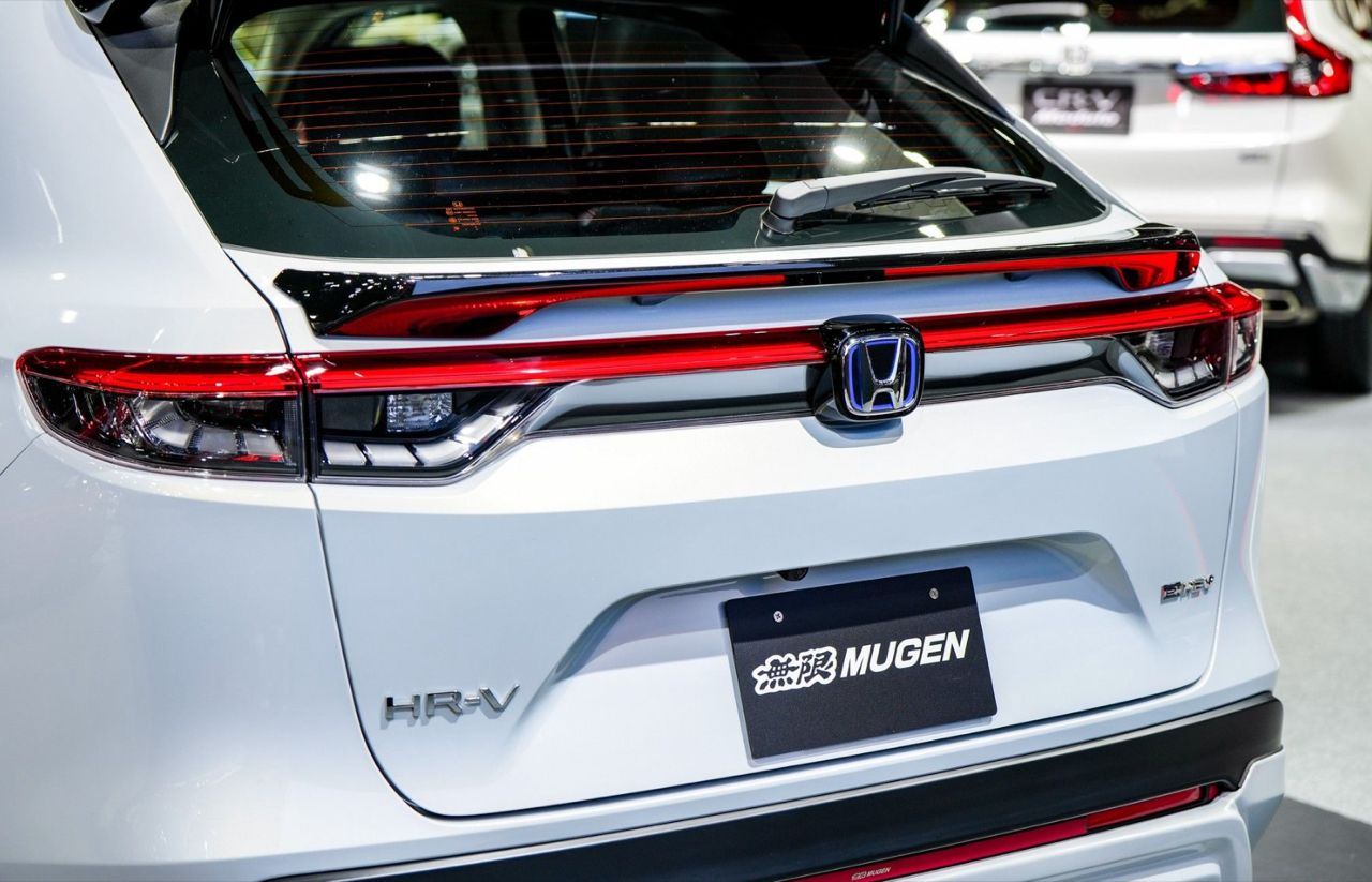 Honda HR-V รุ่น e:HEV EL ชุดแต่ง MUGEN รอบคัน แนวคิด ‘Sporty Energize with Aggressive Styling’ จัดเต็มรอบคันทั้งภายนอกและภายใน ล้อ MUGEN รุ่น MF10 ขนาด 17x7.5 +52 สี Bronze Anodize ยาง Yokohama ADVAN NEOVA AD09 ขนาด 234/45/R17 สเกิร์ตรอบคัน ชุดตกแต่งกันชนหลัง ชุดตกแต่งกระจังหน้า-ไฟหน้า ด้านท้าย สปอยเลอร์หลัง (แบบ Wing) และสปอยเลอร์หลังแบบคาดเอว (Tailgate) ปลายท่อไอเสียทรงสปอร์ต ภายใน พรมปูพื้นห้องโดยสารและห้องบรรทุกสัมภาระในสีแดงสไตล์สปอร์ต ชุดหุ้มเบาะหนังที่เพิ่มความเท่ด้วยโทนสีสีดำสปอร์ตเดินด้ายสีแดง และปักลายแถบสี SHINDEN GO อันเป็นเอกลักษณ์ พร้อมโลโก้ MUGEN บนพนักพิงศีรษะ (ตกแต่งเพื่อการจัดแสดง ไม่มีการจำหน่าย)