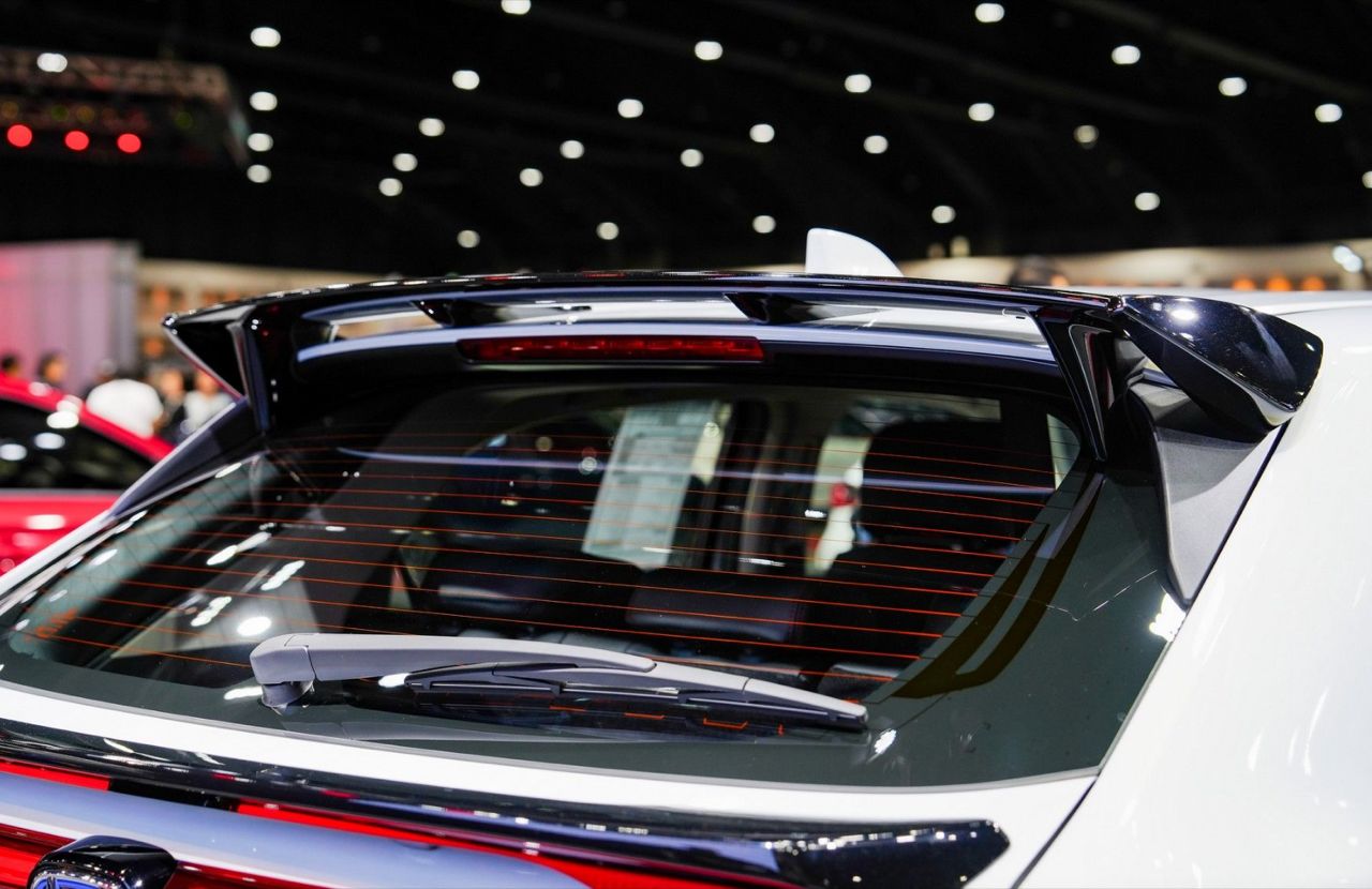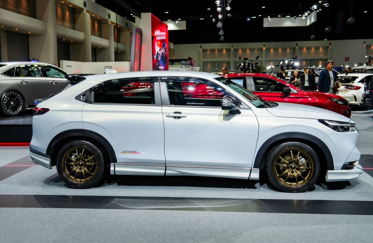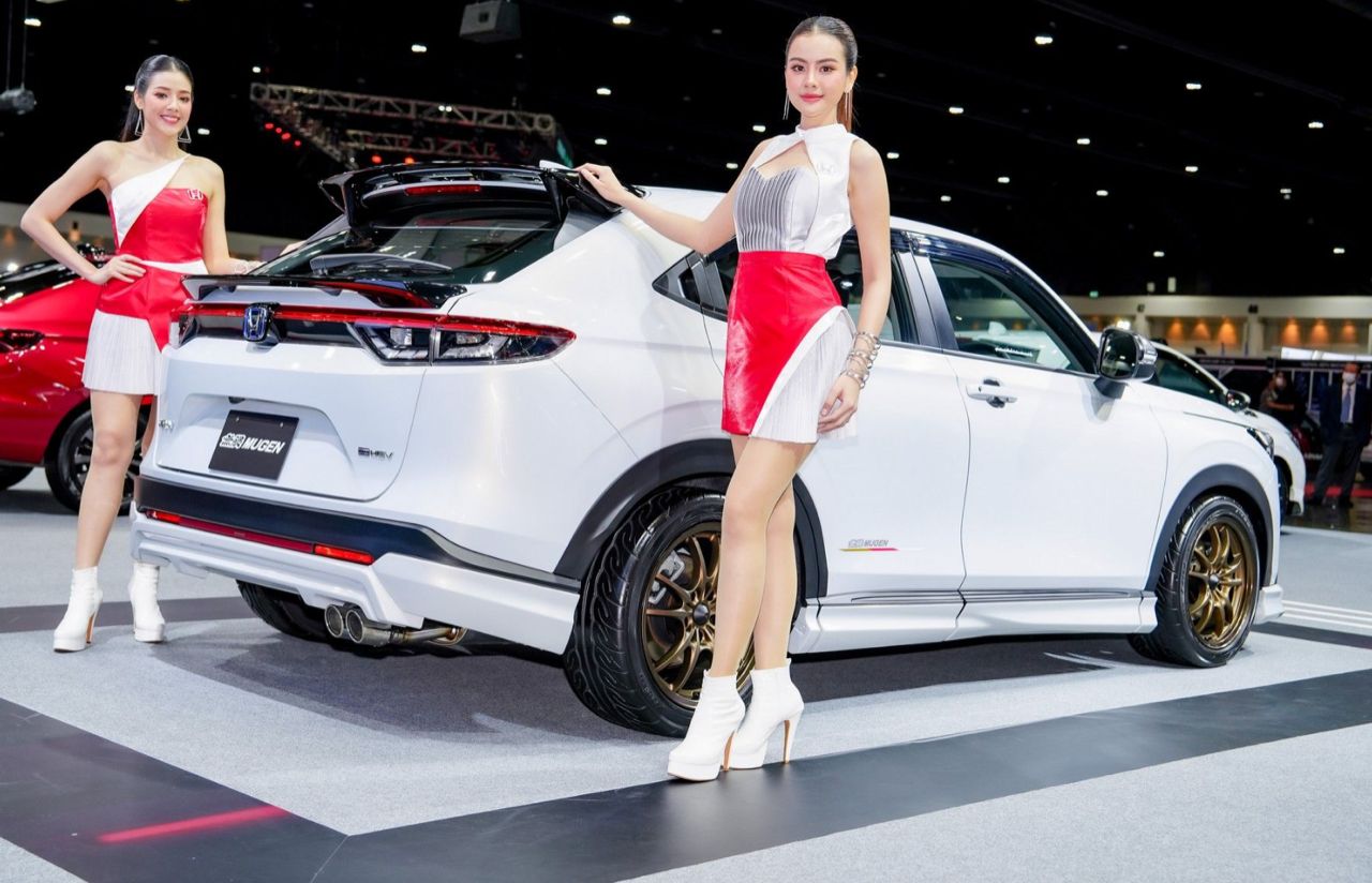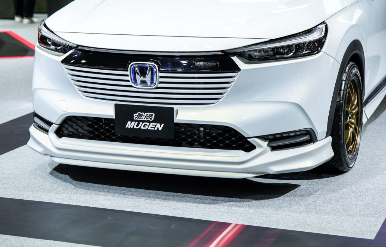 Honda HR-V รุ่น e:HEV EL ชุดแต่ง MUGEN รอบคัน แนวคิด ‘Sporty Energize with Aggressive Styling’ จัดเต็มรอบคันทั้งภายนอกและภายใน ล้อ MUGEN รุ่น MF10 ขนาด 17x7.5 +52 สี Bronze Anodize ยาง Yokohama ADVAN NEOVA AD09 ขนาด 234/45/R17 สเกิร์ตรอบคัน ชุดตกแต่งกันชนหลัง ชุดตกแต่งกระจังหน้า-ไฟหน้า ด้านท้าย สปอยเลอร์หลัง (แบบ Wing) และสปอยเลอร์หลังแบบคาดเอว (Tailgate) ปลายท่อไอเสียทรงสปอร์ต ภายใน พรมปูพื้นห้องโดยสารและห้องบรรทุกสัมภาระในสีแดงสไตล์สปอร์ต ชุดหุ้มเบาะหนังที่เพิ่มความเท่ด้วยโทนสีสีดำสปอร์ตเดินด้ายสีแดง และปักลายแถบสี SHINDEN GO อันเป็นเอกลักษณ์ พร้อมโลโก้ MUGEN บนพนักพิงศีรษะ (ตกแต่งเพื่อการจัดแสดง ไม่มีการจำหน่าย)
