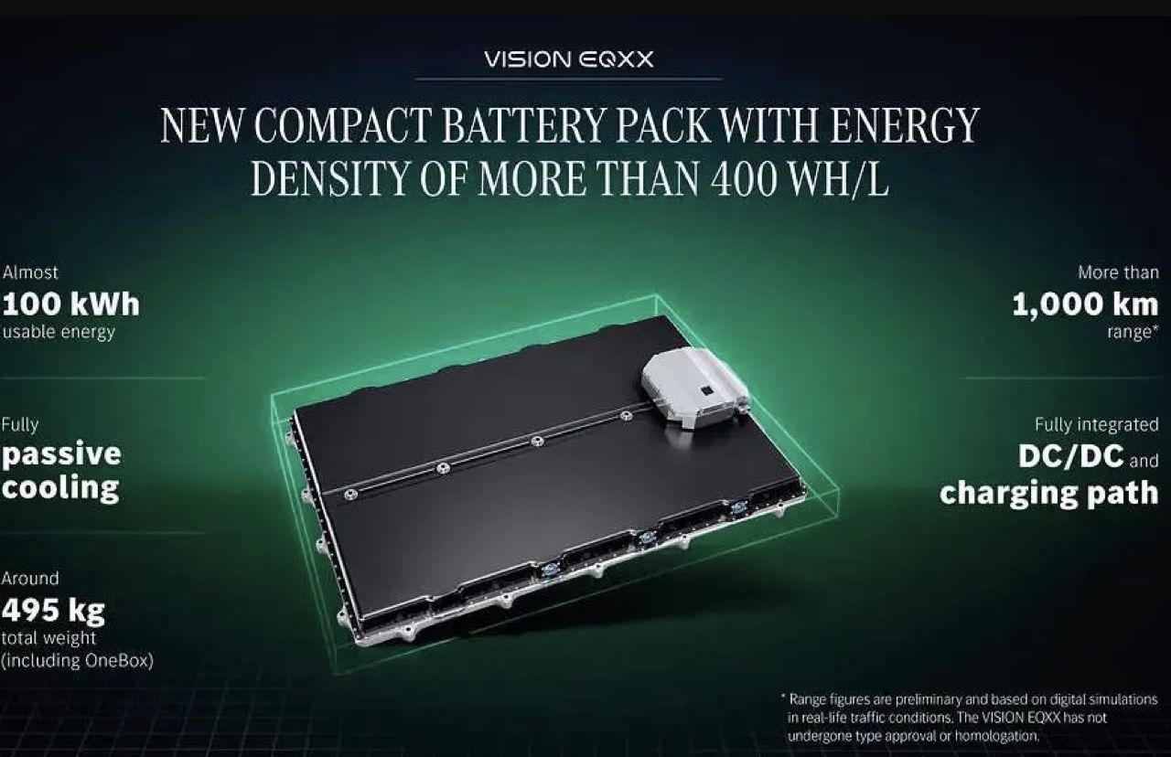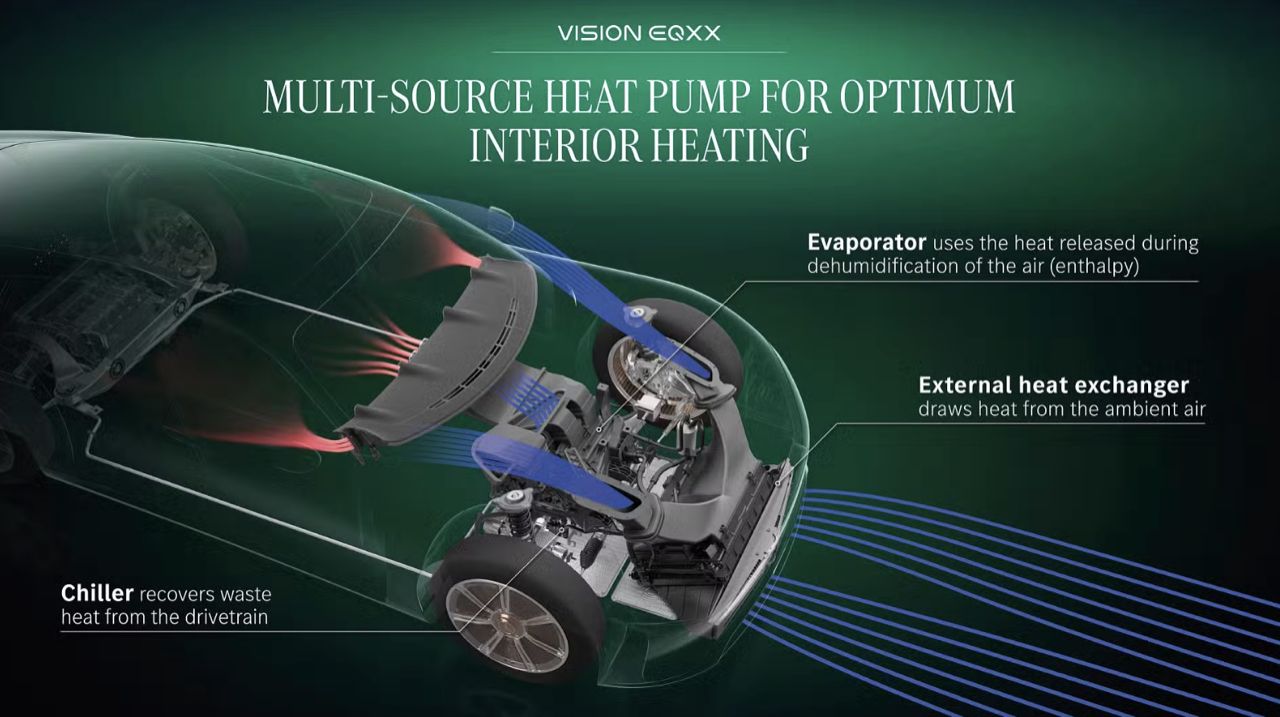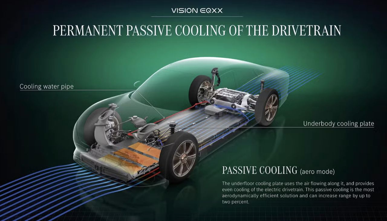 สำหรับระบบส่งกำลัง พ่อมดในแผนก Formula 1 ของ Mercedes-Benz ที่สำนักงานวิจัยและพัฒนาใน Brixworth ช่วยพัฒนาแบตเตอรี่ที่มีความจุเกือบ 100 กิโลวัตต์ชั่วโมง แบตเตอรี่ของ EQXX มีน้ำหนักน้อยกว่าแบตเตอรี่ของ EQS 500 ถึงร้อยละ 30 นอกจากนี้ ยังมีขนาดเล็กกว่าครึ่งหนึ่งอีกด้วย เนื่องจากทั้งมอเตอร์ไฟฟ้าและมอเตอร์ไฟฟ้าแม่เหล็กถาวรประสิทธิภาพสูง จะเกิดอุณหภูมิสะสมเมื่อทำงานอย่างต่อเนื่อง (โดยเฉลี่ย 95 เปอร์เซ็นต์) จึงจำเป็นต้องใช้ระบายความร้อนด้วยอากาศ เพื่อลดน้ำหนักของระบบระบายความร้อนด้วยของเหลว ซึ่งหนักกว่ามาก แผ่นทำความเย็นที่ติดตั้งบนพื้นรถ ช่วยให้ระบบขับเคลื่อนไฟฟ้ามีอุณหภูมิลดลง ภายใต้สภาวะการขับขี่ปกติ โดยไม่มีข้อเสียด้านอากาศพลศาสตร์ เมื่อต้องการระบายความร้อนของมอเตอร์และแบตเตอรี่ ท่อที่ขอบด้านบนของจมูกจะเปิดออกและปล่อยให้อากาศไหลผ่านหม้อน้ำและออกทางช่องระบายอากาศที่ปรับอัตราการไหลในฝากระโปรงหน้า การจัดเรียงนี้ช่วยลดภาระการระบายความร้อนได้อย่างมาก