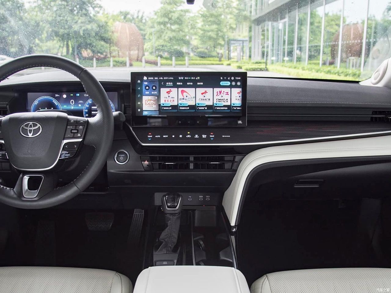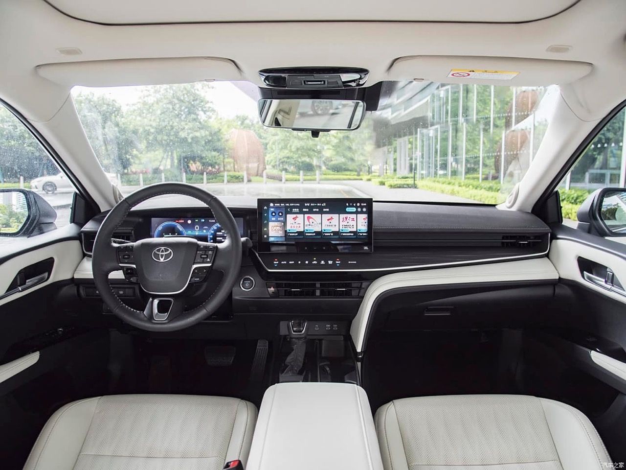 ระบบอินโฟเทนเมนต์ HVAC ใน Camry รุ่นมาตรฐานที่ขายในอเมริกา ใช้รูปแบบปุ่มเหมือนเดิม แต่ All New Camry สเปกจีน จะใช้การสั่งงานผ่านหน้าจอระบบสัมผัสที่ทันสมัยมากกว่า มีการผสาน ฟังก์ชันการใช้งานใหม่เพิ่มขึ้นเพื่อสร้างแรงจูงใจให้กับลูกค้าที่ชอบความไฮเทค ห้องโดยสารมีแผงหน้าปัดแบบจอภาพทรงโค้ง วัสดุตกแต่งหลักใช้พลาสติกเกรดสูง บนคอนโซลกลางส่วนโค้ง S-curve สีเทา ไล่ตั้งแต่ที่วางแก้วน้ำไปจนถึงแผงจอภาพมาตรวัดตรงหน้าคนขับ จนขึ้นไปรอบช่องระบายอากาศ เบาะหุ้มหนังเย็บเดินตะเข็บด้วยด้ายสีขาว ใต้ช่องระบายอากาศด้านข้างแต่ละช่อง มีพลาสติกเงาดำเปียโนแบล็กตกแต่งบนแผงควบคุมระบบปรับอากาศ ลามไปจนถึงหน้าจอสัมผัส พลาสติกที่ดูดียังถูกนำมาใช้บนแผงหน้าปัด ด้วยรูปแบบแฟชั่นรถยนต์ Toyota สไตล์คลาสสิก ปุ่มต่างๆ แยกการสั่งงานบนหน้าจออย่างชัดเจน เพื่อลดความยุ่งยากที่จะเอาทุกอย่างไปรวมอยู่ในจอมอนิเตอร์กลาง ซุ้มคันเกียร์ใหม่ มีปุ่มเล็กๆ บนแผง HVAC และรอบๆ หน้าจอสัมผัส หน้าจอคลัสเตอร์เกจดิจิทัล หรือจอภาพมาตรวัดตรงหน้าคนขับจัดจอที่มีความละเอียดพร้อมโทนสีที่ทำให้อ่านค่าได้ง่าย มาตรวัดรอบและความเร็วยังอยู่เหมือนเดิม สำหรับหน้าจอสัมผัสส่วนกลางมีขนาดความกว้างถึง 12.3 นิ้ว แดชบอร์ดแบบใหม่ยังดูคล้ายกับของ Lexus บางรุ่นอีกด้วย