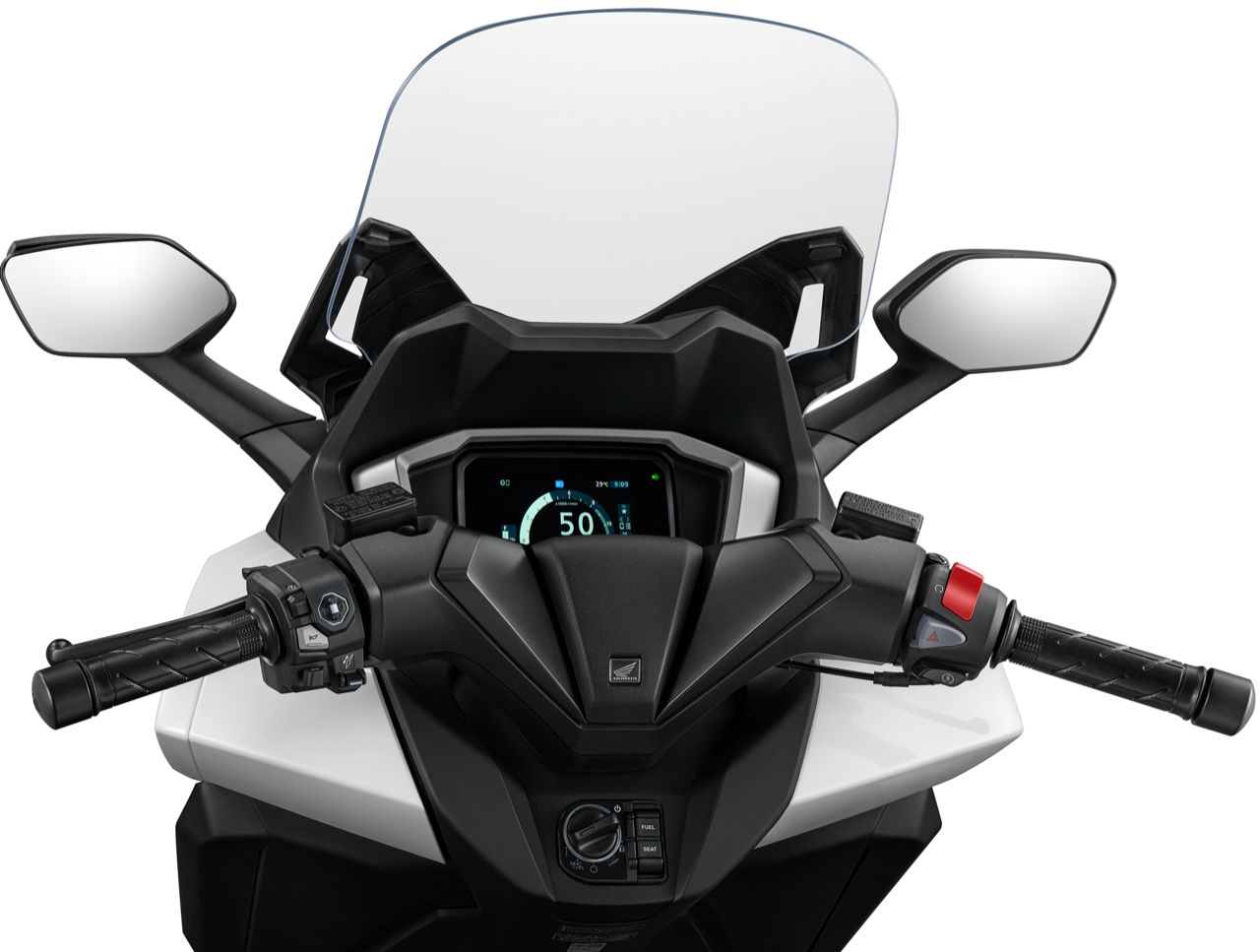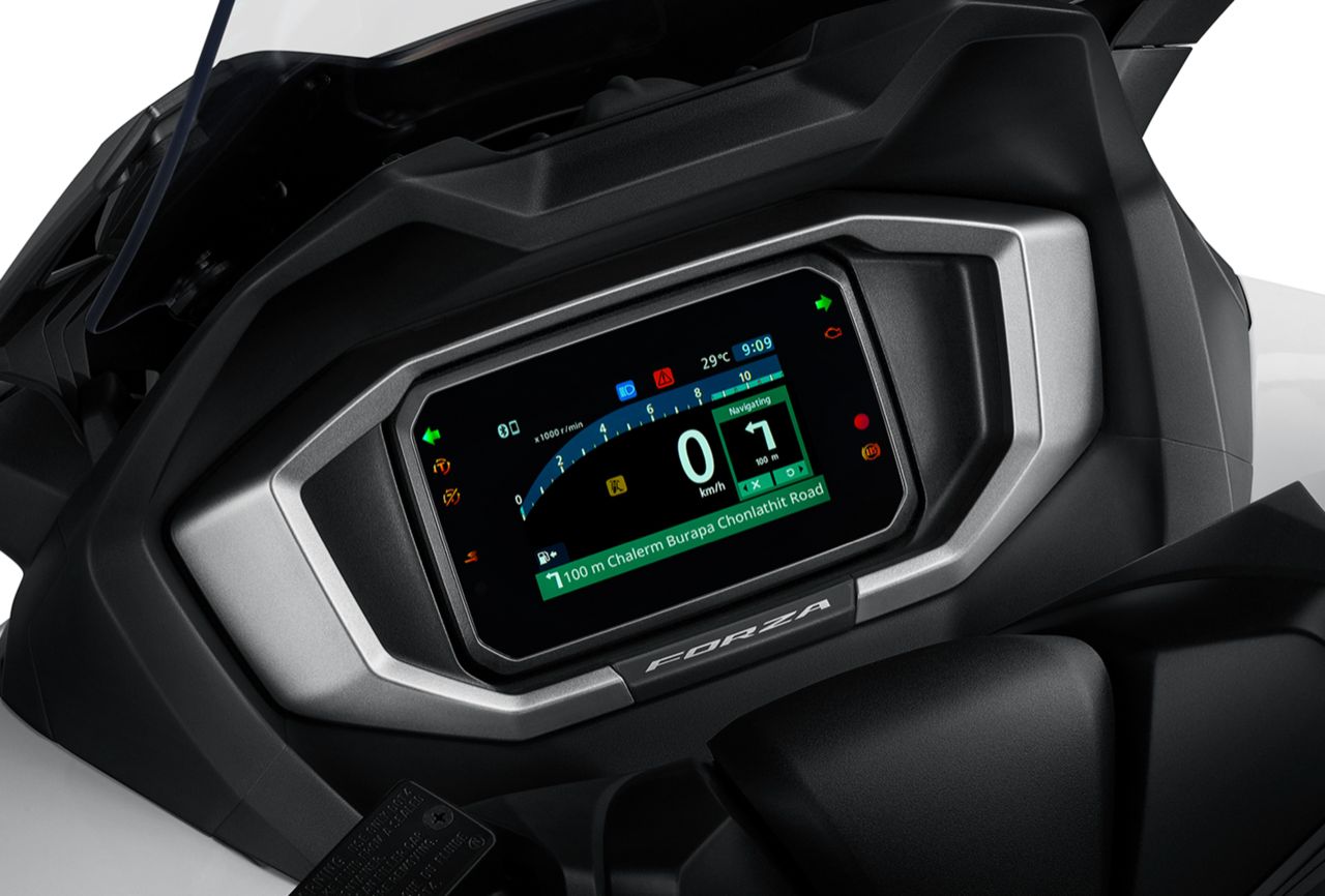New Honda FORZA350 หน้าจอแสดงผล TFT ใหม่ ขนาด 5 นิ้ว แสดงผลทุกข้อมูลการขับขี่ได้ครบถ้วนชัดเจน แสดงผลระบบ HSTC (Honda Selectable Torque Control) ระบบตรวจจับและควบคุมล้อหน้า-ล้อหลังให้สัมพันธ์กัน ป้องกันรถเสียการทรงตัว เพื่อความปลอดภัยในทุกการขับขี่ เชื่อมต่อกับแอปพลิเคชัน Honda RoadSync ที่ควบคุมการทำงานด้วยเสียง โดยไม่ต้องละสายตาจากถนน ในการรับสายโทรเข้า-โทรออก, ระบบนำทาง, แอปพลิเคชันเพลง และประวัติการเดินทาง พร้อมควบคุมผ่านปุ่มคอนโทรลเลอร์ดีไซน์ใหม่ในแบบมัลติฟังก์ชันสั่งการได้หลากหลายในทุกสถานการณ์