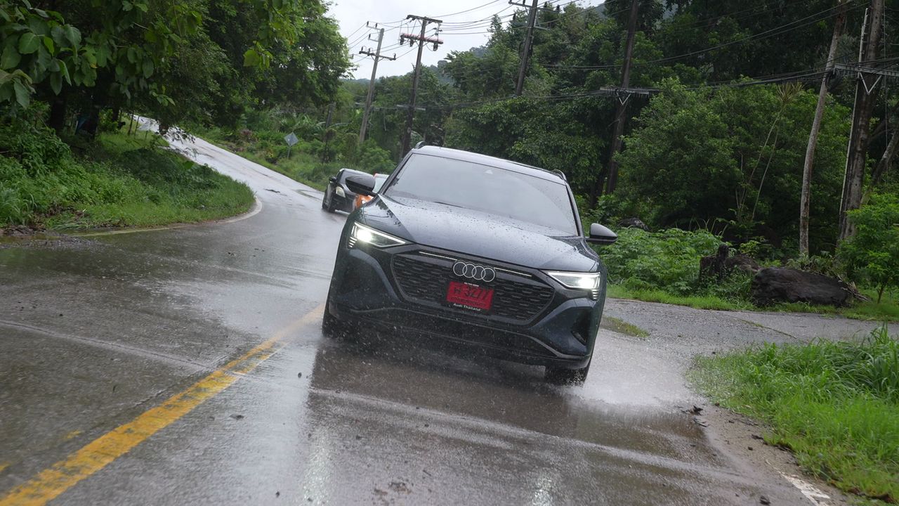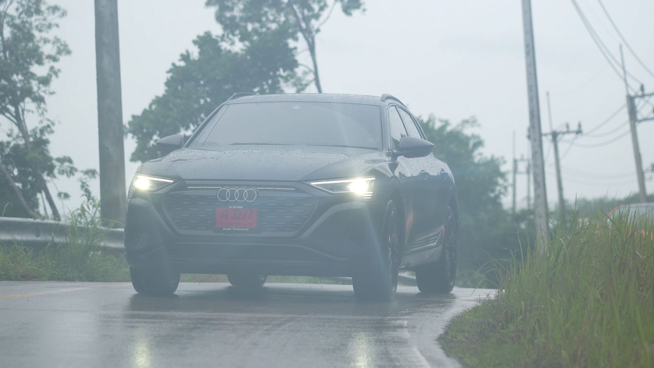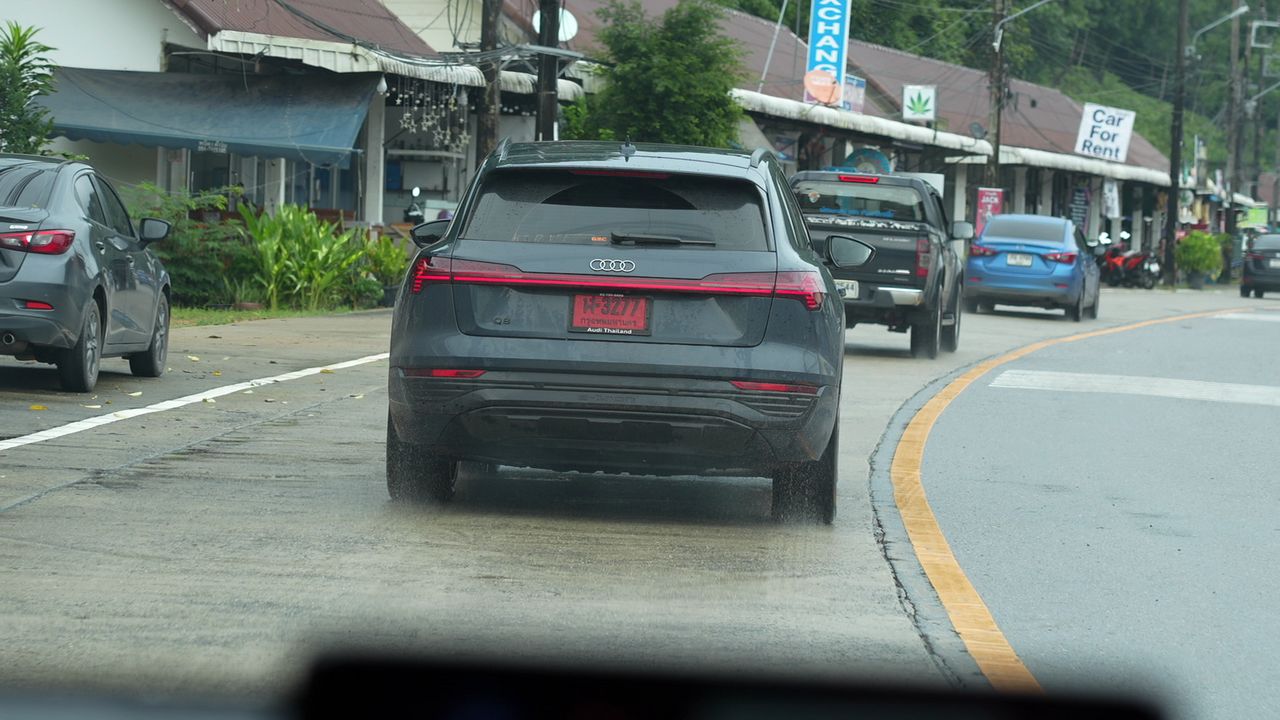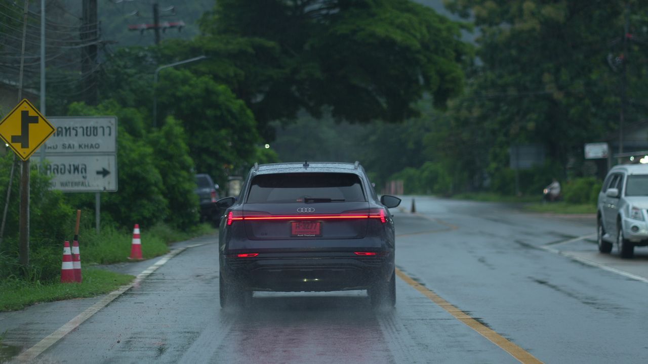 บนถนนที่มีทั้งทางชัน คดเคี้ยว แถมฝนตกหนักเกือบตลอดเวลาที่เราอยู่ ต้องยกความดีความชอบให้เจ้า Audi Q8 e-tron ของเราที่นอกจากจะมีพลังเหลือเฟือแล้ว ยังมาพร้อมระบบขับเคลื่อนสี่ล้อ ช่วงล่างยกสูงได้ กดต่ำได้ สารพัด เจอแอ่งน้ำข้างทางเข้าไป Audi ไม่มีเซ มันเป็นรถที่กินไฟดุก็จริง ขาดอุปกรณ์ช่วยเรื่องการขับอัตโนมัติก็จริง แต่ถ้าเป็นเรื่องเสถียรภาพและความมั่นใจ หาตัวจับได้ยาก ในขณะที่เจ้าตัวเล็กแต่แสบอย่าง MG4 V นั้น ขาขึ้นเขาจะตาม Audi ไม่ค่อยทัน เพราะเขาพกม้ามา 170 ตัว ในขณะที่ Audi มี 408 ตัว แต่ถ้าเป็นขาลงเมื่อไหร่ บังเต้ยใน MG4 ไล่บี้ Audi ในมือไอ้ตี้ได้ติดท้ายตลอด เพราะรถเบา เลี้ยวง่าย บังคับควบคุมดี แต่นั่นคือมือระดับบังเต้ยที่ขับรถทุกแบบมารอบประเทศนะครับ ถ้าเป็นคนทั่วไปก็อย่าซิ่งเกินลิมิต MG4 เอง ถึงแม้บาลานซ์ของรถและระบบช่วยเหลือจะทำงานได้ดี แต่บนถนนเปียกก็ต้องระวังการไถลไว้บ้าง แต่ไม่ถึงกับดริฟต์ครับ MG4 ตัว Long Range นี้ นิสัยช่วงล่างดูจะพยายามเอาความเกาะถนนมากกว่ารุ่นแบตเตอรี่เล็ก คาแรกเตอร์ท้ายกวาด ไม่มากเท่า