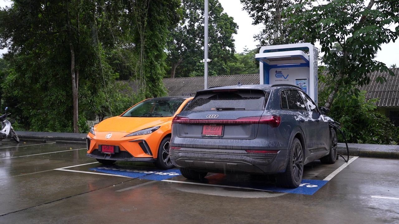 น้าฉ่าง อาคม รวมสุวรรณ หัวหน้า บก.คอลัมน์รถของผมเคยบอกไว้ว่า ถ้าเดินไปตามทาง เจอแขก เจองู ให้ตีบังเต้ย (นิธิ ท้วมประถม) ก่อนเสมอ เพราะบังชอบหาเรื่องแกล้งน้าในทุกการเดินทาง ในครั้งนี้ผมจึงไม่ค่อยแปลกใจเท่าไร ถ้าน้าฉ่างแกจะหนีไปทดสอบรถของแกคนเดียว ส่วนตัวผมนั้นมากับบังเต้ย ด้วยรู้ว่าบังเป็นคนเชี่ยวชาญยุทธนัก ในการเสาะหาของกินทั่วประเทศ ขับรถ 5 ชั่วโมงบุกป่าไปกินกาแฟก็ทำมาแล้ว ในครั้งนี้บังเต้ยมีความคิดว่าอยากลองเอา EV วิ่งไปเกาะช้างว่ามันยากหรือง่ายแค่ไหน พวกเราจึงติดต่อยืมรถมาสองคัน ระดับหลักแสน เรามี MG 4 V Long Range ราคา 889,000 บาท และระดับหลักล้าน เราใช้ Audi Q8 e-tron quattro Black Edition ราคาตามป้าย 5,499,000 บาท ราคาที่ลด 4,850,000 บาทนั้น ไม่แน่ว่ายังมีโอกาสหรือไม่ ยังไงก็สอบถามไปทาง Audi ได้ครับ