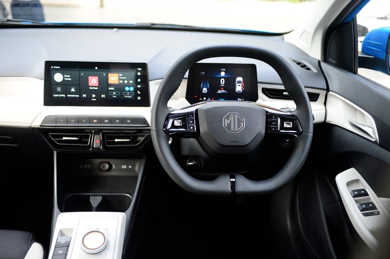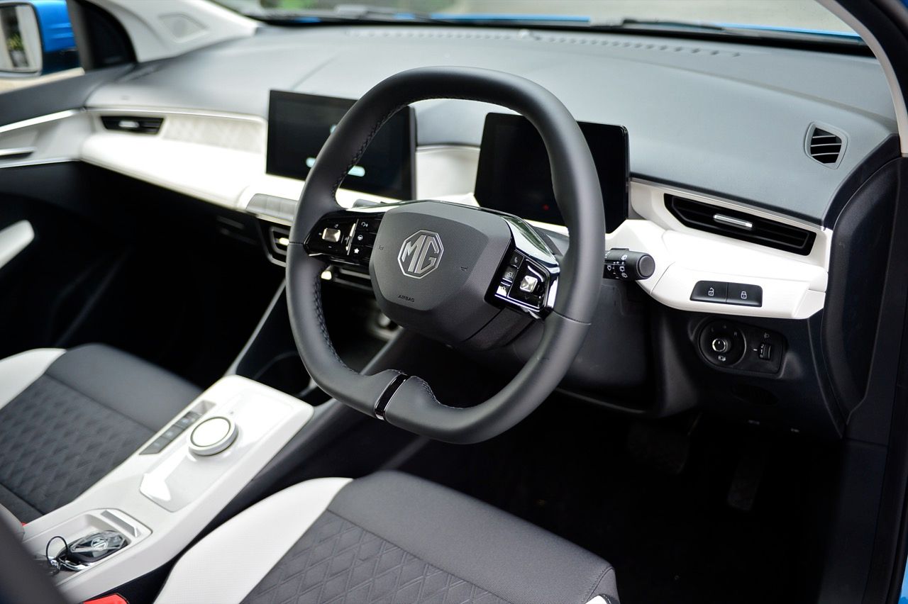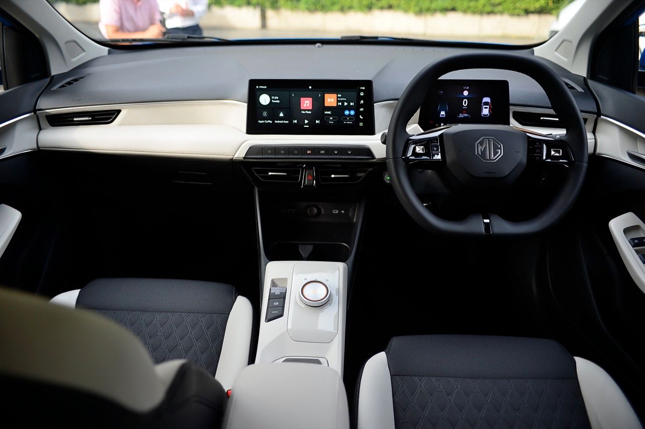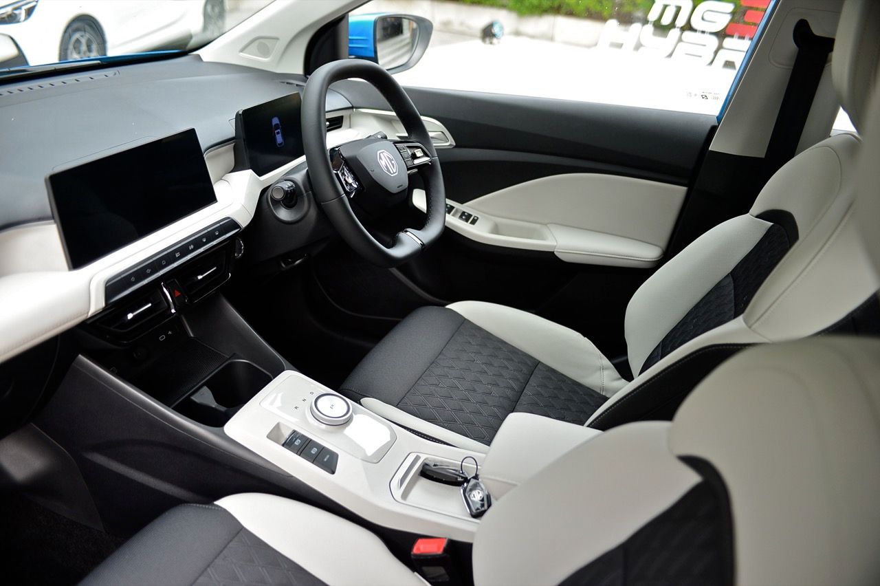ภายในของ New MG3 Hybrid+ ติดตั้งเบาะแบบสปอร์ตคู่หน้าปรับมือ โทนสีภายในมีให้เลือกทั้งสีขาวสลับดำหรือสีดำล้วน วัสดุพวกพลาสติกค่อนข้างมีคุณภาพดีกว่ารถเล็กบางรุ่นของแบรนด์ญี่ปุ่น แสดงให้เป็นถึงความตั้งใจในการเอาชนะของ MG หน้าจอสัมผัสขนาด 10.25 นิ้ว มีรายละเอียดและแบบอักษรที่แตกต่างกัน ไม่ได้มีคุณสมบัติครบครันที่สุด หรือมีโครงสร้างเมนูที่สมเหตุสมผล แต่การกดสั่งงานต่างๆ ถือว่าตอบสนองได้เร็วขึ้น อาการหน่วงน้อยลง จอมอนิเตอร์กลางพร้อมระบบอินโฟเทนเมนต์ เชื่อมต่อ Apple CarPlay และ Android Auto ผ่านพอร์ต USB-A หลัก มีพอร์ต USB-A เพิ่มเติมอีกสองพอร์ต (พอร์ตหนึ่งอยู่ที่กระจกมองหลังภายในและอีกพอร์ตหนึ่งอยู่ที่เบาะหลัง) และพอร์ต USB-C