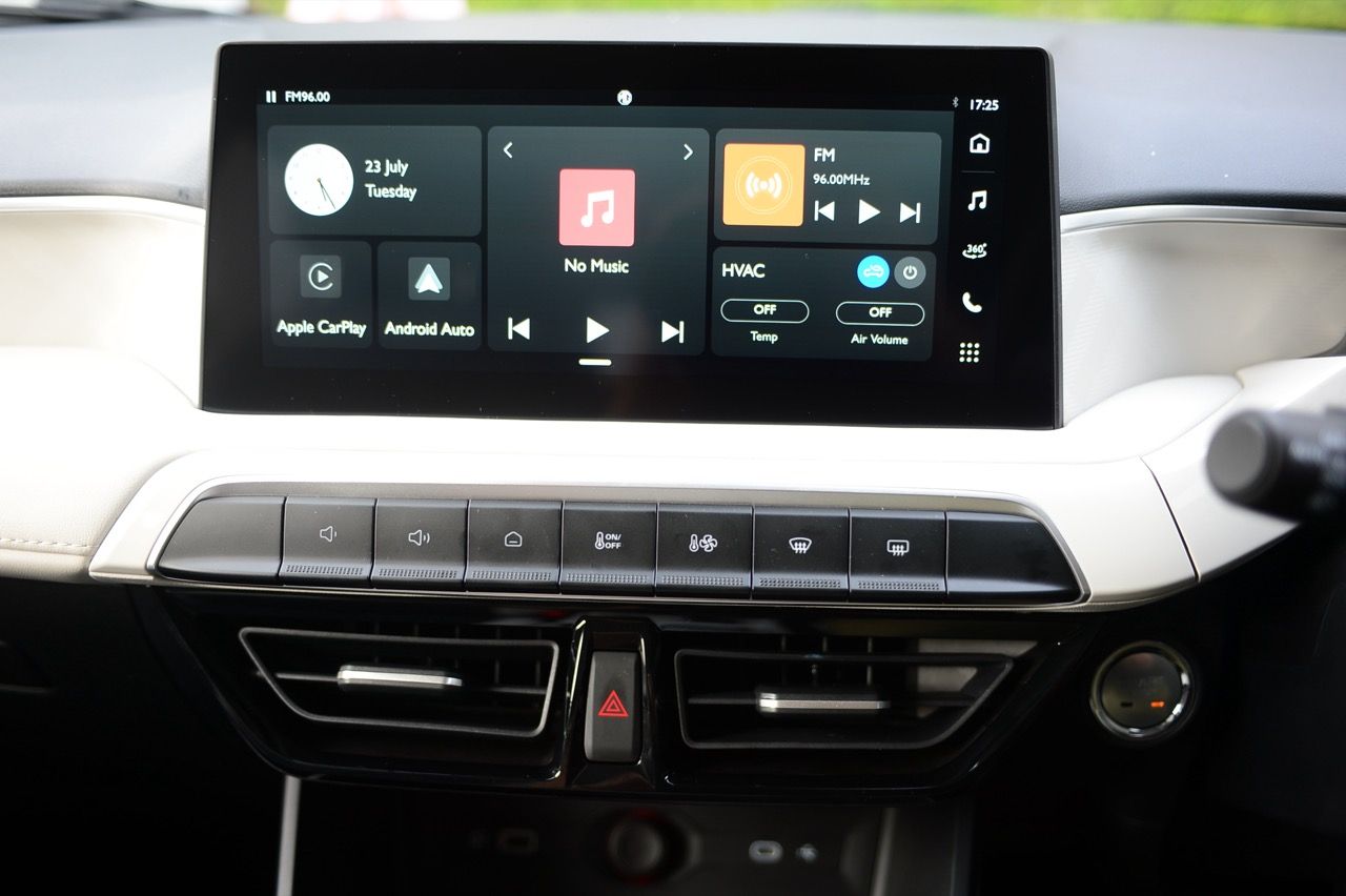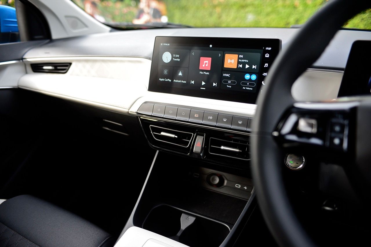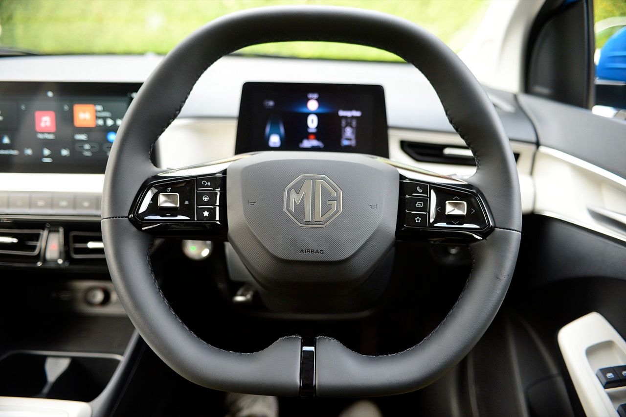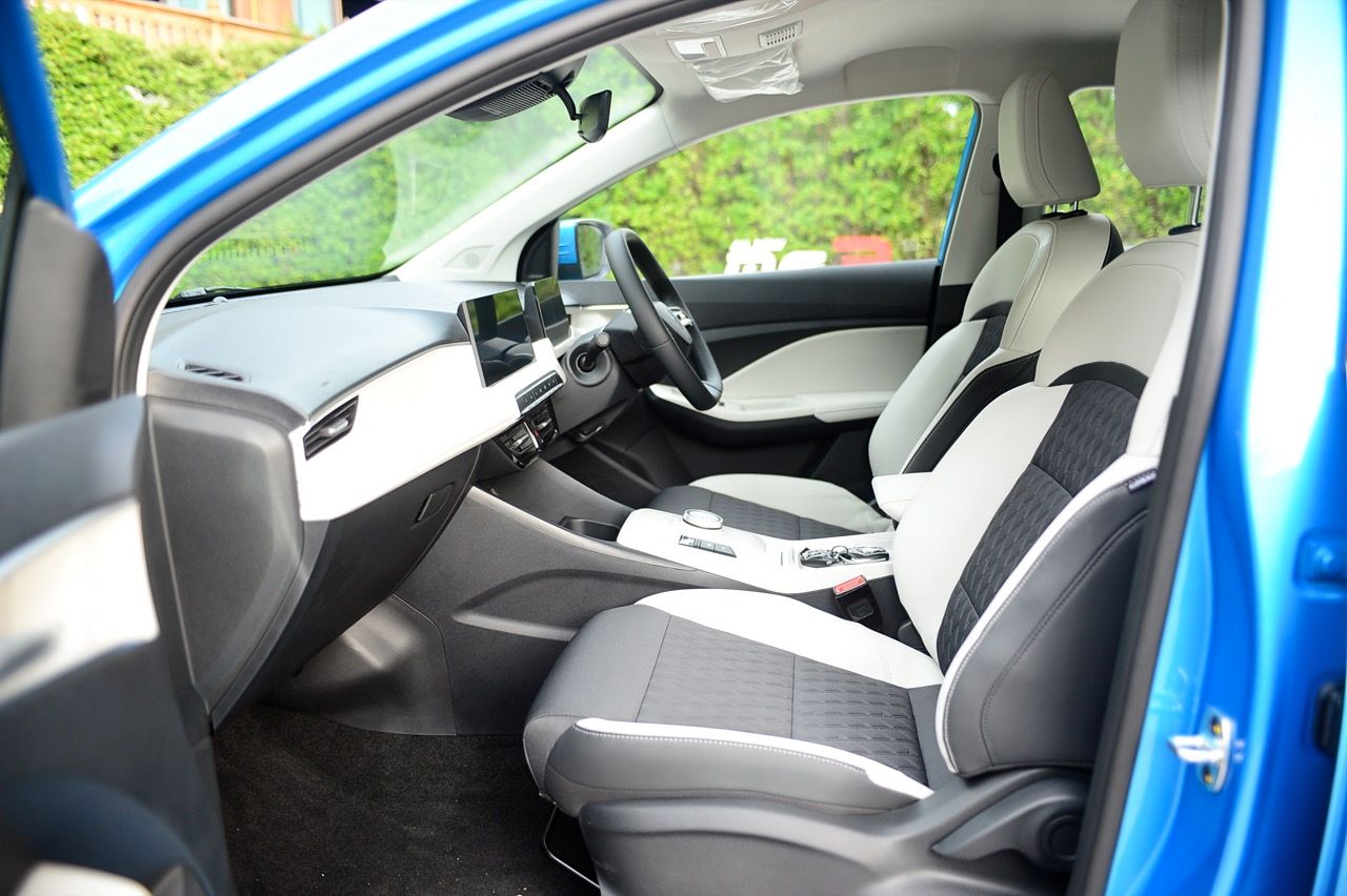 ภายในของ New MG3 Hybrid+ ติดตั้งเบาะแบบสปอร์ตคู่หน้าปรับมือ โทนสีภายในมีให้เลือกทั้งสีขาวสลับดำหรือสีดำล้วน วัสดุพวกพลาสติกค่อนข้างมีคุณภาพดีกว่ารถเล็กบางรุ่นของแบรนด์ญี่ปุ่น แสดงให้เป็นถึงความตั้งใจในการเอาชนะของ MG หน้าจอสัมผัสขนาด 10.25 นิ้ว มีรายละเอียดและแบบอักษรที่แตกต่างกัน ไม่ได้มีคุณสมบัติครบครันที่สุด หรือมีโครงสร้างเมนูที่สมเหตุสมผล แต่การกดสั่งงานต่างๆ ถือว่าตอบสนองได้เร็วขึ้น อาการหน่วงน้อยลง จอมอนิเตอร์กลางพร้อมระบบอินโฟเทนเมนต์ เชื่อมต่อ Apple CarPlay และ Android Auto ผ่านพอร์ต USB-A หลัก มีพอร์ต USB-A เพิ่มเติมอีกสองพอร์ต (พอร์ตหนึ่งอยู่ที่กระจกมองหลังภายในและอีกพอร์ตหนึ่งอยู่ที่เบาะหลัง) และพอร์ต USB-C