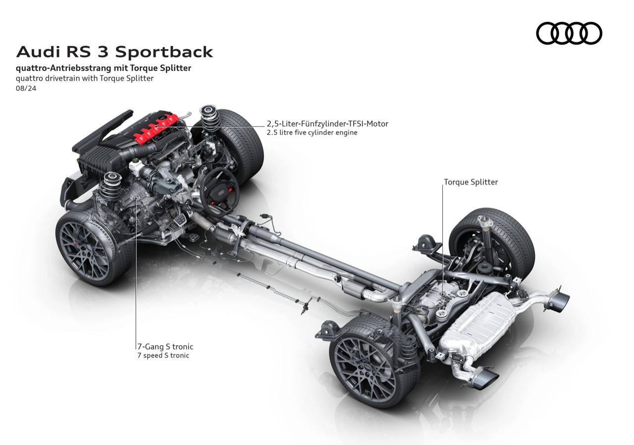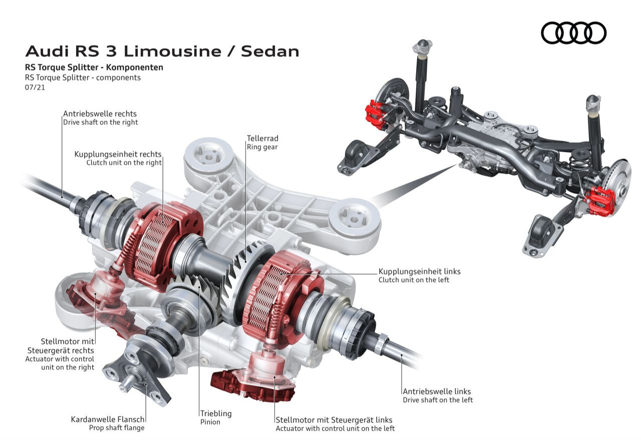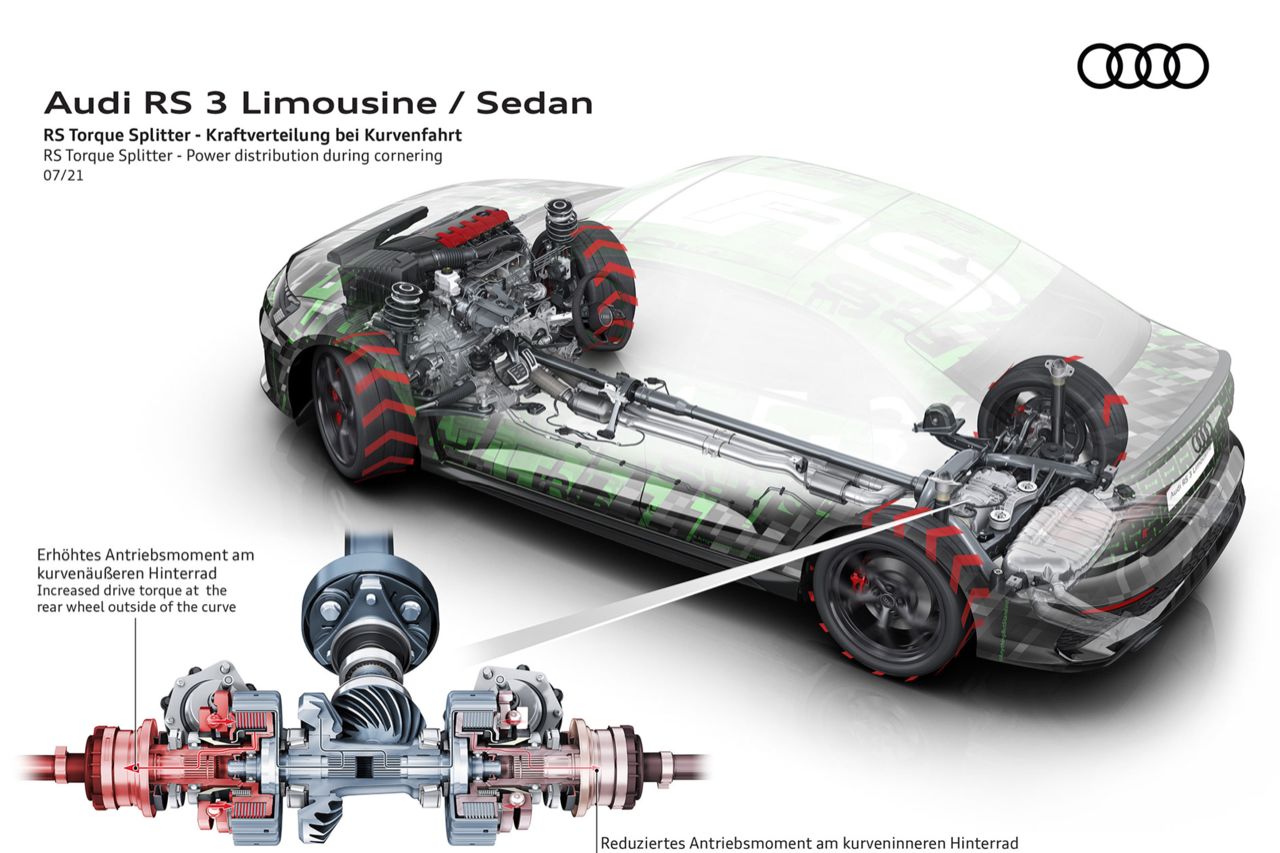 RS Torque Splitter สามารถกระจายแรงบิดแบบแปรผันได้อย่างต่อเนื่องและรวดเร็ว การทดกำลังจะเกิดขึ้นที่ล้อหลังโดยตรง แตกต่างจากเฟืองท้ายของเพลาล้อหลังที่ใช้คลัตช์หลายแผ่นเรียงซ้อนกัน ซึ่งก่อนหน้านี้ที่เคยติดตั้งบนเพลาหลังของ RS3 โฉมท่ีแล้ว ใน RS3 รุ่นใหม่ ตัวแยกแรงบิด RS Torque Splitter ใช้คลัตช์หลายแผ่น ควบคุมด้วยระบบอิเล็กทรอนิกส์ แต่ละตัวอยู่บนเพลาทดกำลังที่เกี่ยวข้อง ในระหว่างการขับอย่างรุนแรง การทำงานจะเน้นไปที่ไดนามิกของรถเป็นหลัก ตัวแยกแรงบิดจะเพิ่มแรงบิดในการขับเคลื่อน ส่งตรงไปยังล้อหลังด้านนอก เนื่องจากภารกรรมของล้อหลังด้านนอกที่สูงกว่า ช่วยลดแนวโน้มที่จะเกิดอาการอันเดอร์สเตียร์ได้อย่างมาก ณ จุดที่สมดุลนี้ทำให้รถเข้าออกโค้งได้เร็วขึ้น