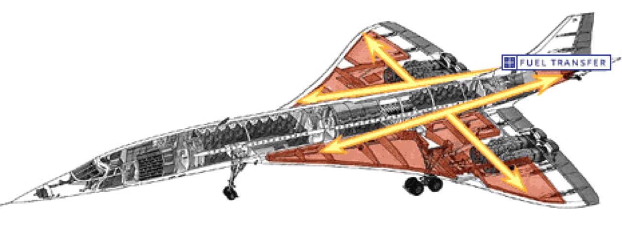 รูปทรงและน้ำหนักรวมถึงปีกเป็นหัวใจในการออกแบบของเครื่องบิน concorde ปีกที่มีรูปสามเหลี่ยมแบบโอจีหรือปีกแบบogical delta wing ที่ผ่านการดีไซน์และทดสอบในอุโมงลมความเร็วสูงถึงว่า300 แบบ หลังจากผ่านขั้นตอนการทดสอบดังกล่าวแล้ววิศวกรการบินของทั้งสองบริษัทพบว่า ปีกแบบสามเหลี่ยมสามารถทำให้เครื่องบินบินด้วยความเร็วถึงมัค 3.0โดยไม่ก่อให้เกิดความเสียหายใดๆอัตราส่วนแรงยกต่อแรงต้านทานลดลงอย่าง รวดเร็วในช่วงความเร็วมัค0.8-1.0และลดลงอย่างช้าๆเมื่อผ่านความเร็วที่มัค 1.0-2.0ซึ่งจะเป็นความเร็วเดินทางปกติของ concorde และเมื่อบวกเข้ากับเครื่องยนต์โรลล์-รอยล์ สเนกม่า โอลิมปัส 593ทำให้ปีกแบบสามเหลี่ยมนี้ให้ประสิทธิ์ภาพโดยรวมเป็นไปตามเกณฑ์ที่วิศวกร คำนวนไว้ คุณสมบัติที่ดีของปีกแบบสามเหลี่ยมคือเมื่อบินแผ่นกำแพงเสียงแล้ว จุดศูนย์กลางของแรงยกจะเคลื่อนผ่านไปอยู่ในบริเวณหลังของตัวปีกและส่งผลให้ แรงยกเคลื่อนที่ตามไปด้วยผลลัพธ์ที่ได้ตามมาคือส่วนหัวของ concorde มีแนวโน้มที่จะลดลงต่ำกว่าเส้นขอบฟ้าในเครื่องบินโดยสารความเร็วต่ำ กว่าเสียงแบบปกติทั่วไปสิ่งที่นักบินจะต้องทำในขณะที่ส่วนหัวลดต่ำลงจากเส้น ขอบฟ้าคือการปรับ trimให้หัวของเครื่องบิน บินอยู่ได้ในระบบปกติแต่การบินด้วยความเร็วสูงกว่ามัค2.0นั้นจะเกิดแรงต้าน มากเสียจนนักบินไม่สามารถทำการปรับ trim แก้อาการนี้ได้วิศวกรการบินจึงแก้ไขปัญหานี้โดยติดตั้งระบบการถ่ายโอนน้ำมัน เชื้อเพลิงและทำให้นักบินสามารถเลื่อนจุดศูนย์กลางของแรงโน้มถ่วงไปยังส่วน หน้าได้พื่อแก้ปัญหาอาการดังกล่าว