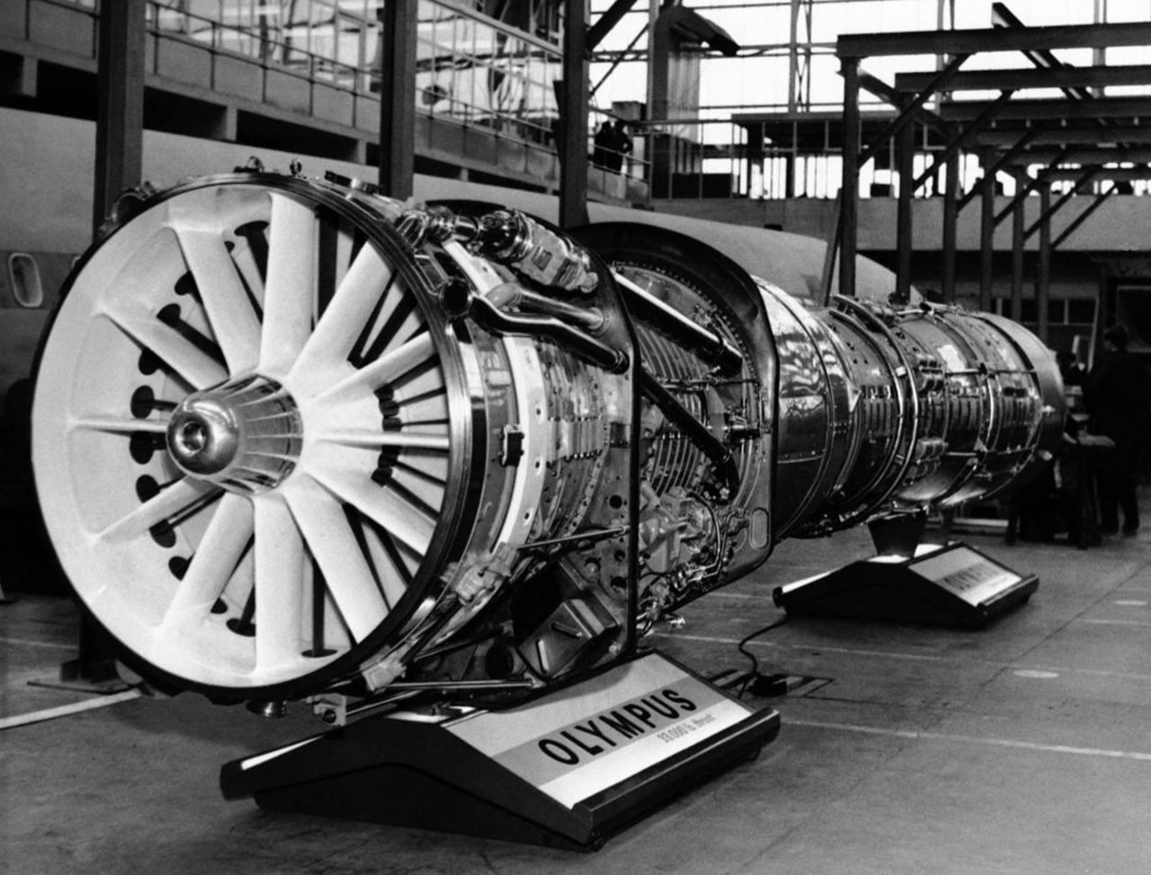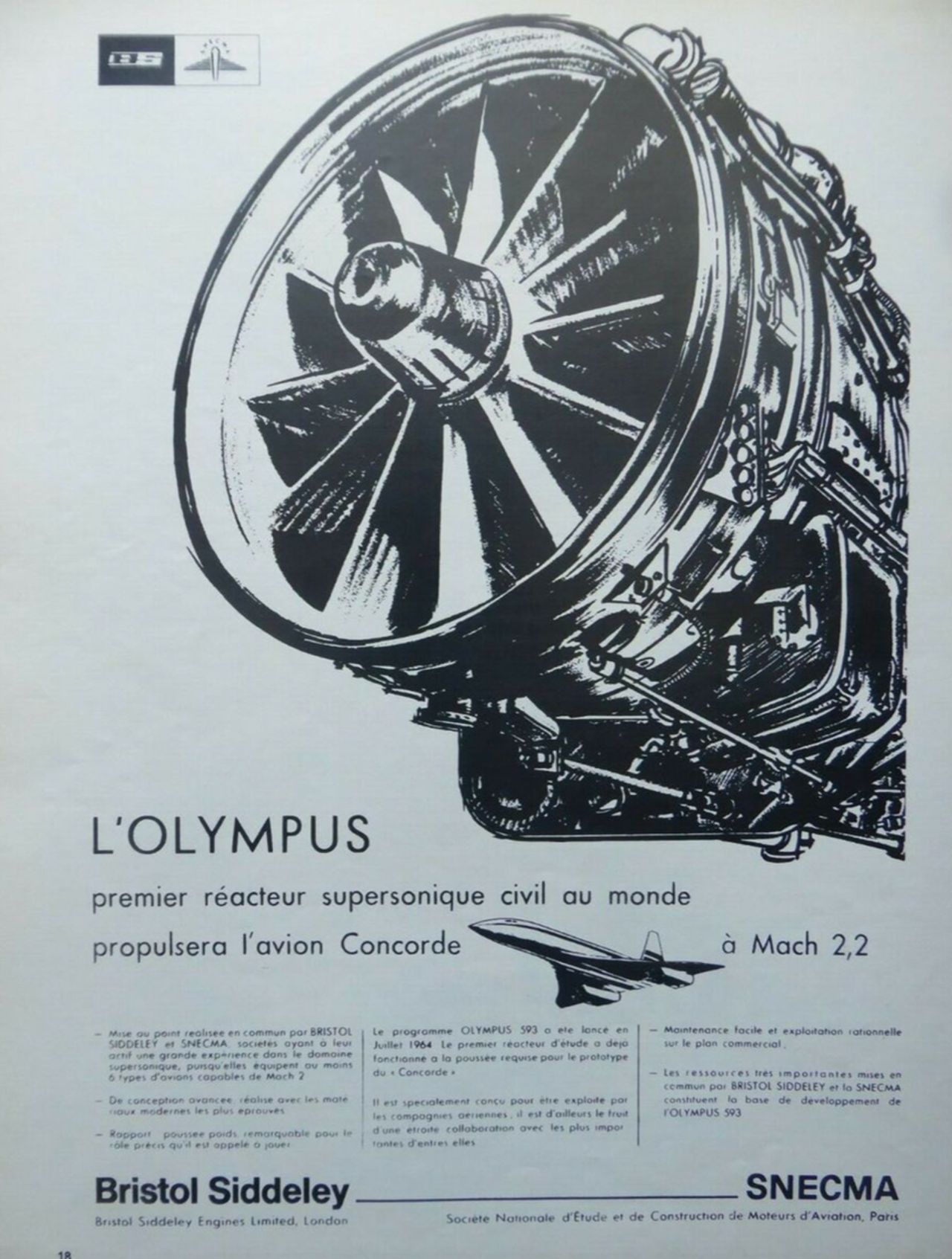 การบินด้วยความเร็วเหนือเสียงของเครื่องบินทุกแบบจะถูกแรงต้านทานมากระทำต่อตัว เครื่องเพิ่มมากขึ้นและต้องใช้เครื่องยนต์ที่มีกำลังมหาศาลในการขับเคลื่อน น้ำหนักที่เพิ่มขึ้นเพียงหนึ่งกิโลกรัมจะต้องใช้น้ำมันเชื้อเพลิงถึงสองกิโลกรัมในการบินด้วยความเร็วเหนือเสียง ดังนั้นหน้าที่ในการหาเครื่องยนต์ที่เหมาะสมให้กับ concorde จึงเป็นการร่วมมือกันระหว่างบริษัท โรลล์-รอยล์จากอังกฤษและบริษัทสเนกม่าจากฝรั่งเศล วิศวกรการบินของทั้งสองบริษัทร่วมมือกันทดสอบเครื่องยนต์เทอร์โบเจ็ตแบบ ต่างๆจนได้พบกับเครื่องยนต์ที่มีความเหมาะสมนั่นก็คือเครื่อง โอลิมปัส 593 จุดเด่นของเครื่องเทอร์โบเจ็ตเครื่องนี้อยู่ที่การติดตั้งท่อท้ายที่สามารถ ปรับได้ และระบบสันดาปท้ายที่ใช้การฉีดน้ำมันเชื้อเพลิงด้วยปั้มแรงดันสูงเข้าสู่ท่อ ท้ายของเครื่องยนต์โดยตรงเพื่อใช้เร่งความเร็วและจะได้แรงขับดันเพิ่มขึ้น ถึง 20% concorde ติดตั้งเครื่องยนต์ โอลิมปัส 593 ถึงสี่เครื่อง โดยที่ปีกแต่ละข้างจะติดตั้งเครื่องยนต์สองตัว ในแต่ละเครื่องจะสามารถสร้างแรงขับดันได้ถึง 32,000 ปอนด์และเมื่อจุดสันดาปท้ายเพื่อเร่งความเร็ว เครื่องโรลล์-รอยล์ สเนกม่า โอลิมปัส 593 จะสามารถผลิตแรงขับดันได้ถึง 38,050 ปอนด์ ซึ่งควบคุมการทำงานของเครื่องยนต์ทั้งระบบด้วยคอมพิวเตอร์ที่เป็นต้นแบบของ ระบบ ฟาเดก (full authority digital engine controller) และระบบ eec (electrical engine control)ที่เครื่องบินโดยสารในยุคปัจจุบันนำระบบนี้มาปรับปรุงและใช้งานใน การควบคุมเครื่องยนต์ ปีกของ concorde ที่ทำการติดตั้งเครื่องยนต์ตัวนี้ ต้องทำการติดตั้งฝาปิด-เปิดแบบพิเศษ( ramp) สองฝาต่อหนึ่งเครื่อง ซึ่งจะทำงานแบบแปรผันไปตามความเร็วขณะกำลังบิน ฝาปิด-เปิดแบบแปรผันนี้ช่วยทำให้อากาศที่เข้าเครื่องยนต์อยู่ในเกณฑ์ที่ วิศวกรกำหนด และช่วยป้องการการหยุดทำงานของชุดอัดอากาศเข้าสู่ห้องเผาไหม้หากอากาศไหล เข้าเครื่องยนต์ในปริมาณที่มากจนเกินไป