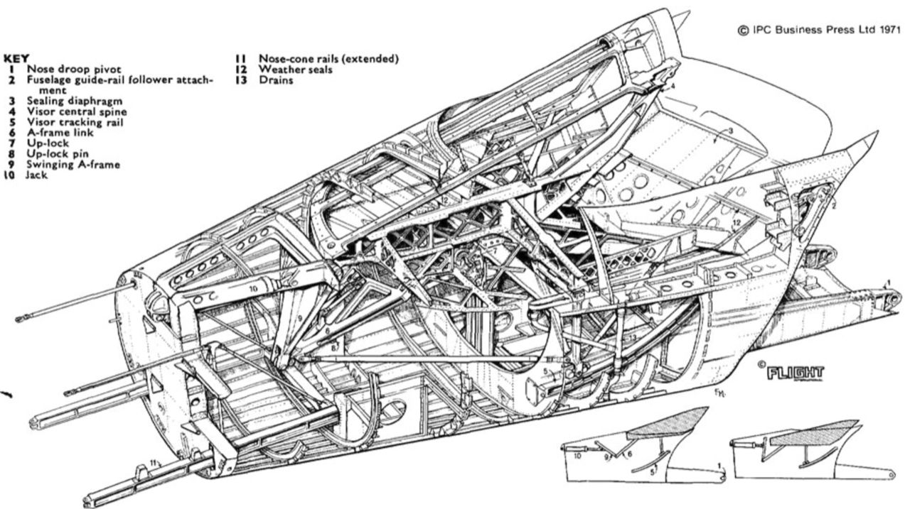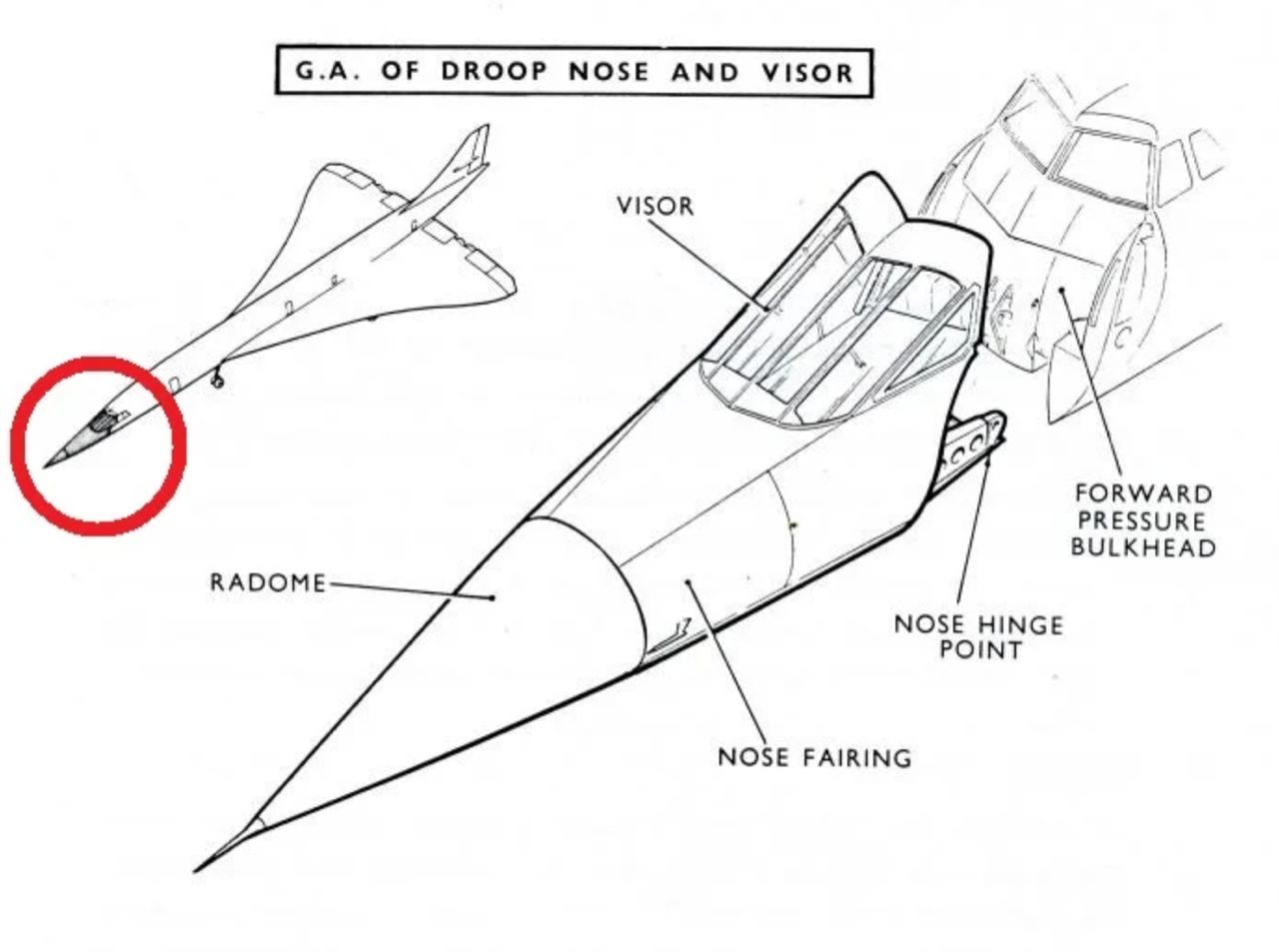 ปีกสามเหลี่ยมแบบโอจีของ Concorde มีอัตราส่วนการยกต่อแรงต้านทานค่อนข้างน้อยที่ความเร็วต่ำ หากเครื่องบินต้องบินด้วยความเร็วต่ำในช่วงการร่อนลงจอด เครื่องบินจะต้องบินด้วยการเปิดมุมปะทะสูงมาก จนส่วนหัวของเครื่องบดบังทัศนวิสัยของนักบิน (ระหว่างที่ร่อนลงจอด ตำแหน่งที่นั่งของนักบินจะอยู่สูงกว่าส่วนท้ายของตัวเครื่องกว่า 36ฟุตจากการเปิดมุมปะทะที่สูงมาก) ไวเซ่อร์ (visor)ที่ส่วนหัวจึงถูกออกแบบมาเพื่อสามารถปรับลดมุมลงได้ด้วยระบบไฮดรอลิค ในการบินทดสอบเครื่องต้นแบบ ส่วนหัวของตัวเครื่องบินจะสามารถปรับมุมลดลงได้ถึง 17.5 องศาแต่มุมที่หมาะสมสำหรับการปรับส่วนหัวเพื่อเพิ่มทัศนวิสัยของนักบินให้ อยู่ที่มุม 12.5 องศา การร่อนลงจอดของเครื่องบิน Concorde นั้นตัวเครื่องบินจะมีมุมปะทะสูงถึง 22องศา หากนักบินกำลังทำการร่อนลงจอดโดยมีความสูงจากพื้นดิน 100 ฟุต นักบินจะสามารถมองเห็นพื้น หรือระบบไฟบนรันเวย์ในระยะทางประมาณ 500 ฟุตท่านั้นเนื่องจากส่วนหัวของเครื่องบดบังการมองเห็นแม้นักบินจะทำการปรับ ไวเซ่อร์ช่วยแล้วก็ตาม นักบินที่บินกับเครื่อง Concorde ทุกนายจะต้องได้รับการฝึกในการปรับเปลี่ยนมุมส่วนหัวให้เกิดความชำนาญ ในสภาพการร่อนลงจอดที่จะแตกต่างไปจากเครื่องบินโดยสารแบบปกติก่อนที่จะขึ้น บินจริงกับเครื่อง Concorde