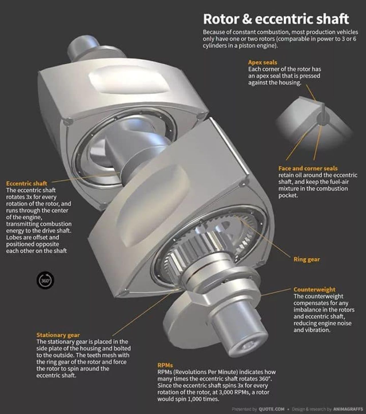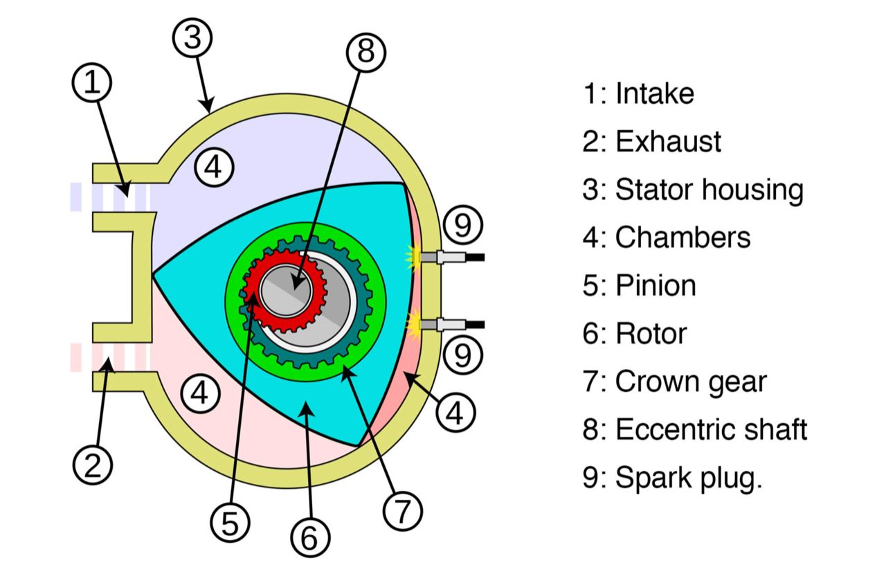 หลักการทำงานของเครื่องยนต์โรตารี ซึ่งไม่มีลูกสูบชัก ขึ้น-ลง เหมือนเครื่องยนต์ปกติ ไม่มีก้านสูบ ลิ้นและสปริงรวมถึงเพลาลูกเบี้ยวที่ค่อนข้างมีความเสถียรน้อยกว่าเมื่อทำงาน เครื่องยนต์โรตารีจึงเป็นเครื่องยนต์ที่มีห้องเผาไหม้แบบเดี่ยว ภายในห้องเผาไหม้ของเครื่องยนต์ชนิดนี้มีส่วนที่เคลื่อนไหวอยู่สองส่วนคือ โรเตอร์หรือลูกสูบทรงสามเหลี่ยมด้านเท่า ชิ้นส่วนอีกชิ้นคือแครงชาร์ฟที่อยู่ในโรเตอร์ ปลายทั้งสามของโรเตอร์ จะหมุนไปรอบๆ ห้องเผาไหม้ ส่วนที่แบ่งออกเป็นสามส่วนของผนังสูบจะทำให้กำลังอัดของเครื่องโรตารี่เพิ่ม หรือลด แล้วแต่การหมุนของโรเตอร์ว่าอยู่ในตำแหน่งใด