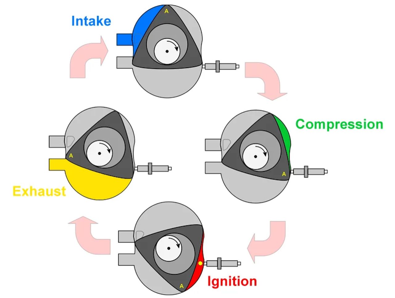 จังหวะของการหมุนในสเตปถัดไป ก็จะหมุนเวียนไปเข้าสู่จังหวะดูดอีกครั้ง ต่อเนื่องวนเวียนอยู่แบบนี้จนกว่าเชื้อเพลิงในถังจะหมดลง เช่นเดียวกับวัฏจักรการทำงานของเครื่องยนต์สูบเรียงแบบ 4 จังหวะ แต่เครื่องยนต์แบบโรตารีของ Mazda RX-8 จะใช้การทำงานของลูกสูบแบบสามเหลี่ยมที่หมุนเป็นวงกลมภายในผนังกระบอกสูบรูปทรงรี การหมุนของลูกสูบในเครื่องโรตารีจำนวน 1 รอบ จะได้กำลังจากการระเบิดถึง 3 ครั้ง ในขณะที่เครื่องยนต์แบบสูบเรียงจะต้องหมุนถึง 2 รอบ แล้วสร้างกำลังได้แค่ครั้งเดียว