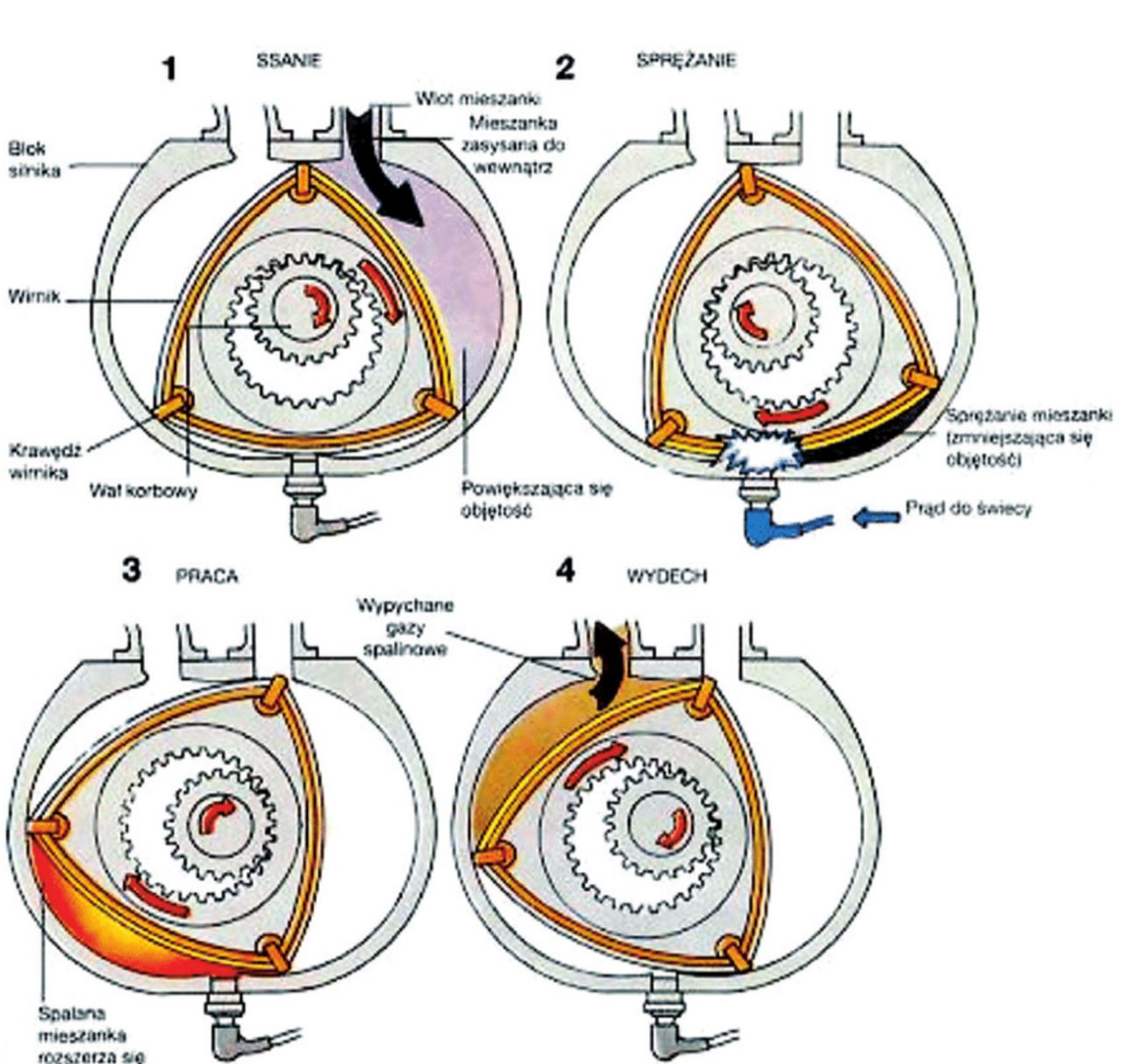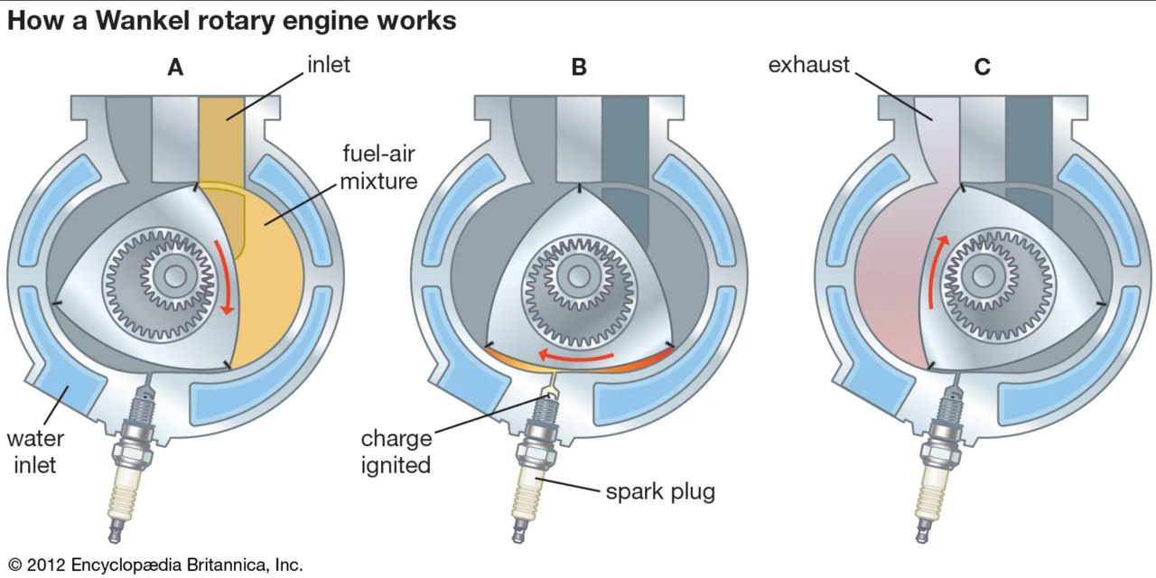 หลังจากไอดีถูกดูดผ่านเข้ามาทางพอร์ตไอดีเป็นการทำงานในสเตปแรกแล้ว สเตปที่สอง-รูปทรงของผนังกระบอกสูบจะบังคับให้ไอดีดังกล่าวถูกบีบอัดลด พื้นที่ลง สเต็ปที่สาม เมื่อไอดีถูกบีบอัดจนร้อนและมีความดันสูงขึ้น มันจะระเบิดด้วยการจุดประกายไฟจากหัวเทียน 2 ตำแหน่ง แรงระเบิดจะเป็นแรงผลักดันให้ลูกสูบหมุนเคลื่อนที่ต่อไป จนกระทั่งไอเสียที่เกิดขึ้นจากการสันดาปผ่านพอร์ตไอเสียออกไปสู่บรรยากาศ หรือที่ช่างเครื่องยนต์เรียกกันทั่วไปว่า จังหวะคายนั่นเอง