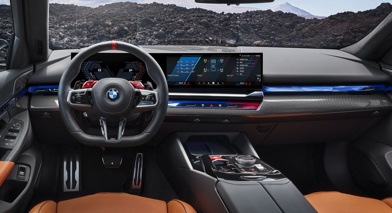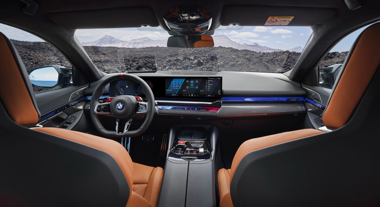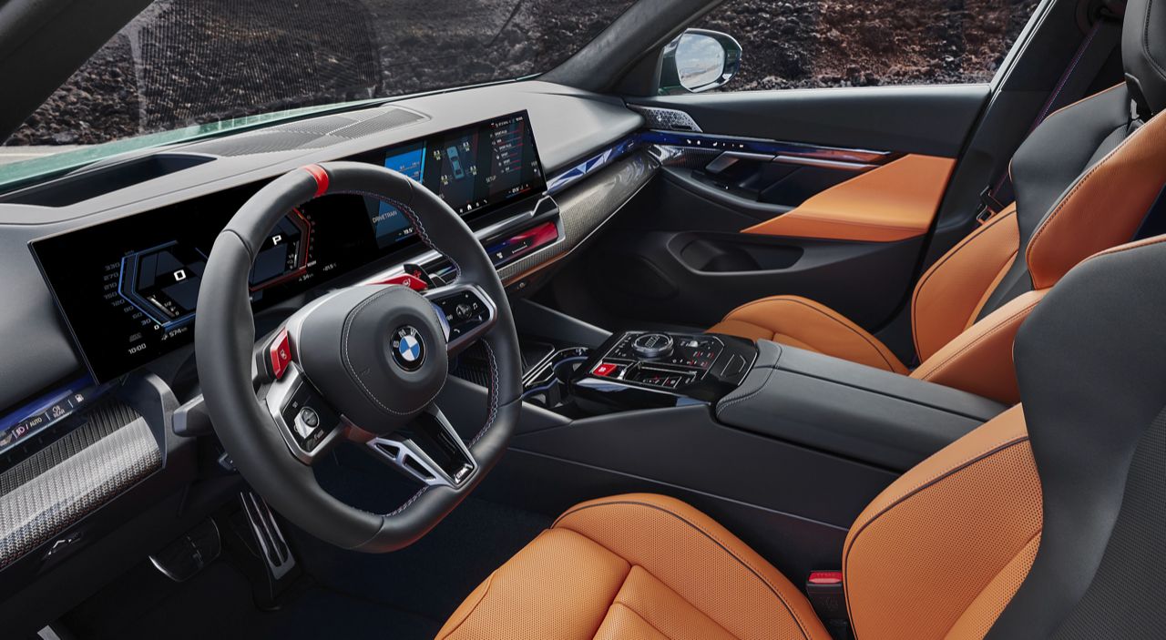 ภายใน M5 มาพร้อมพวงมาลัยหนัง M ดีไซน์ใหม่ทรงฐานตัด ปุ่ม M แบบมีไฟส่องสว่าง เบาะนั่ง M multifunction จอแสดงผลโค้ง BMW Curved Display รองรับการแสดงข้อมูลเฉพาะสำหรับรถยนต์ตระกูล M ระบบควบคุม BMW iDrive เวอร์ชันอัปเกรด สั่งงานผ่านการสัมผัสและการสั่งด้วยเสียง เบาะหนัง Merino ระบบควบคุม BMW Interaction Bar ระบบปรับอากาศแบบ 4 โซน และชุดไฟห้องโดยสารที่ออกแบบมาพิเศษสำหรับรถยนต์ตระกูล M ระบบเสียง Bowers & Wilkins Surround Sound แท่นชาร์จไร้สาย ระบบ Comfort Access และระบบเปิด-ปิดฝากระโปรงท้ายอัตโนมัติ