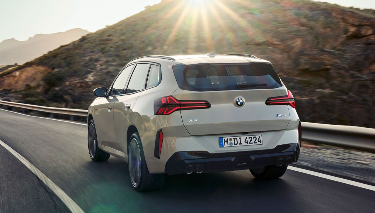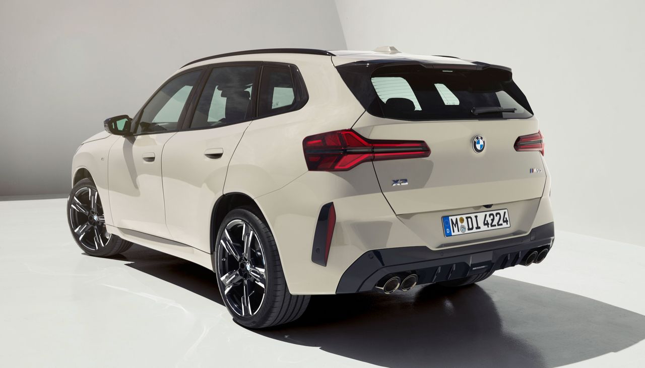 ด้านข้าง สเกิร์ตและแนวหลังคาทอดยาวไปยังส่วนท้าย ซุ้มล้อหลังขนาดใหญ่ทำให้ดูกว้างขึ้น กระจกหลังล้อมกรอบด้วยสปอยเลอร์บนหลังคาและที่บังลมด้านข้าง X3 20d xDrive M Sport Pro ซ่อนปลายท่อไอเสียไว้ในกันชนท้าย ล้ออัลลอย M ขนาด 20 นิ้ว Double spoke แบบสลับสี สำหรับล้อของ X3 M50 xDrive เป็นล้ออัลลอย M ขนาด 21 นิ้ว ลาย Star spoke แบบสลับสี ชุดท่อไอเสียคู่ทั้งด้านซ้ายและขวา