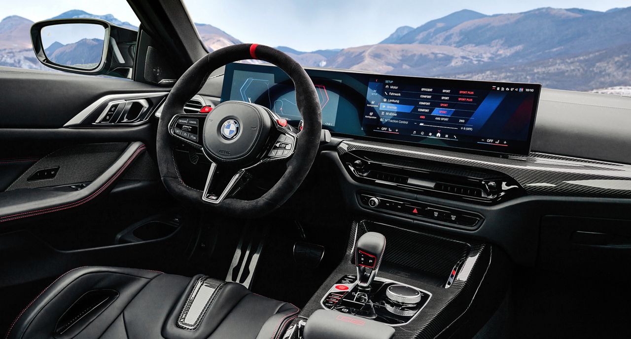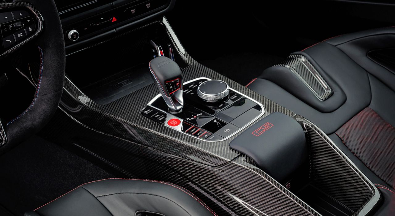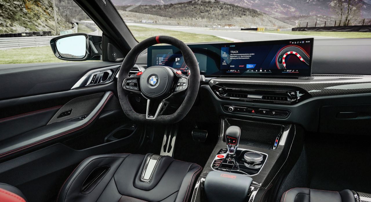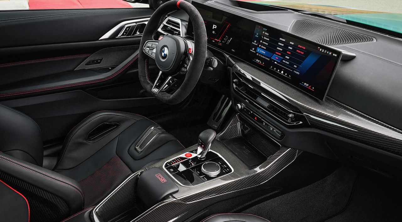M4 CS ติดตั้ง พวงมาลัย M Alcantara แบบสามก้านฐานตัด เครื่องหมายสีแดงแทนจุดกึ่งกลางของพวงมาลัย แป้นเปลี่ยนเกียร์ทำจาก CFRP เบาะนั่ง M Carbon bucket seat หุ้มด้วยหนัง Merino สีดำตัดกับตะเข็บสีแดง เข้ากับโทนสีดำ-แดงในส่วนอื่นๆ ของห้องโดยสาร โลโก้ “CS” สีแดงที่คอนโซลกลาง ป้ายอักษร “M4 CS” ที่ขอบประตูรถ เข็มขัดนิรภัยแบบ M แต่งแถบสี M เพดานสีดำ Anthracite แต่งพื้นผิวภายในห้องโดยสารด้วยคาร์บอนไฟเบอร์