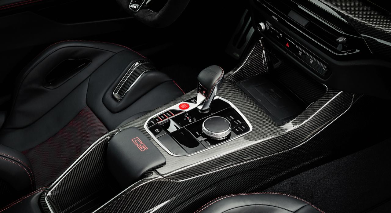 ห้องโดยสารใช้วัสดุ CFRP ในหลายจุด ทั้งบริเวณคอนโซลกลาง แป้นเปลี่ยนเกียร์ องค์ประกอบตกแต่งพื้นผิวภายในต่าง ๆ หรือแม้แต่โครงสร้างของเบาะนั่งแบบ M Carbon M4 CS ใหม่ มีน้ำหนักน้อยกว่า M4 Competition Coupe M xDrive ราว 15 กิโลกรัม
