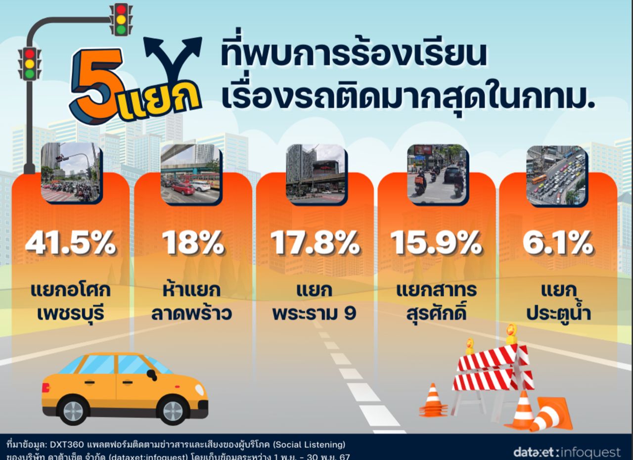 บริษัท ดาต้าเซ็ต จำกัด ได้ทำการสำรวจการกล่าวถึงแยกจราจรในกรุงเทพมหานครที่สร้างปัญหาต่อการเดินทางมากที่สุด ผ่านทางการแสดงความคิดเห็นของชาวโซเชียล ในช่วงวันที่ 1-30 พฤศจิกายน 2567 โดยใช้เครื่องมือวิเคราะห์ข้อมูล DXT360 ซึ่งเป็นระบบติดตามและรวบรวมข้อมูลแบบครบวงจร ครอบคลุมทั้งโซเชียลมีเดียและสื่อดั้งเดิม (เว็บไซต์ข่าว โทรทัศน์ วิทยุ หนังสือพิมพ์ และนิตยสาร) พบ 5 แยกที่มีการร้องเรียนเรื่องรถติดมากที่สุดในกรุงเทพฯ