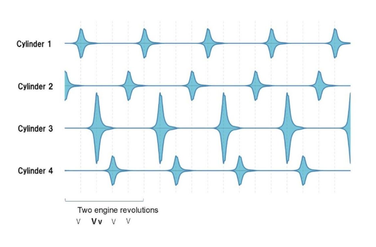 เมื่อพล็อตการกระจายของเสียงที่ปล่อยออกมาจากรอบการดูด อัด ระเบิดและคาย การระบายไอเสียของเครื่องยนต์ การเผาไหม้ในเครื่องยนต์ลูกสูบ เกิดขึ้นหนึ่งครั้งต่อกระบอกสูบทุกๆ สองรอบของเพลาข้อเหวี่ยง การหมุนของเพลาข้อเหวี่ยงสร้างพัลส์ (แรงสั่นสะเทือน) ที่ส่งถึงหูของมนุษย์ในรูปของเสียง