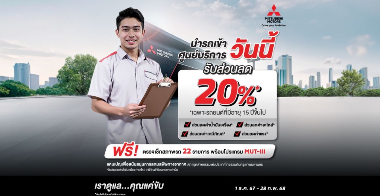 บริษัท มิตซูบิชิ มอเตอร์ส (ประเทศไทย) จำกัด มอบแคมเปญสุดพิเศษ รถเก่า เราก็ดูแล สำหรับลูกค้ารถยนต์มิตซูบิชิทุกรุ่นที่มีอายุ 15 ปีขึ้นไปด้วยข้อเสนอพิเศษสำหรับลูกค้าที่นำรถเข้าตรวจเช็กที่ศูนย์บริการมิตซูบิชิทั่วประเทศ ส่วนลดร้อยละ 20 สำหรับค่าแรง ค่าอะไหล่ และค่าเคมีภัณฑ์ ที่ร่วมรายการพร้อมฟรี เช็กรถ 22 รายการ และตรวจเช็กด้วยเครื่อง MUT-IIIเฉพาะรถยนต์มิตซูบิชิที่มีอายุ 15 ปีขึ้นไป ณ ศูนย์บริการมาตรฐานของผู้จำหน่ายรถยนต์มิตซูบิชิทั่วประเทศ ตั้งแต่วันนี้ ถึง 28 กุมภาพันธ์ พ.ศ. 2568
