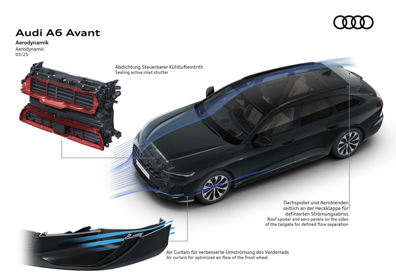 ปฏิเสธไม่ได้ว่า A6 Avant นั้นใช้การออกแบบยุคใหม่ โดย มีรูปลักษณ์ที่เรียบเนียนมาก ไม่ใช่รถสเตชันแวกอนทรงกล่องทั่วไป Audi มั่นใจว่า A6 Avant ใหม่ จะเป็นรถสเตชันแวกอนหลังคายาวที่ขับเคลื่อนด้วยเครื่องยนต์สันดาปภายในที่มีระบบอากาศพลศาสตร์อากาศหรือแอร์โรไดนามิกส์ดีที่สุด โดยมีค่าสัมประสิทธิ์แรงเสียดทานอากาศอยู่ที่ 0.25 cd สำหรับบริบทในการปรับแต่งรูปลักษณ์ภายนอกแล้ว รถสเตชันแวกอนเพียงแค่รุ่นเดียวที่มีตัวเลขค่าสัมประสิทธิแรงเสียดทานอากาศเหนือกว่าก็คือ A6 E-Tron Avant ไฟฟ้า ซึ่งมีค่าสัมประสิทธิ์แรงเสียดทานอากาศอยู่ที่ 0.24 cd