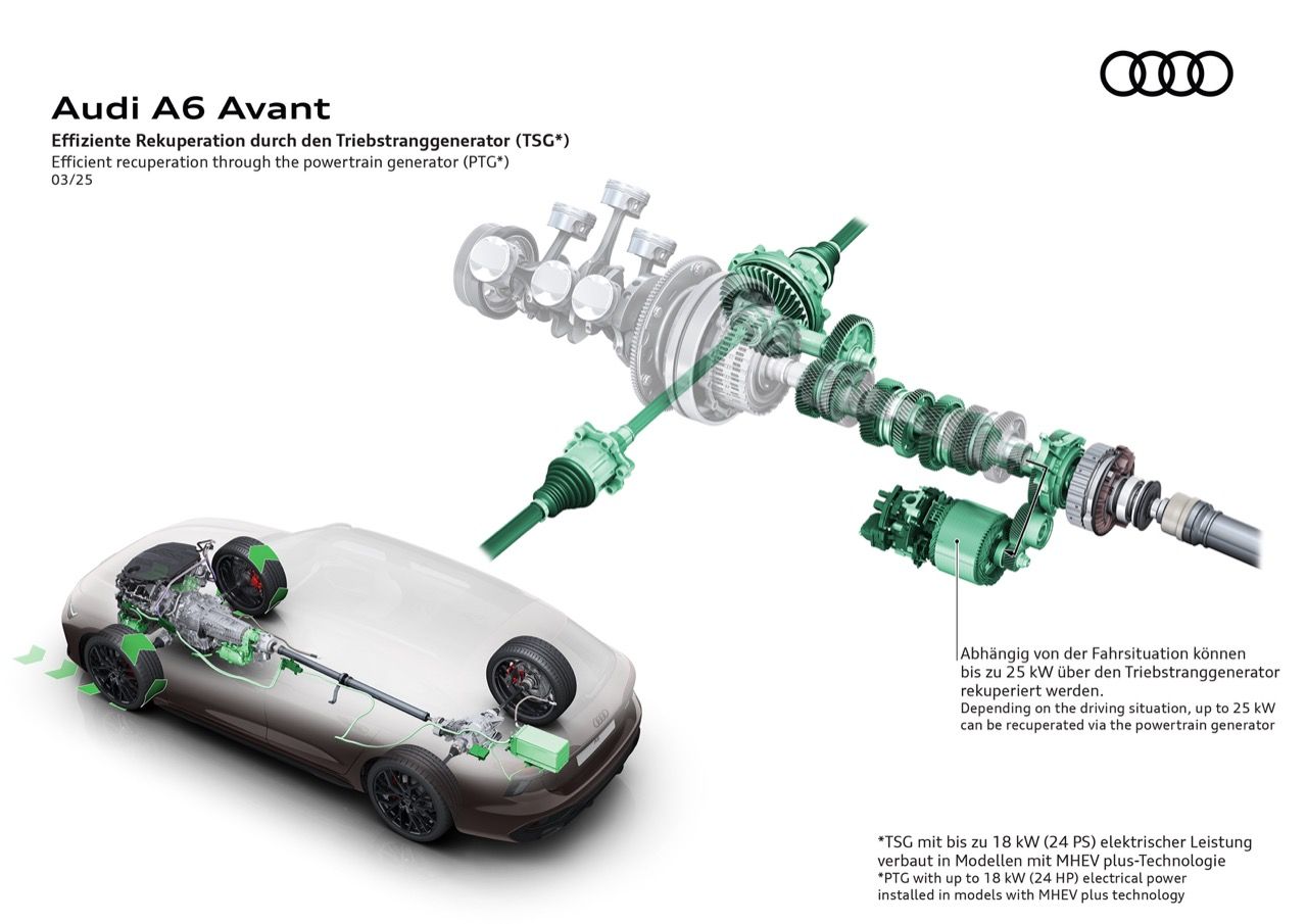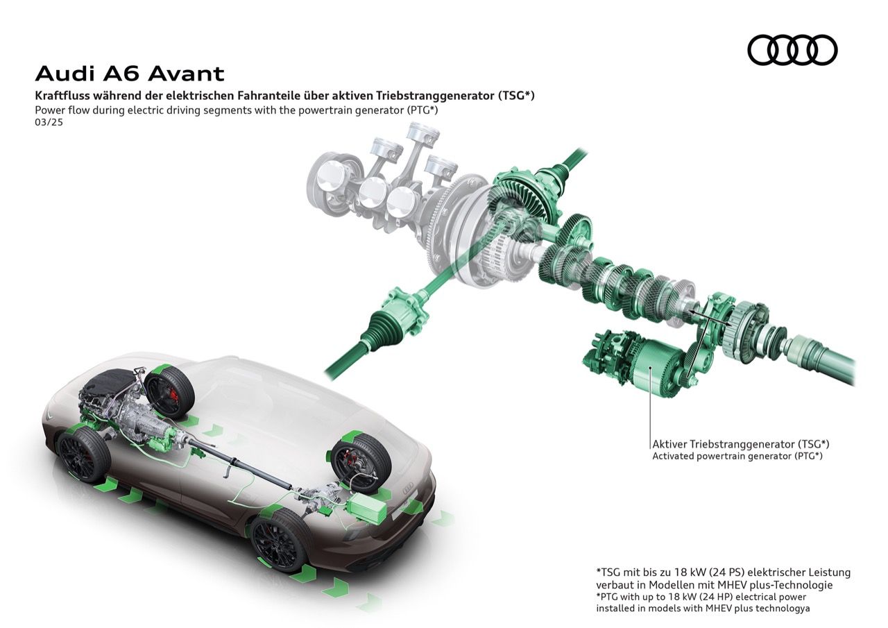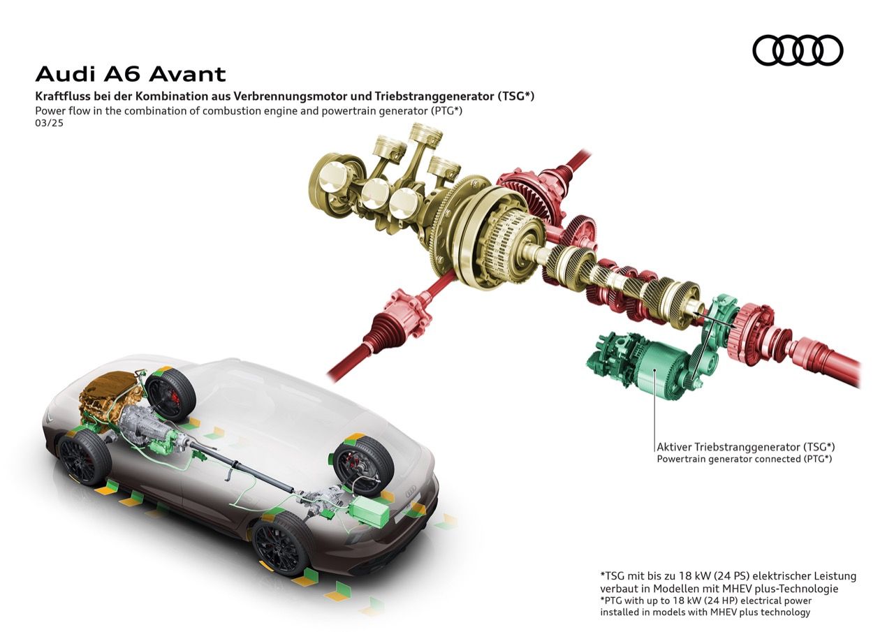 เครื่องยนต์มีระบบ MHEV Plus ประกอบด้วยแบตเตอรี่ 48 โวลต์ สตาร์ทเตอร์ไดชาร์จแบบสายพาน และมอเตอร์ไฟฟ้า/เครื่องกำเนิดไฟฟ้า เมื่อเร่งเต็มที่ มอเตอร์ไฟฟ้าให้กำลังเพิ่มเติม 24 แรงม้า (18 กิโลวัตต์ / 24 PS) แรงบิด 230 นิวตันเมตร (170 ปอนด์-ฟุต) พร้อมทั้งใช้ regenerative braking เพื่อชาร์จแบตเตอรี่ขนาดเล็ก ช่วยให้ A6 Avant ขับเคลื่อนด้วยพลังงานไฟฟ้าเพียงอย่างเดียวในระหว่างการเคลื่อนที่ด้วยความเร็วต่ำ เช่น การจอดรถหรือคลานไปตามการจราจรในเมือง นอกจากนี้ A6 Allroad ยกสูงสไตล์ครอสโอเวอร์ และ RS6 Avant จะกลับมาอีกครั้งในเจเนอเรชันใหม่ แม้ว่าอาจจะตัดเครื่องยนต์ V8 ออก แล้วเปลี่ยนเป็นเครื่องยนต์ V6 แบบปลั๊กอินไฮบริด