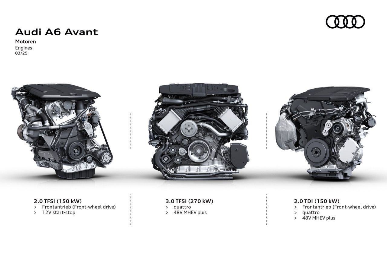 หัวใจของระบบขับเคลื่อน แน่นอนว่าสอดคล้องกับความมุ่งมั่นของ Volkswagen AG ที่มีต่อเครื่องยนต์สันดาปภายใน นั่นก็คือ การไปต่อกับรถเครื่องทั้งดีเซลหรือเบนซิน A6 Avant ใหม่ มีระบบส่งกำลังให้เลือกทั้งเบนซินและดีเซล ได้แก่ เครื่องยนต์เบนซิน 2.0 TFSI สี่สูบ เครื่องยนต์ดีเซล 2.0 TDI สี่สูบ ทั้งสองรุ่นให้กำลังเท่ากันที่ 201 แรงม้า (150 กิโลวัตต์ / 204 PS) นอกจากนี้ยังมีเครื่องยนต์เบนซิน 3.0 TFSI หกสูบ ให้กำลัง 362 แรงม้า (270 กิโลวัตต์ / 367 PS)