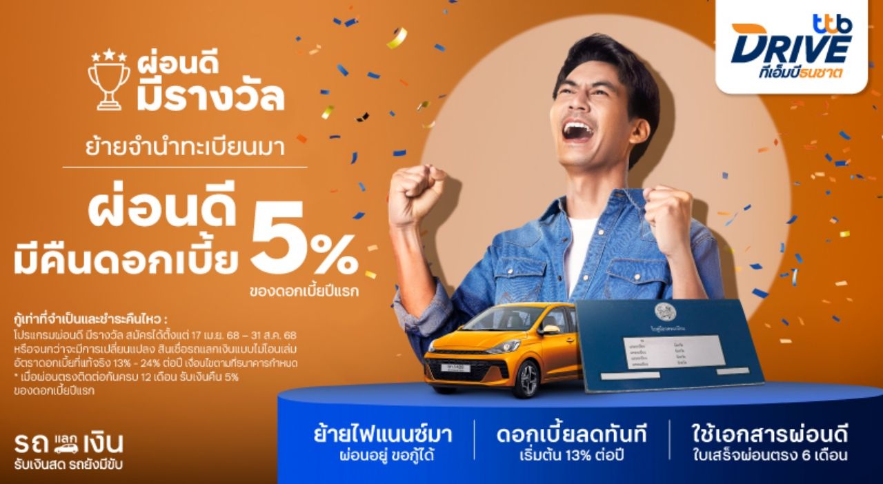 ทีทีบีเปิดรีไฟแนนซ์จำนำทะเบียนรถ : ทีทีบี ตอกย้ำแนวคิด เปลี่ยนความเชื่อ…เพื่อชีวิตทางการเงินที่ดีขึ้น จึงเปิดทางเลือกใหม่สำหรับผู้ที่ผ่อนดี และต้องการรีไฟแนนซ์จำนำทะเบียนรถมาอยู่กับทีทีบี ด้วย สินเชื่อรถแลกเงิน แบบไม่โอนเล่ม พร้อมสิทธิพิเศษจากโปรแกรม ผ่อนดี มีรางวัล มากถึง 4 ต่อ เริ่มด้วย ต่อที่ 1 ดอกเบี้ยลดลงทันที เริ่มต้นเพียง 13% ต่อปี ต่อที่ 2 รับเงินคืน 5% ของดอกเบี้ยปีแรก สำหรับลูกค้าที่ผ่อนดีครบ 12 เดือน ต่อที่ 3 เอกสารผ่อนดี หรือใบเสร็จของสัญญาเดิมต่อเนื่อง 6 เดือน เพื่อช่วยให้สมัครง่ายขึ้น ไม่ต้องเริ่มใหม่ทั้งหมด ลดขั้นตอน ลดความยุ่งยาก เรียกได้ว่าเป็นการคืนกำไรให้กับผู้ที่มีวินัยทางการเงินอย่างแท้จริง