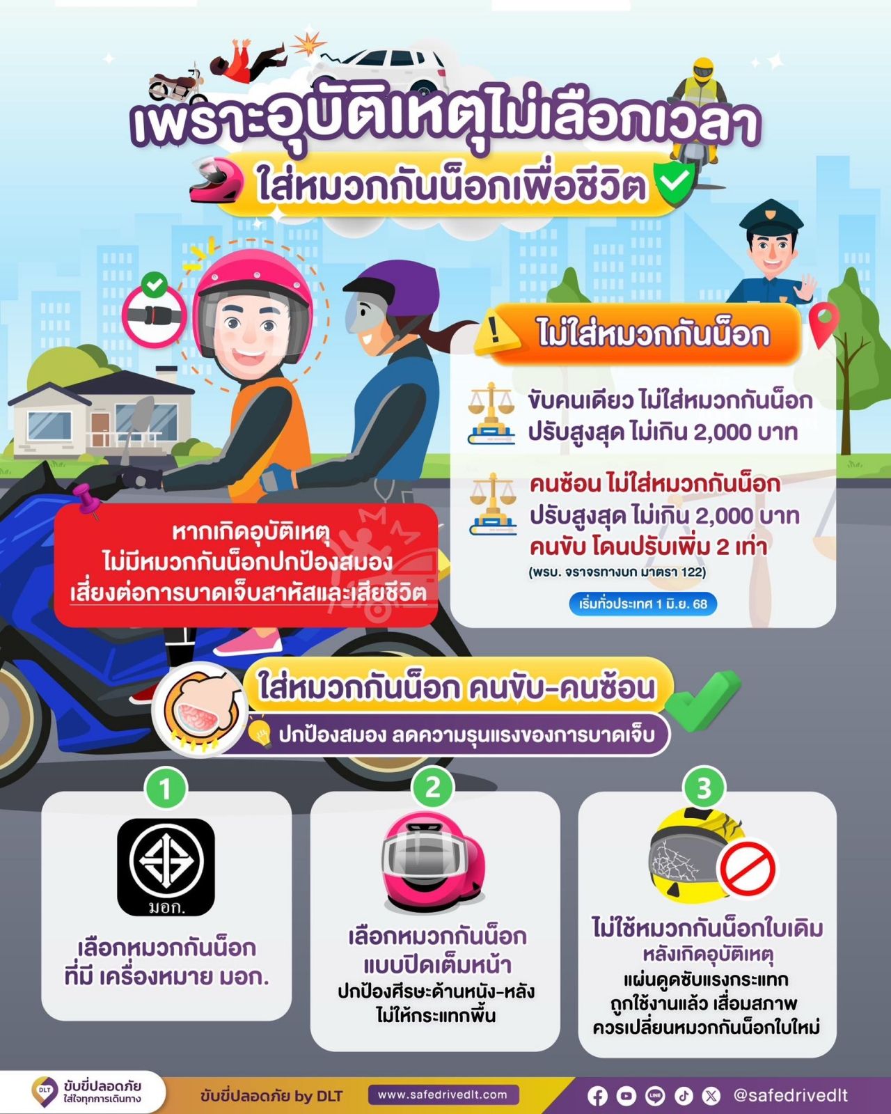 อย่างไรก็ตาม หากไม่สวมใส่หมวกกันน็อก ต้องพึงระวังโทษตาม พ.ร.บ. จราจรทางบก มาตรา 122 ที่เริ่มบังคับใช้เมื่อวันที่ 1 มิถุนายน 2568 พร้อมกันทั่วประเทศ ดังนี้