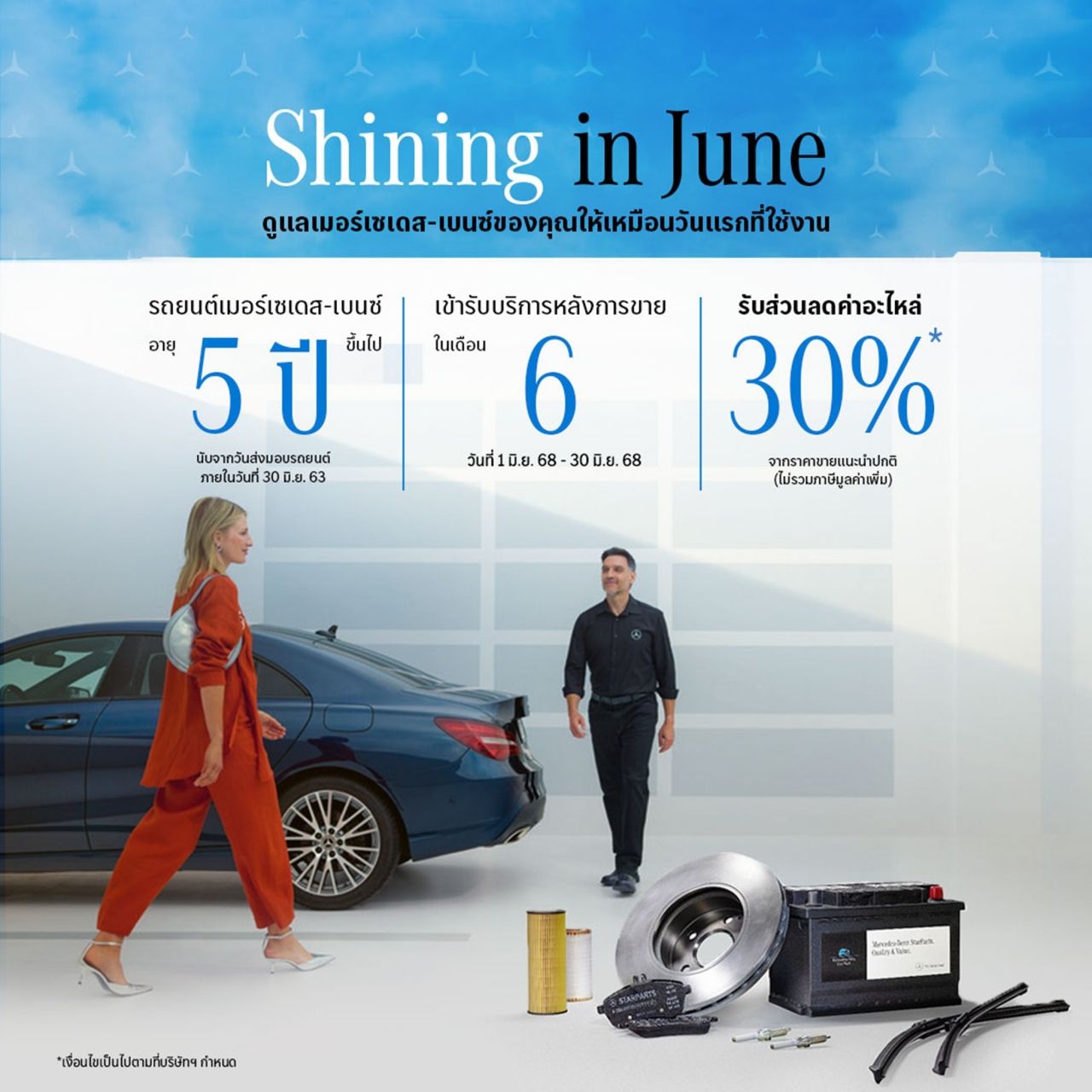 ลดค่าอะไหล่ 30% : เมอร์เซเดส-เบนซ์ (ประเทศไทย) ให้ความสำคัญในการดูแลลูกค้าที่ใช้รถยนต์มากกว่า 5 ปี ให้คงสภาพการใช้งานให้เหมือนวันแรกที่ใช้งาน เพื่อตอบแทนความไว้วางใจของลูกค้าที่เข้ารับบริการอย่างต่อเนื่อง ด้วยแคมเปญ Shining in June มอบสิทธิพิเศษให้กับเจ้าของรถยนต์เมอร์เซเดส-เบนซ์ ทุกรุ่น (รวมถึงรถ Van) ที่มีอายุการใช้งานมากกว่า 5 ปี (นับจากวันส่งมอบรถยนต์ภายในวันที่ 30 มิถุนายน 2563) รับส่วนลดค่าอะไหล่ 30% จากราคาขายแนะนำปกติ (ไม่รวมภาษีมูลค่าเพิ่ม)
