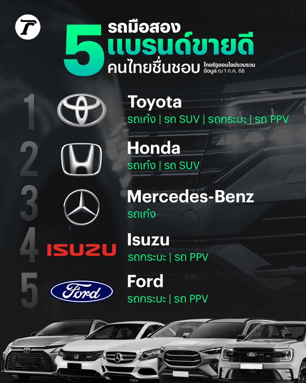 ส่องรถมือสอง 5 แบรนด์ขายดี คนไทยชื่นชอบมีทั้งรถเก๋ง รถกระบะ และ PPV แม้รถมือสองจะราคาสูงขึ้น 10-15% เนื่องจากรถที่มีคุณภาพสูงในตลาดเริ่มมีจำนวนจำกัด