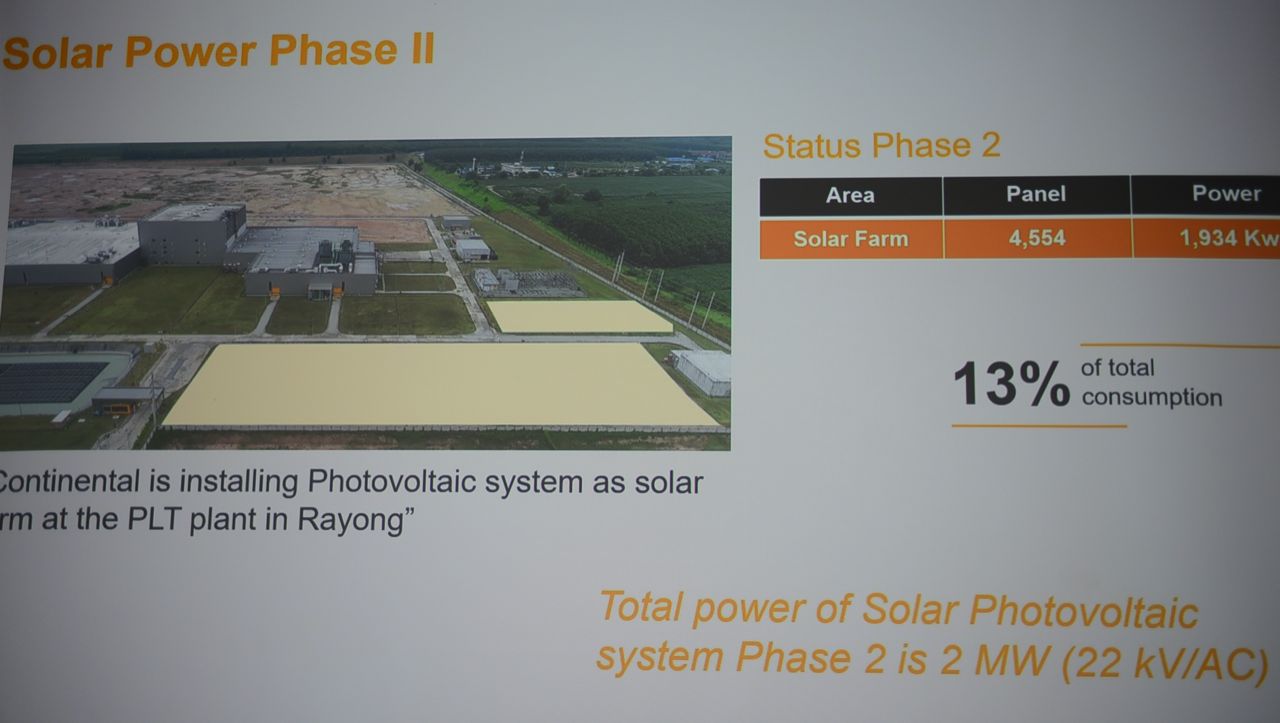 โครงการริเริ่มด้านการประหยัดพลังงานของ Continental ถูกนำมาปรับใช้ในกระบวนการผลิตของโรงงานยางที่จังหวัดระยอง ในปี 2566 โรงงานแห่งนี้ มีการขยายกําลังการผลิตไฟฟ้าด้วยหลังคาโซลาร์เซลล์ มากถึง 4.2 เมกะวัตต์ ซึ่งมีกําลังการผลิตไฟฟ้าโซลาร์เซลล์เพิ่มขึ้นประมาณ 2.5 เมกะวัตต์ ปัจจุบัน แผงโซลาร์เซลล์ที่ติดตั้งอยู่ในโรงงานสามารถจ่ายไฟฟ้าได้ทั้งหมด 13% ของไฟฟ้าที่จําเป็นในกระบวนการผลิต