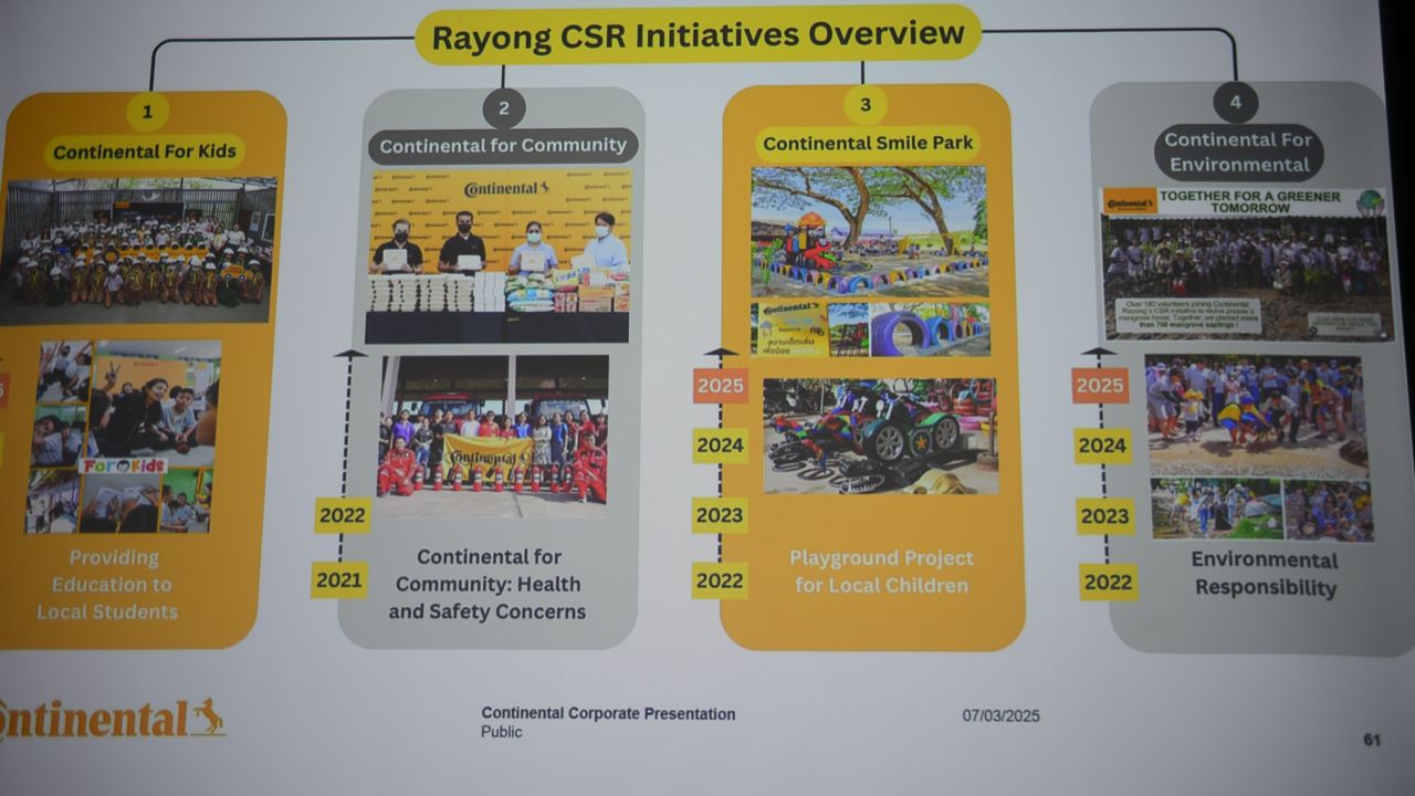 Continental ยังสนับสนุนชุมชนท้องถิ่นผ่านโครงการ และกิจกรรมต่างๆ มากมาย ไม่ว่าจะเป็น โครงการด้านความปลอดภัย ด้านสุขภาพ ด้านคุณภาพชีวิต และการศึกษา เช่น การปลูกต้นไม้ การปรับปรุงสนามเด็กเล่นในโรงเรียน การสร้างความตระหนักรู้ การให้ความรู้เกี่ยวกับความปลอดภัย การแยกขยะ และเรื่องสุขอนามัยขั้นพื้นฐาน สำหรับโรงเรียนในพื้นที่จังหวัดระยอง.