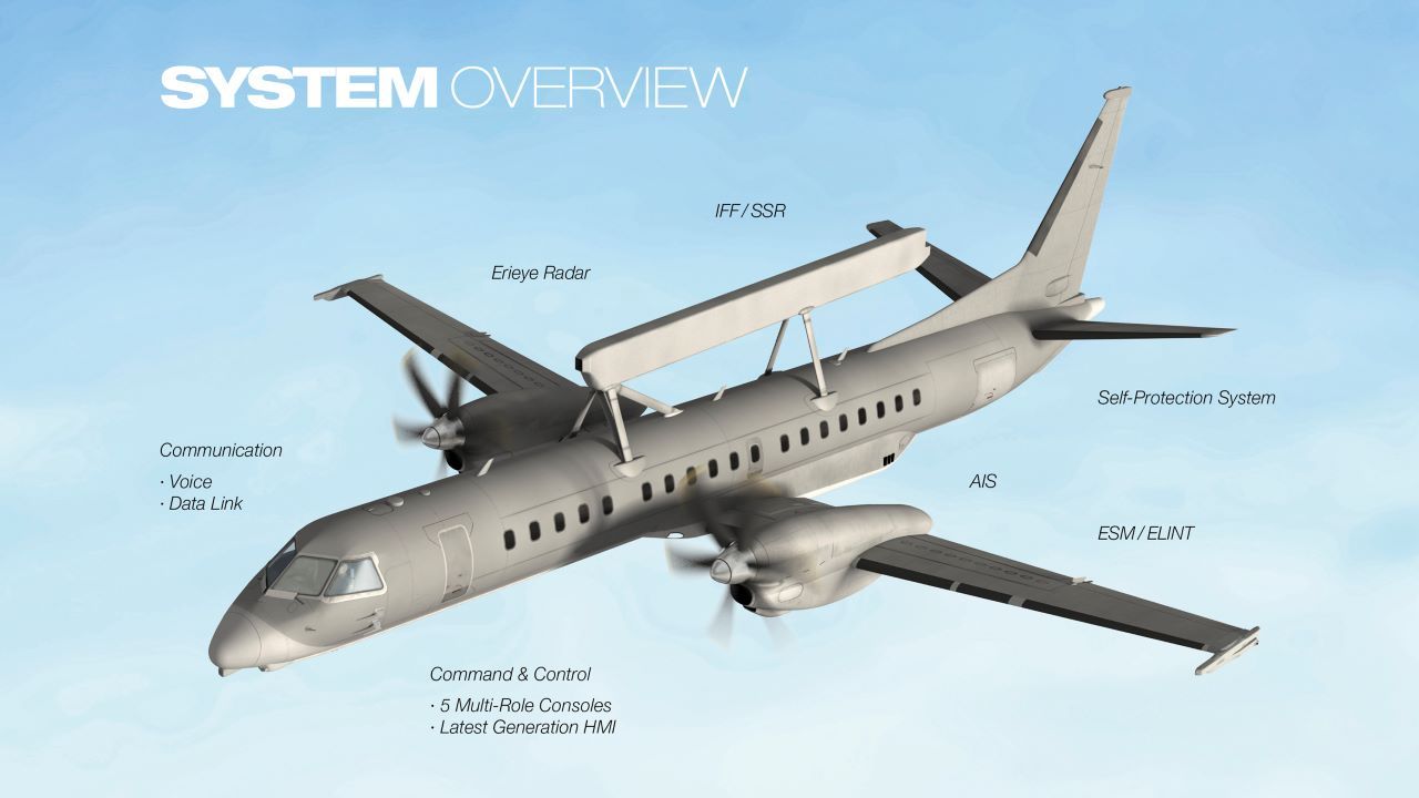 Saab 340 AEW ใช้เรดาร์ Phased Array แบบ SLAR (Side-Looking Airborne Radar รุ่น PS-890 Erieyes ของอิริคสัน ทำงานย่านความถี่ 2-4GHz (นาโต้ E/F แบนด์ หรือ อเมริกัน S-แบนด์) ความยาว 9 ม. หนัก 900 กก. ใน 1 ระบบ ประกอบด้วยจานสายอากาศ 2 จาน ในแต่ละด้านประกอบไปด้วยโมดูลตรวจจับ 200 โมดูล ซึ่งให้การครอบคลุมทางข้าง ด้านละ 150 องศา (ในทางปฎิบัติแล้ว ตรวจจับได้ 360 องศา แต่องศาการรับสัญญาณที่ชัดเจนที่สุดคือ 150 องศาในแต่ละด้าน โดยมีจุดอับสัญญาณคือ 30 องศาที่ด้านหัว และท้าย) เป็นเรดาร์แบบ Electronically Scanned Atenna ความสามารถในการตรวจจับ สามารถตรวจจับเป้าหมายขนาดเครื่องบินขับไล่ในสภาวะสงครามอิเล็คโทรนิคส์หนาแน่นได้ที่ระยะ 350 กม.+ ขึ้นอยู่กับหน้าตัดเรดาร์ ระบบอิเล็คโทรนิคส์อีกอย่าง คือ ระบบพิสูจน์ฝ่าย ทำงานที่ย่านความถี่ 2-18GHz (นาโต้ E-J แบนด์) พร้อมด้วยระบบวิทยุ และดาต้าลิงค์ แบบปลอดภัย ย่านความถี่ HF VHF UHF และดาต้าลิงค์ความเร็ว 4.8kbps ใช้ย่านความถี่ VHF/UHF อีกทั้งยังมีออปชั่น เพิ่มระบบ ESM ECM ECCM อีกด้วย