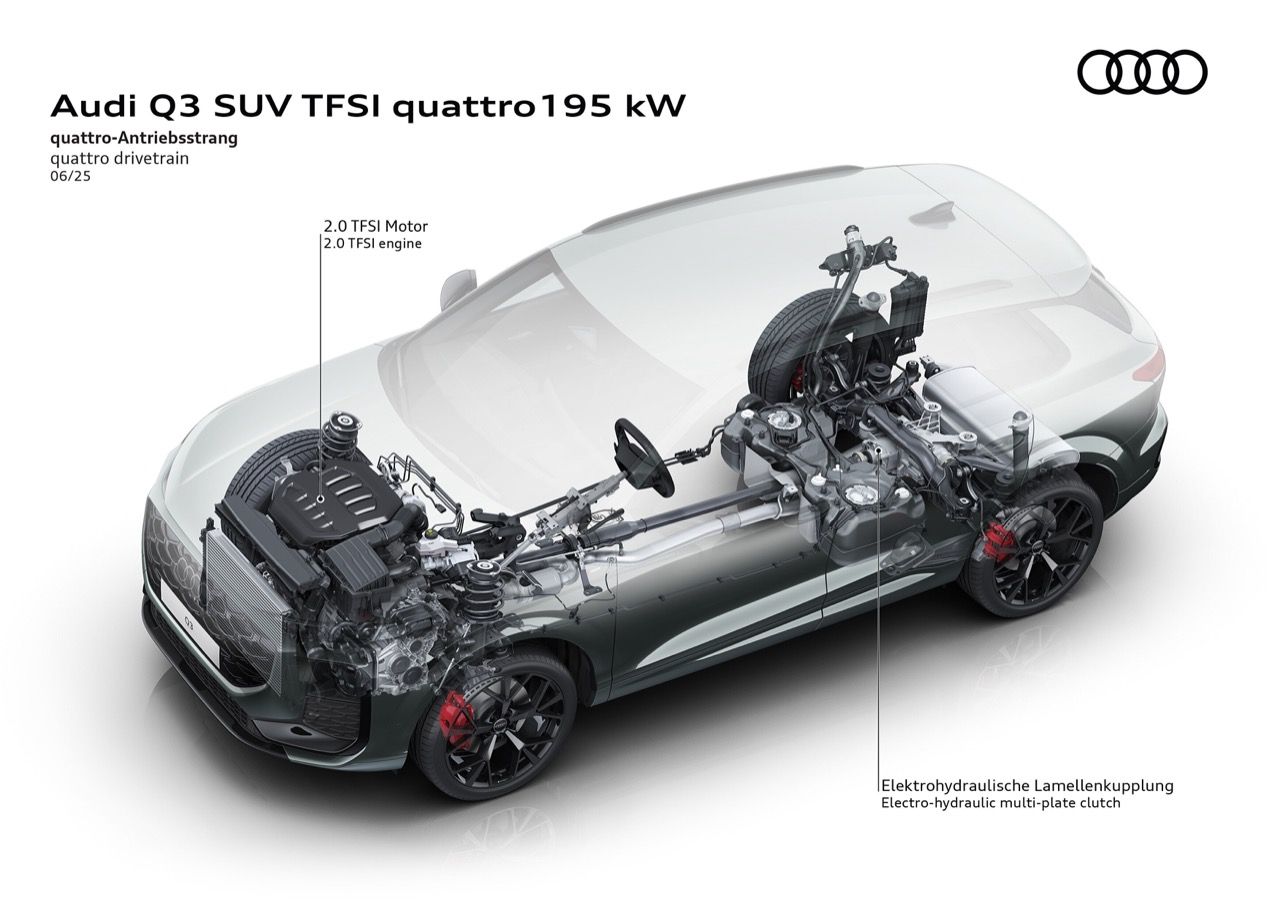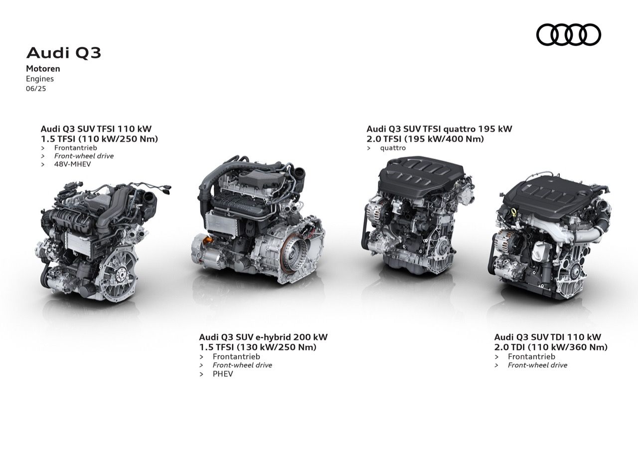 รุ่นเริ่มต้นในตระกูล Audi Q3 คือ Audi Q3 SUV TFSI 110 kW เครื่องยนต์เบนซินสี่สูบ เทคโนโลยี Mild-Hybrid กำลัง 150 แรงม้า ตามด้วย Audi Q3 TDI 110 kW เครื่องยนต์ดีเซลแถวเรียงสี่สูบ 150 แรงม้า สำหรับการขับทางไกล และ Audi Q3 e-hybrid 200 kW เครื่องยนต์เบนซินแถวเรียงสี่สูบ มอเตอร์ไฟฟ้าและแบตเตอรี่ปลั๊กอินไฮบริด กำลัง 270 แรงม้า รองรับการชาร์จไฟสูงสุด 50 kW ด้วยไฟฟ้ากระแสตรง ภายใต้สภาวะที่เหมาะสม แบตเตอรี่แรงดันสูง มีความจุรวม 25.7 kWh แบตเตอรี่แบบใหม่ให้ระยะทางวิ่งด้วยไฟฟ้าสูงสุด 119 กิโลเมตร (WLTP)